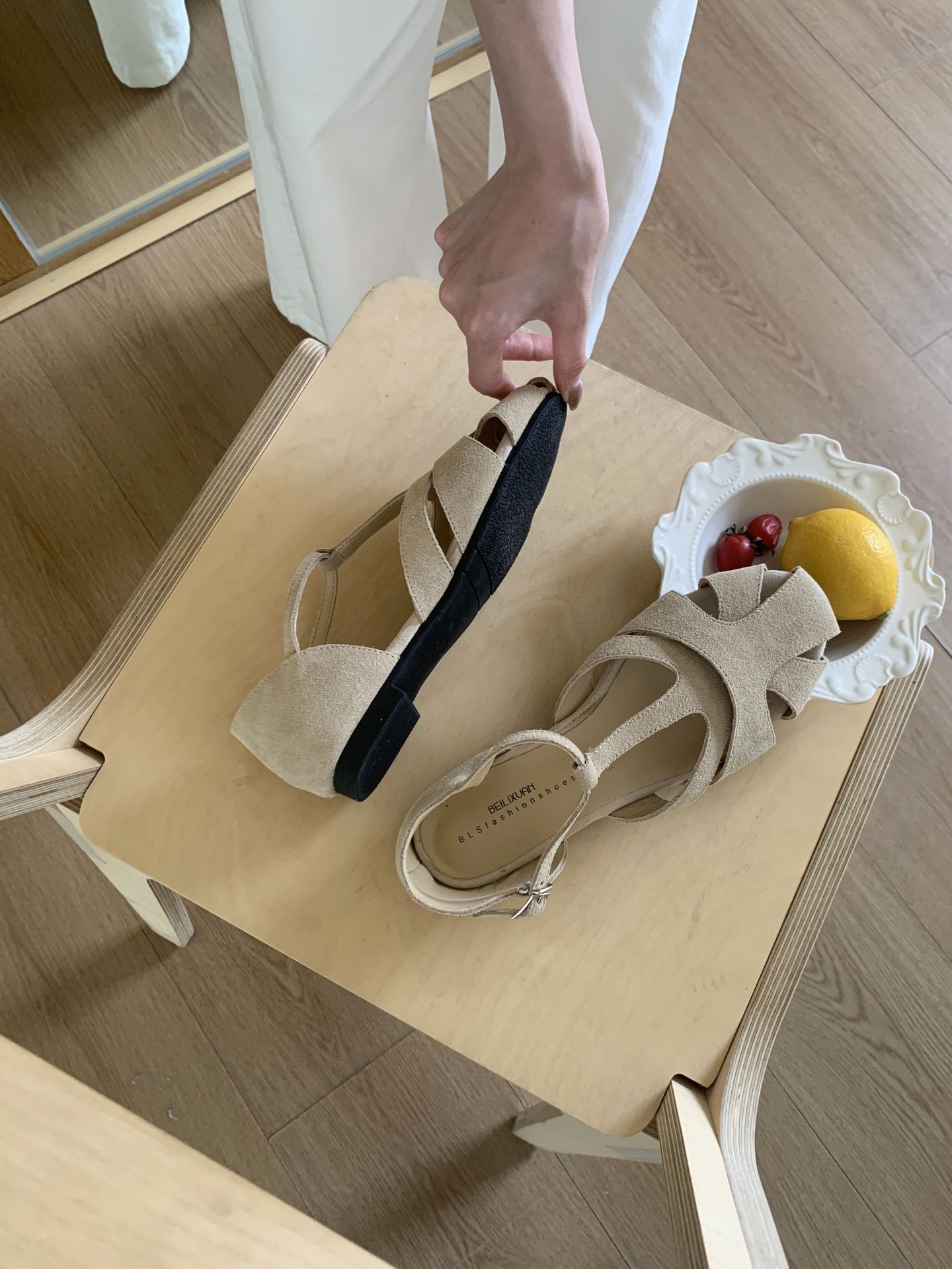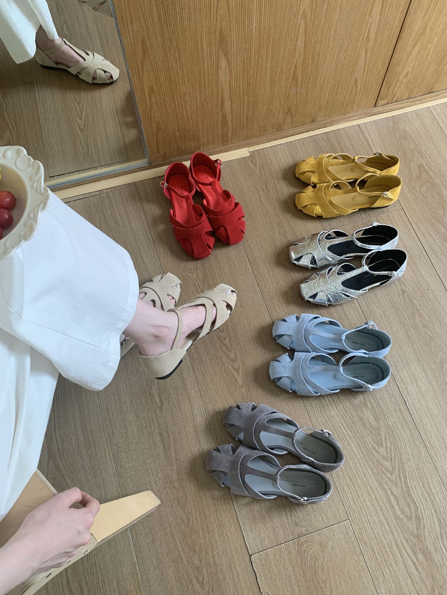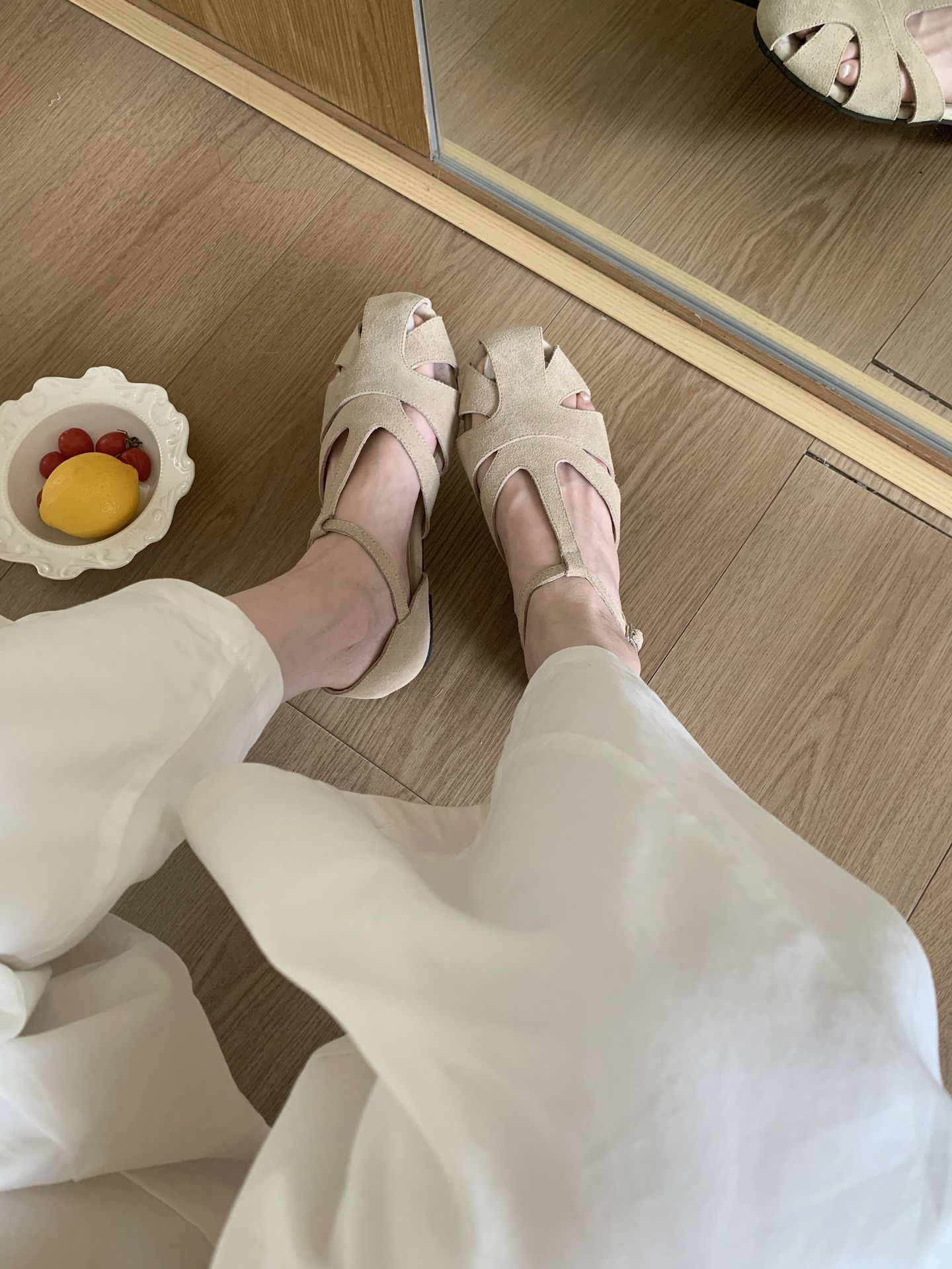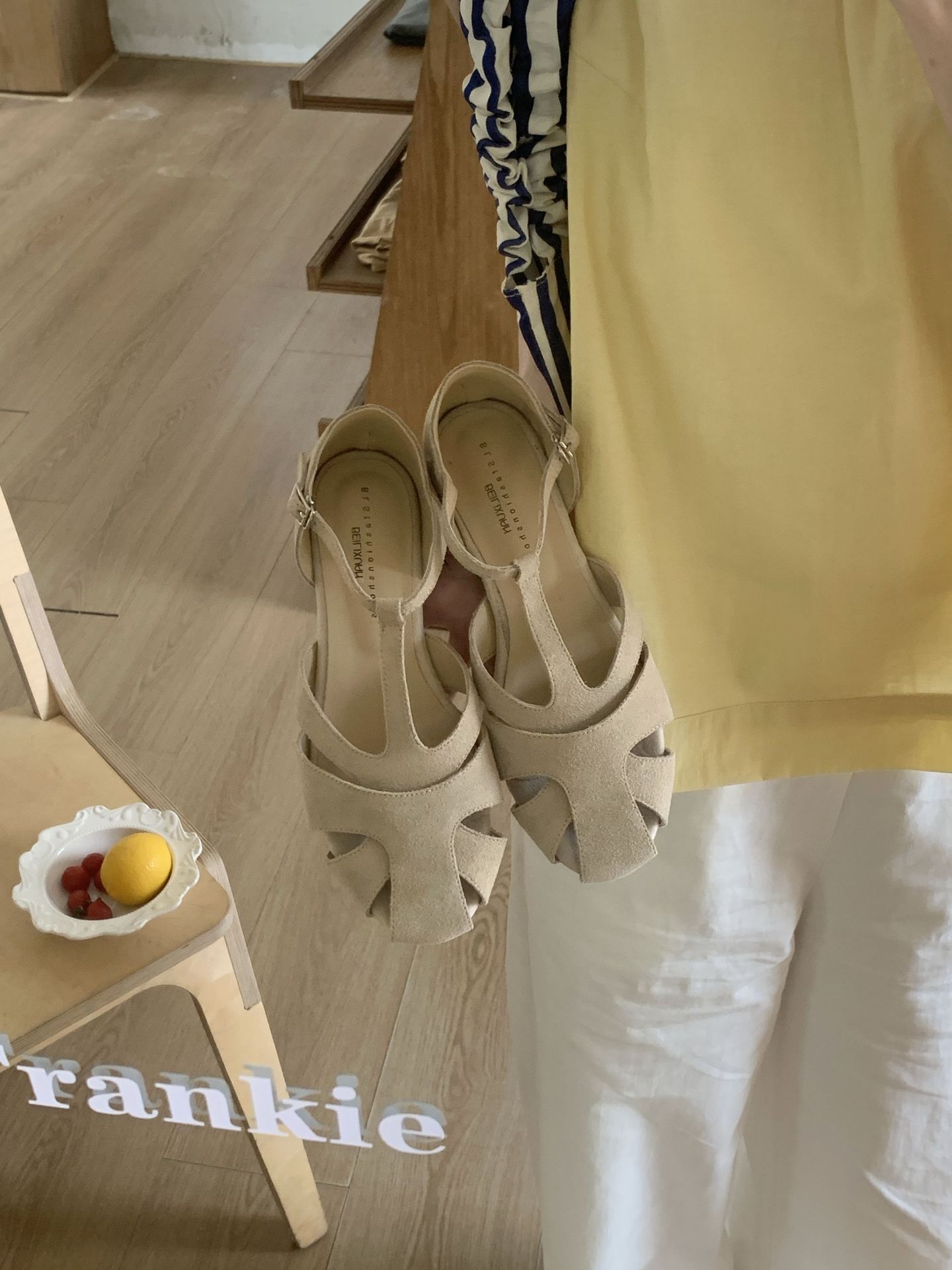 Wenyi 팬 캐시미어 백탑 중공 통기성 2025 여름 두꺼운 낮은 힐 라운드 헤드 가죽 중공 로마 샌들