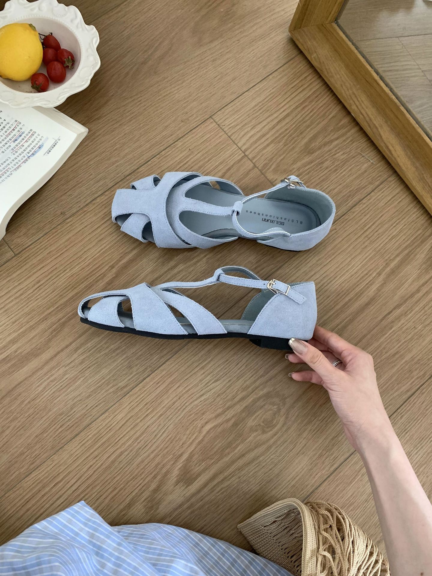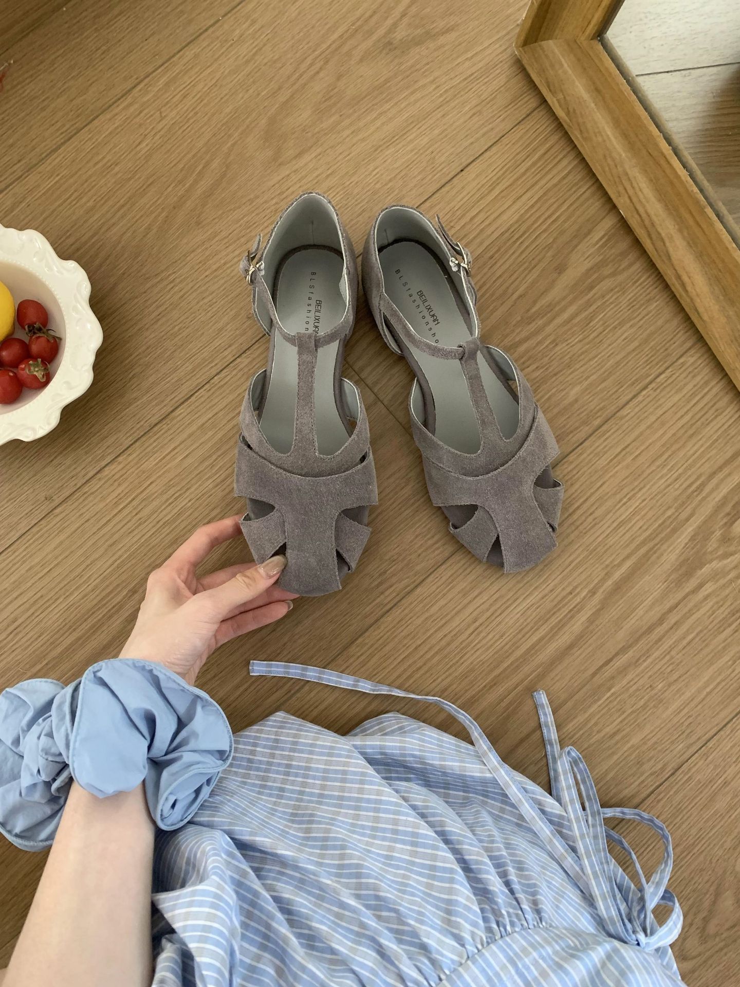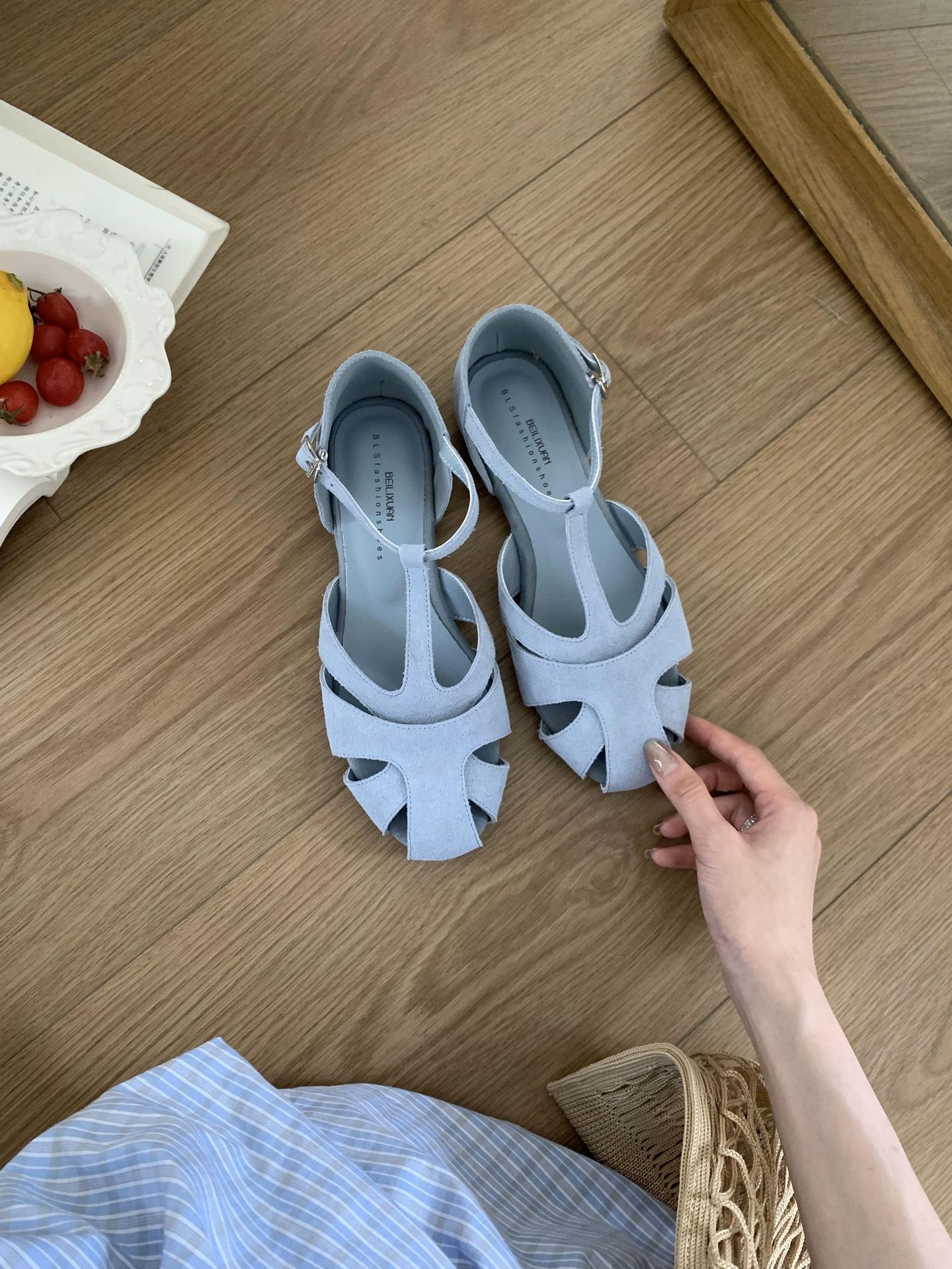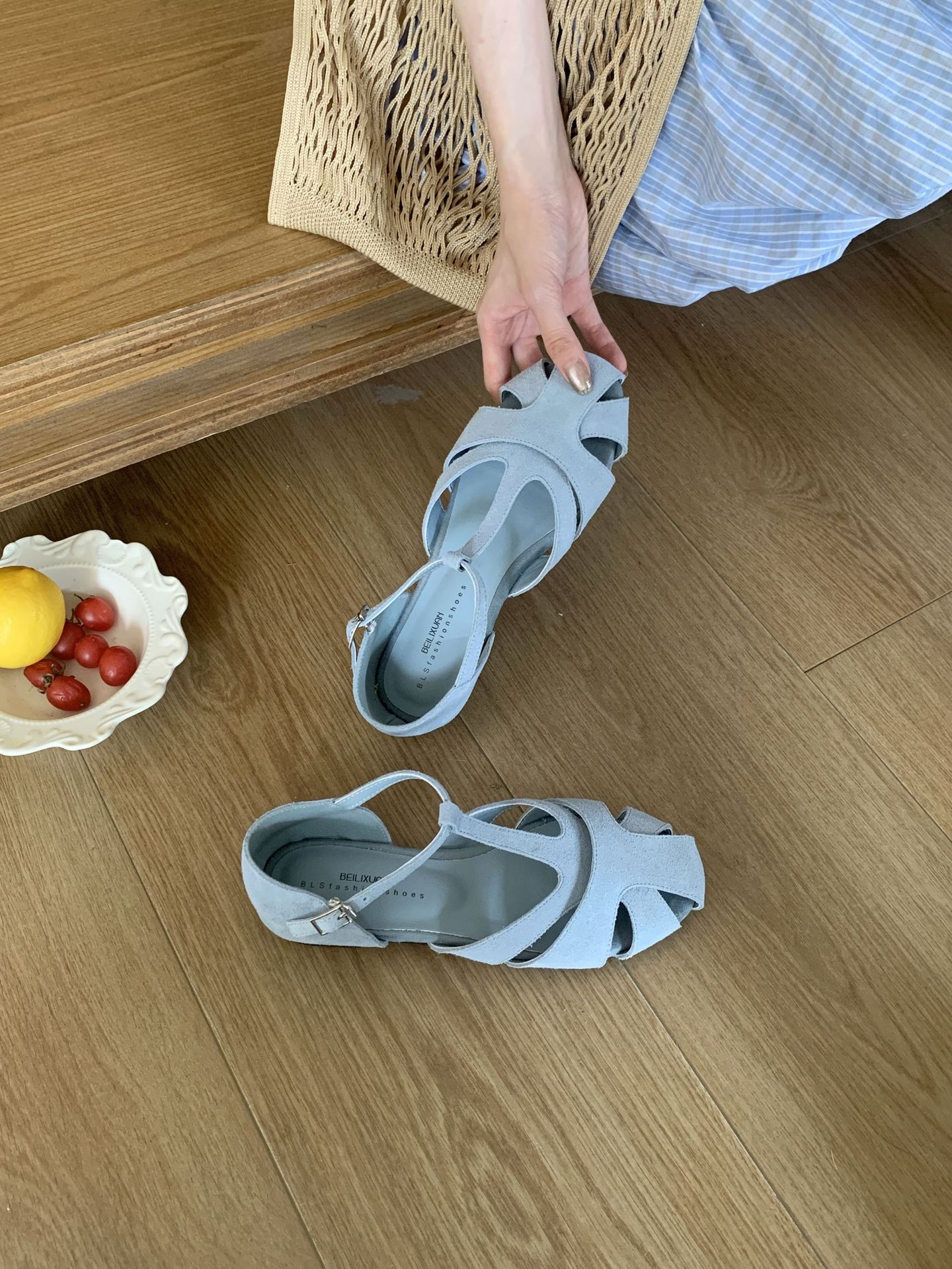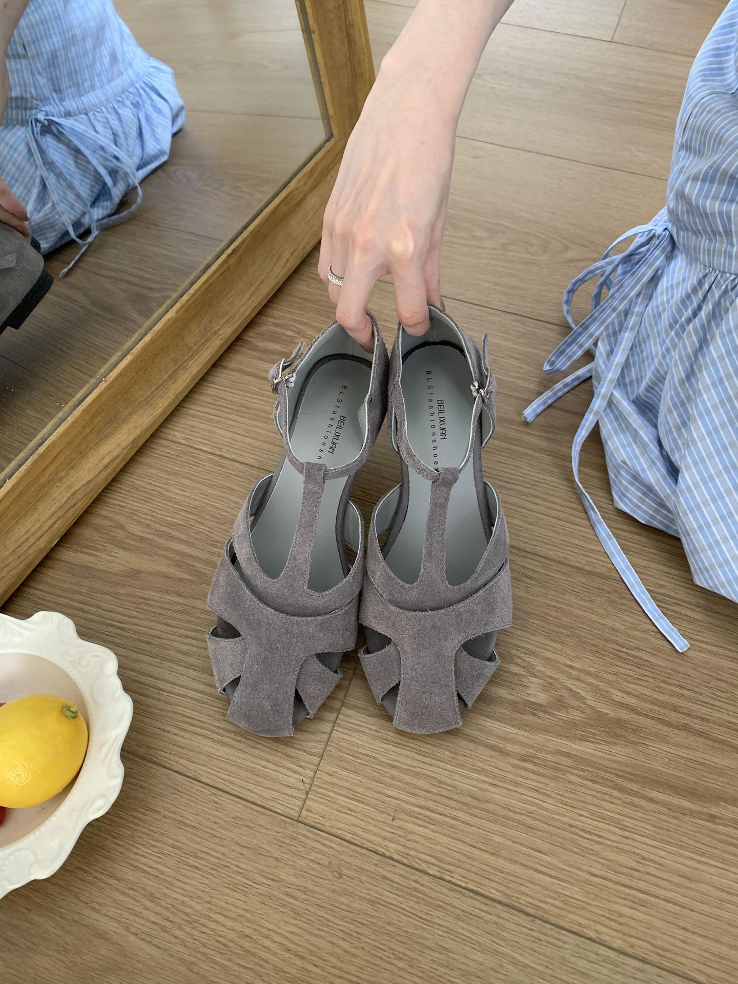 Wenyi 팬 캐시미어 백탑 중공 통기성 2025 여름 두꺼운 낮은 힐 라운드 헤드 가죽 중공 로마 샌들