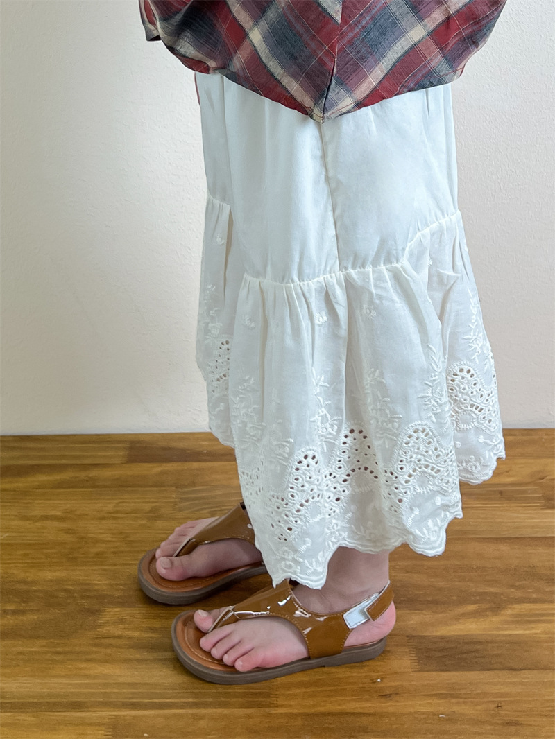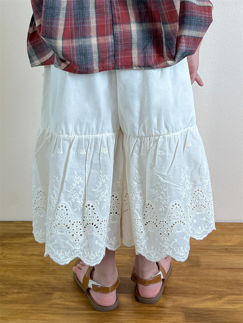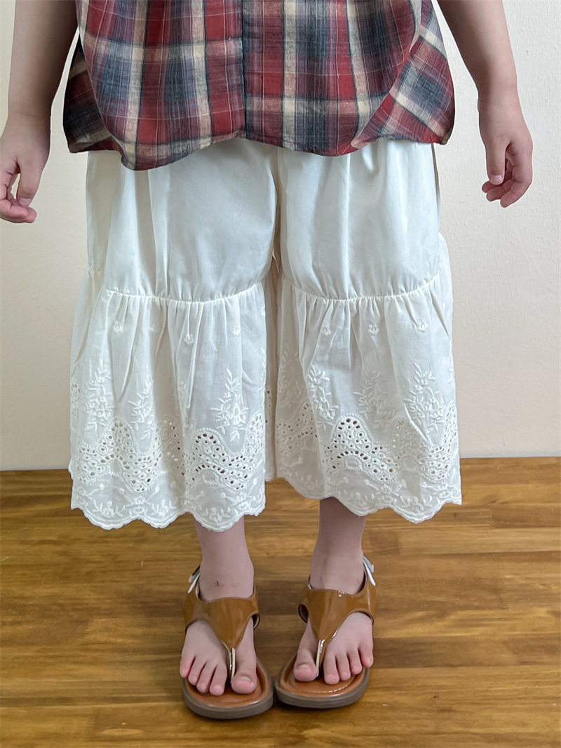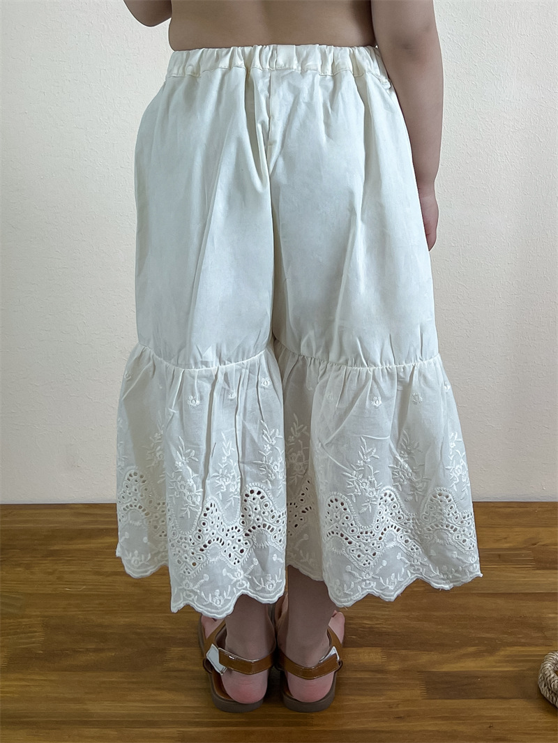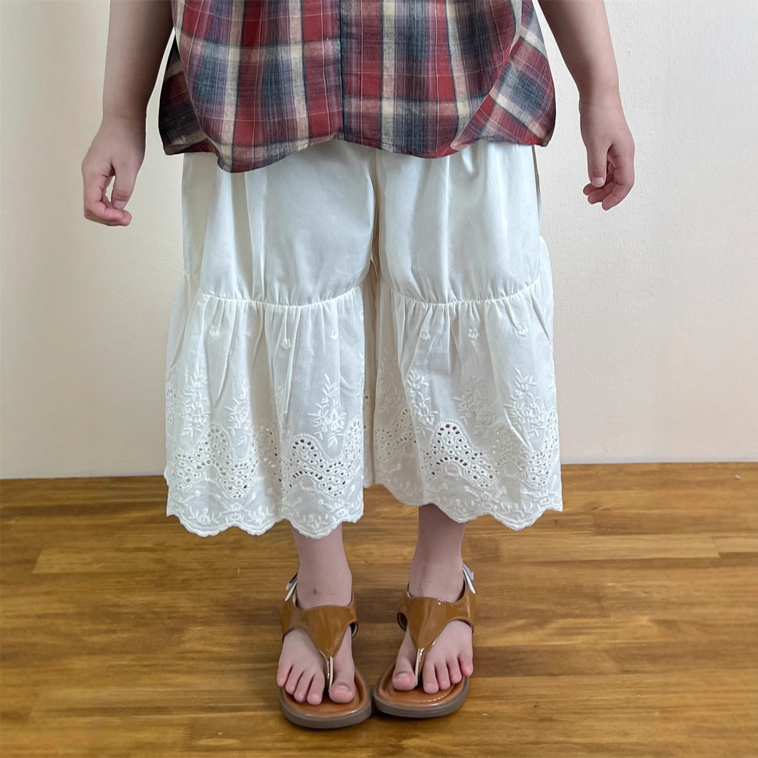 한국 아동복 소녀 여름 트렌디 한 탄성 허리 아름다운 무거운 자수 스티칭 레이스 와이드 다리 바지 착용스토어 가기