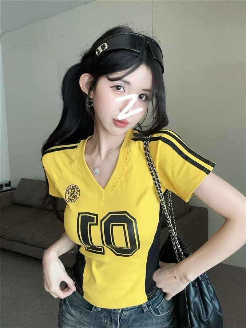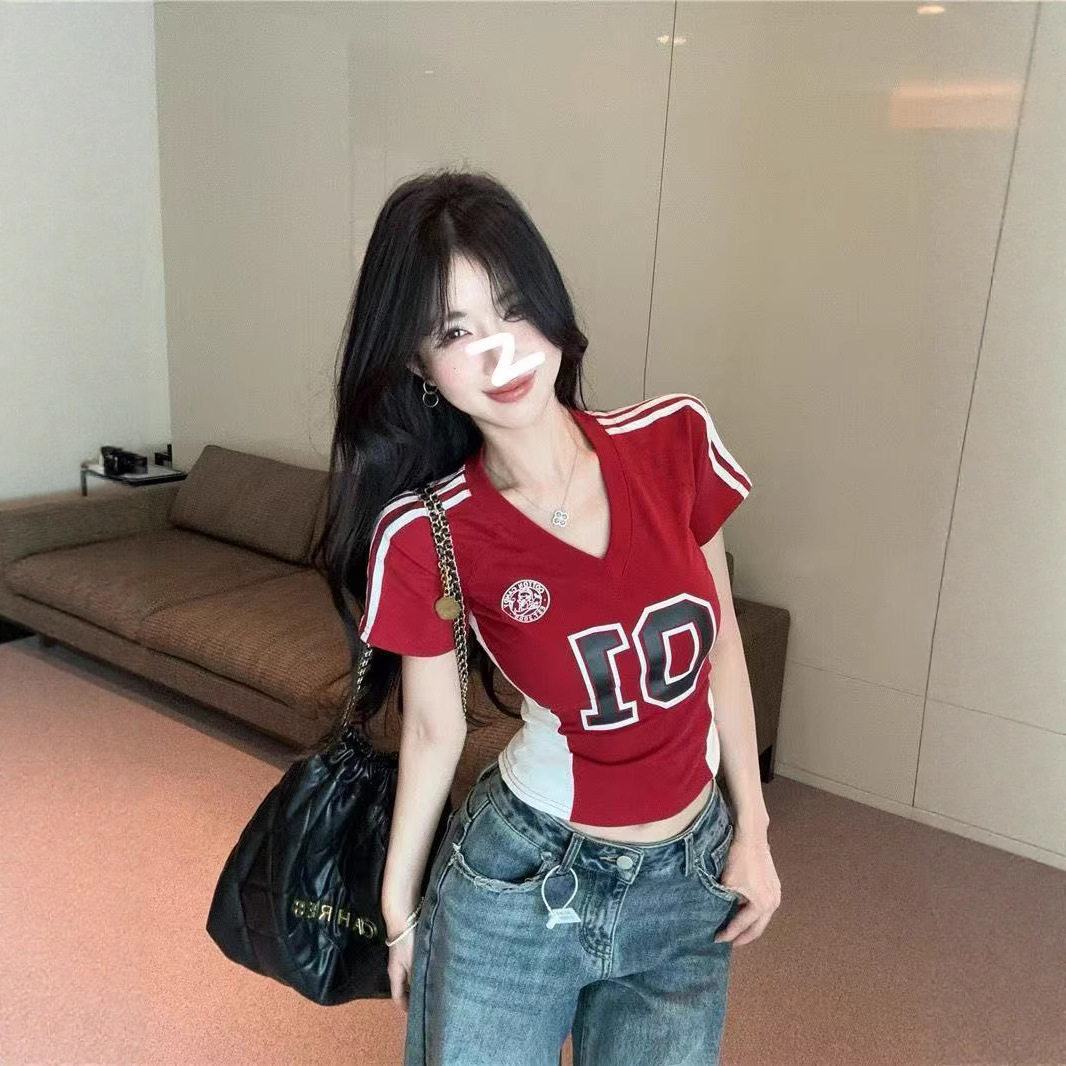 아메리칸 스타일 어깨 반팔 티셔츠 여성 여름 스파이스 걸스 V 넥 쇼트 탑 독특한 아름다운 대학 스타일 스포츠 저지스토어 가기