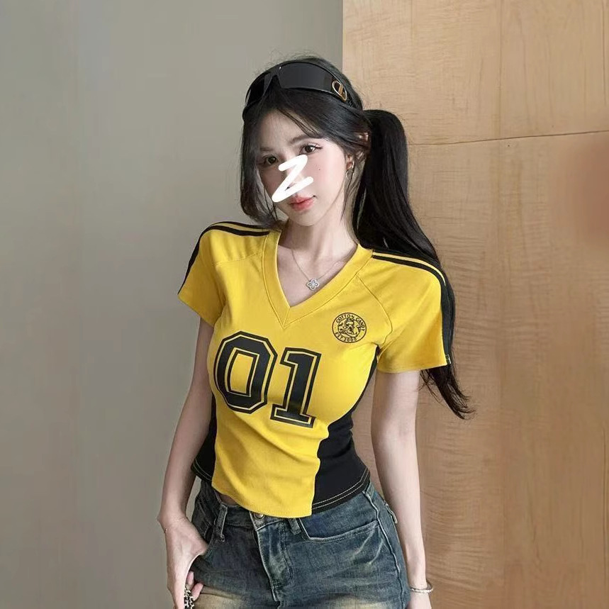 아메리칸 스타일 어깨 반팔 티셔츠 여성 여름 스파이스 걸스 V 넥 쇼트 탑 독특한 아름다운 대학 스타일 스포츠 저지