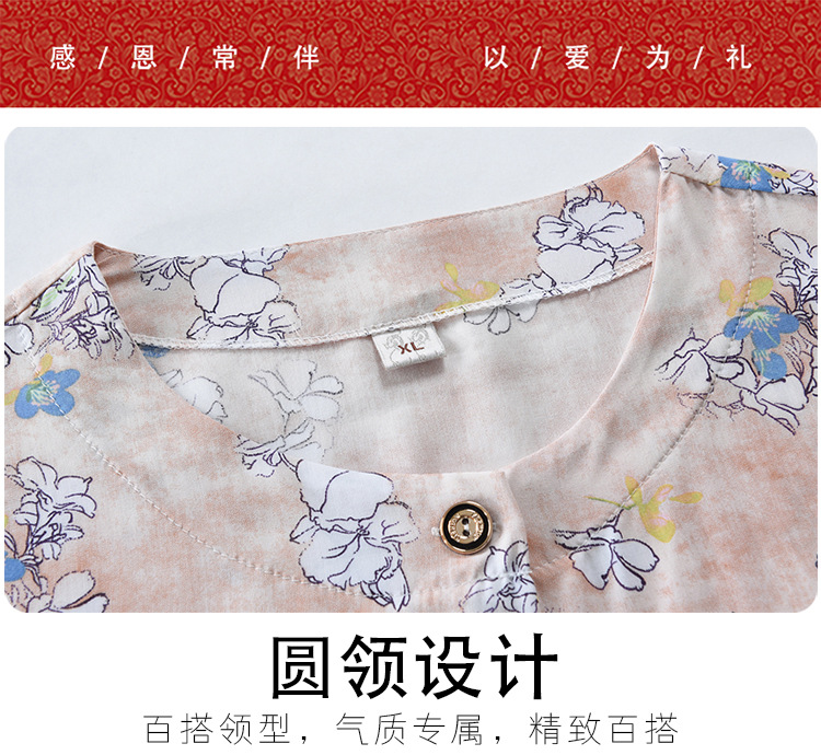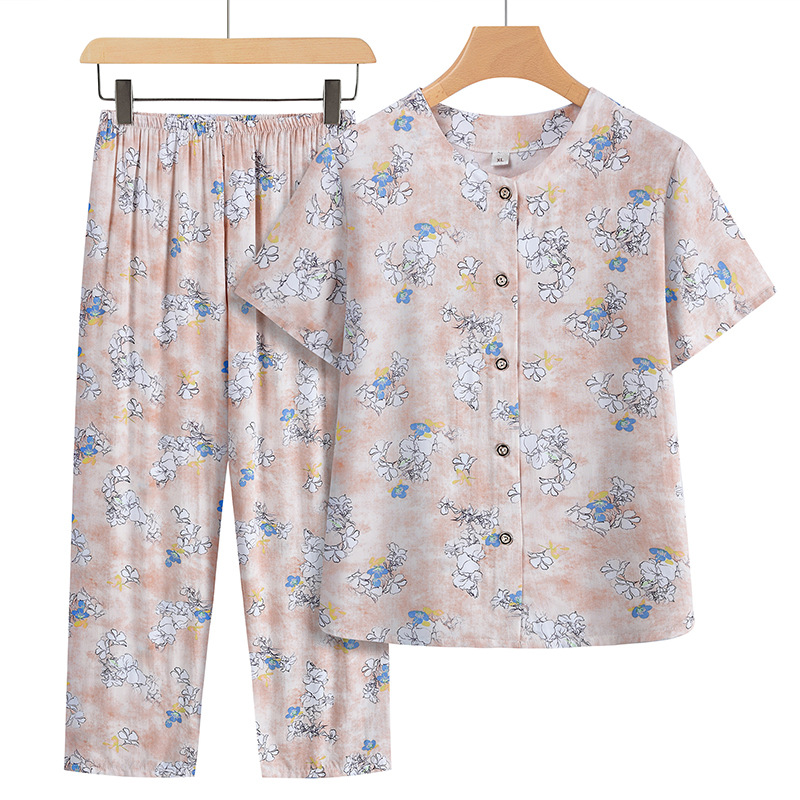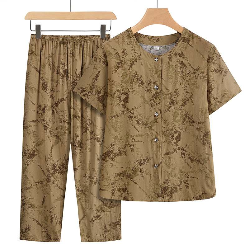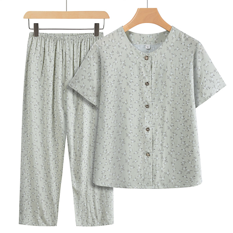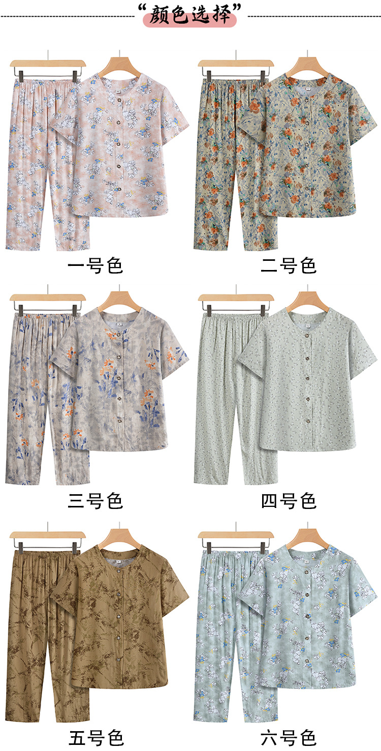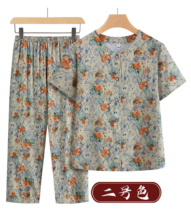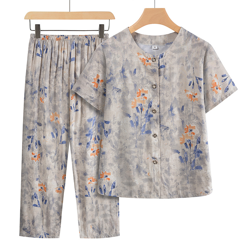 할머니의 여름 면화 실크 세트 중년 및 노인 여성의 여름 반팔 자른 바지 어머니의 카디건 인공 면화 투피스 세트스토어 가기