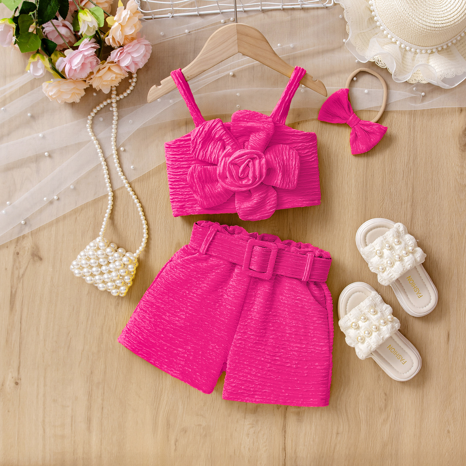 아동복 세트 국경 간 아마존 여름 새로운 슬링 러플 쇼트 탑 레이스 반바지 벨트 걸스스토어 가기