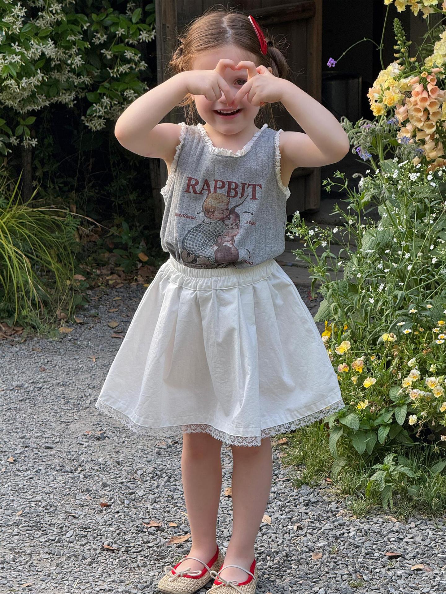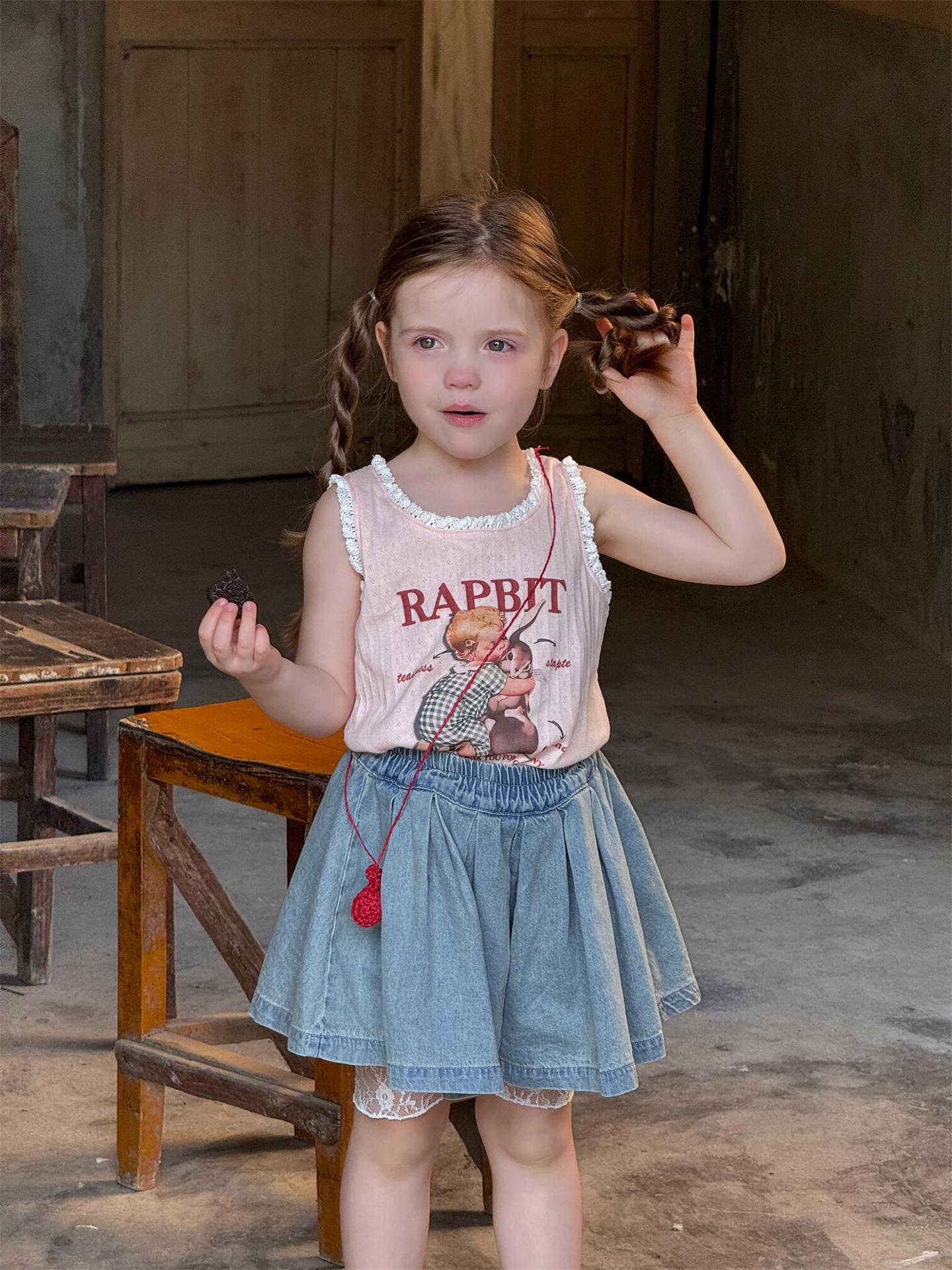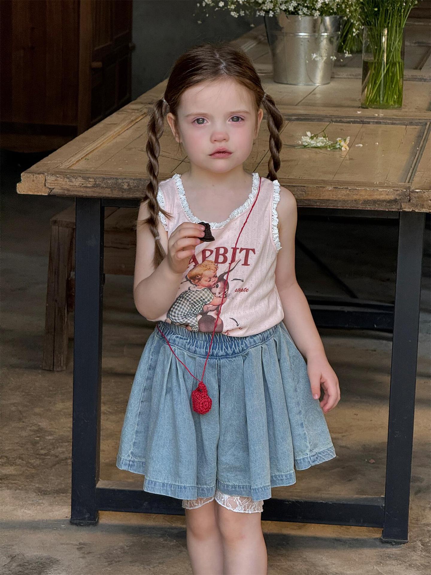 한국 스타일 아동복 2025 여름 새 스타일 소녀 조끼 귀여운 만화 인쇄 민소매 탑 풀오버