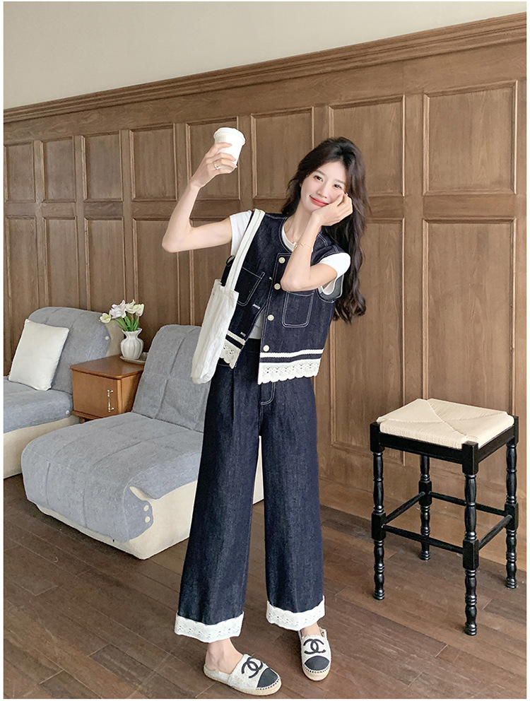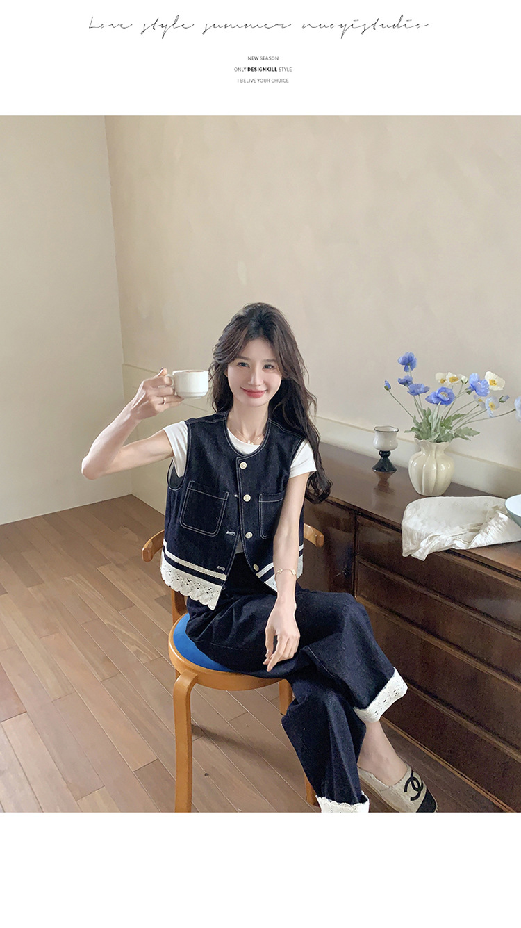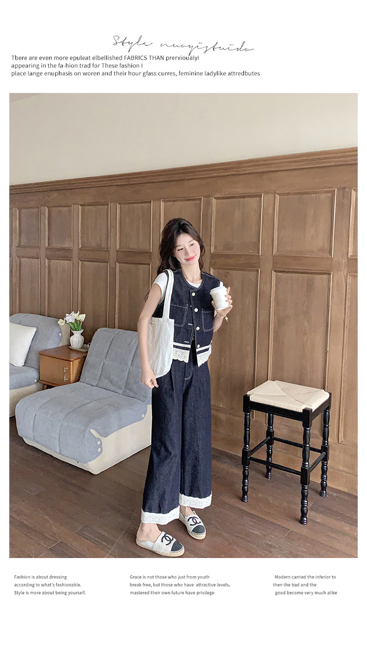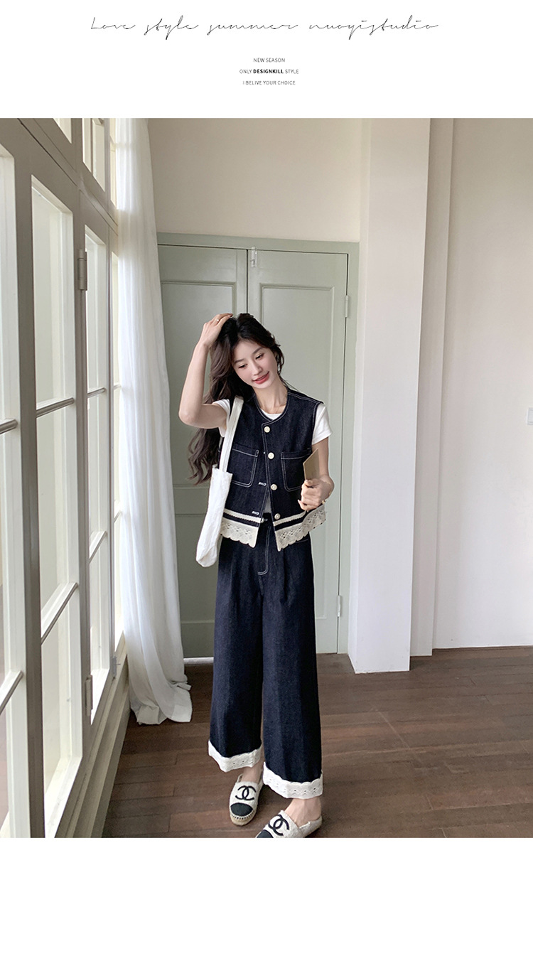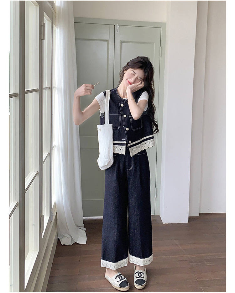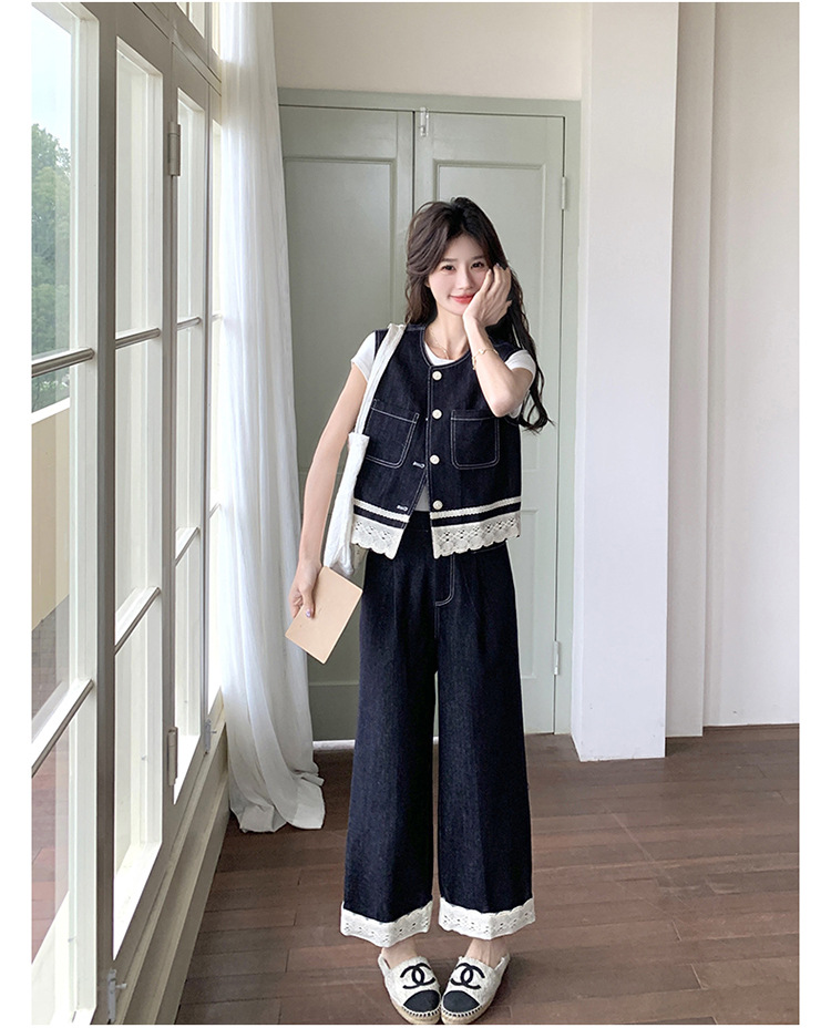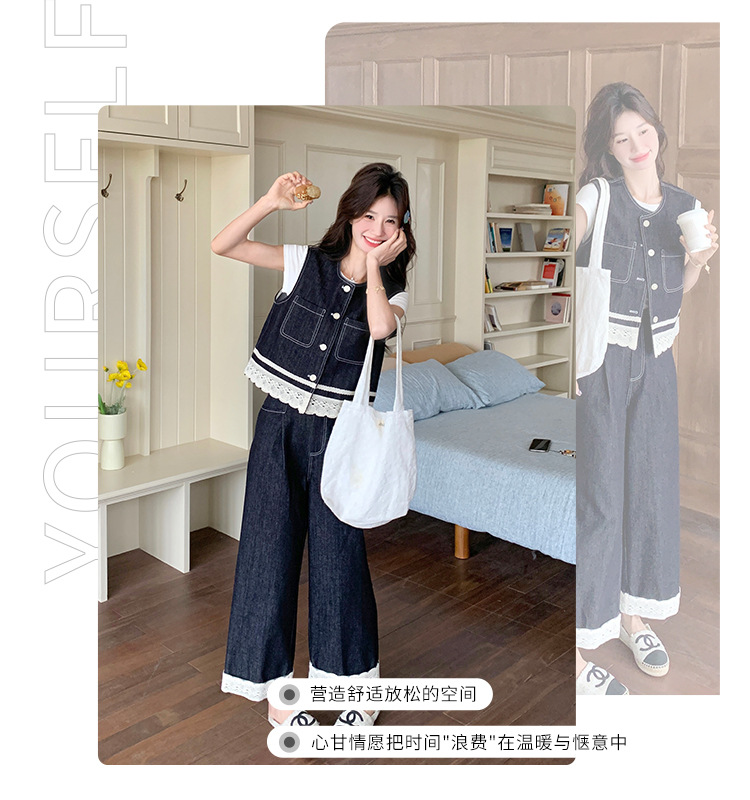 리얼 샷 레이스 스티칭 얇은 데님 세트 여자 2025 년 여름 뉴 오트 착용 조끼 와이드 레그 바지 투피스 세트스토어 가기