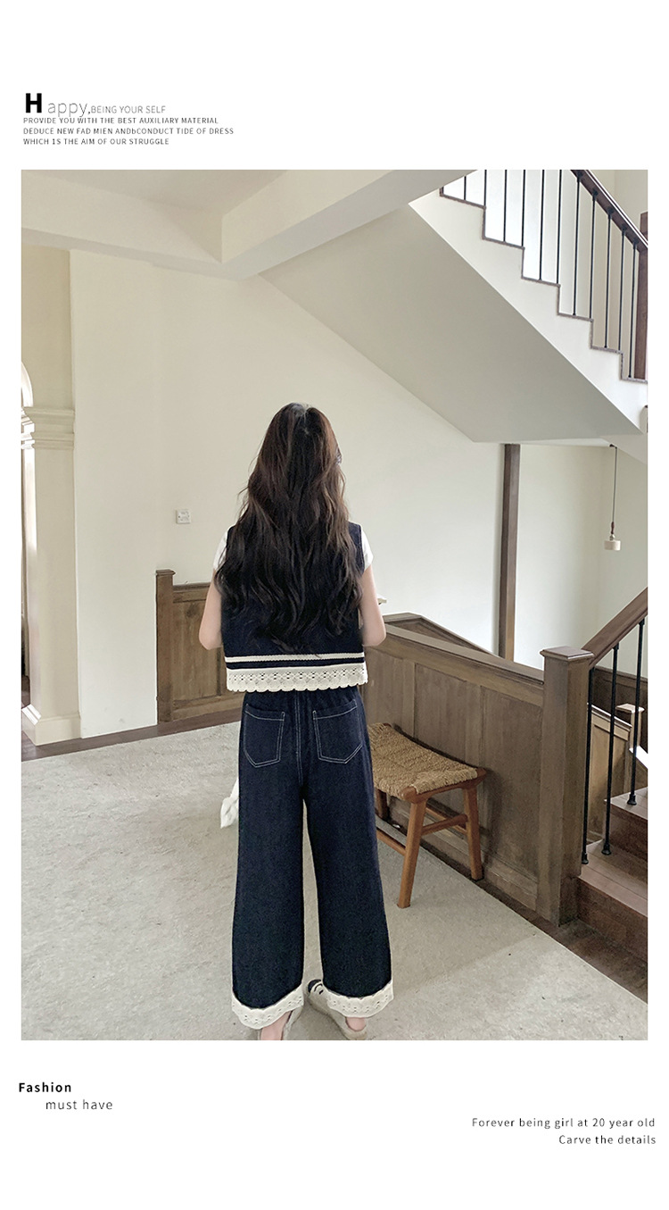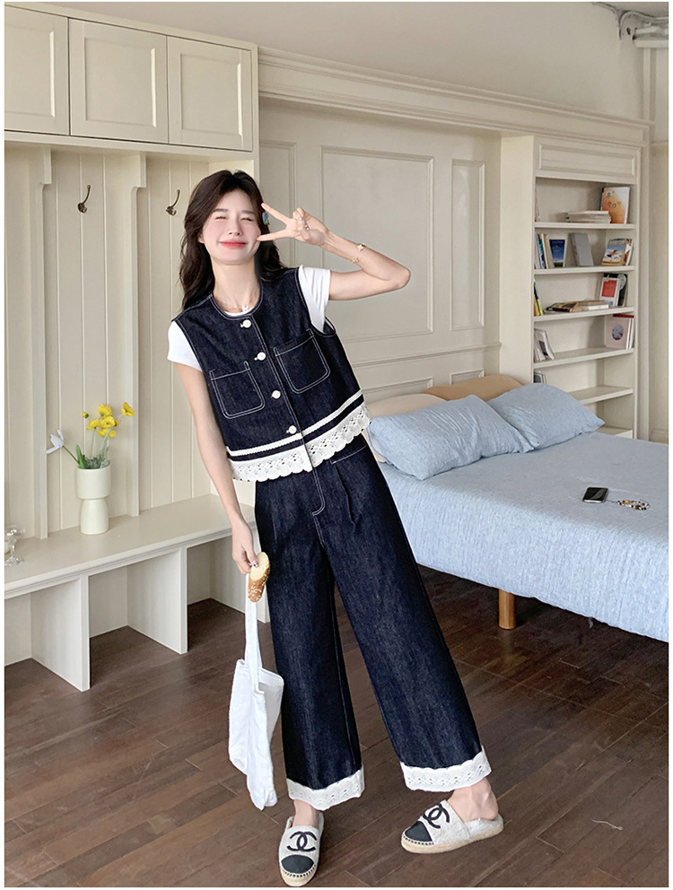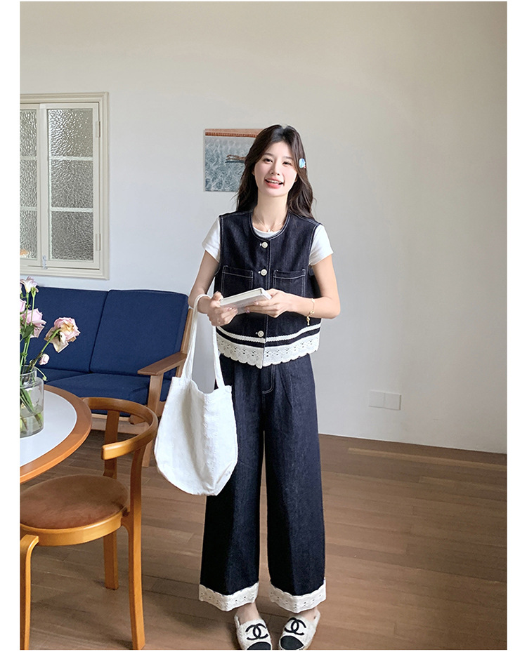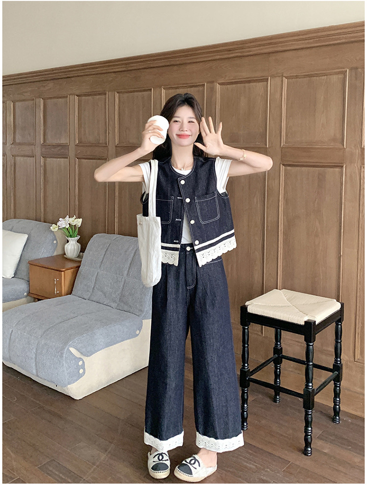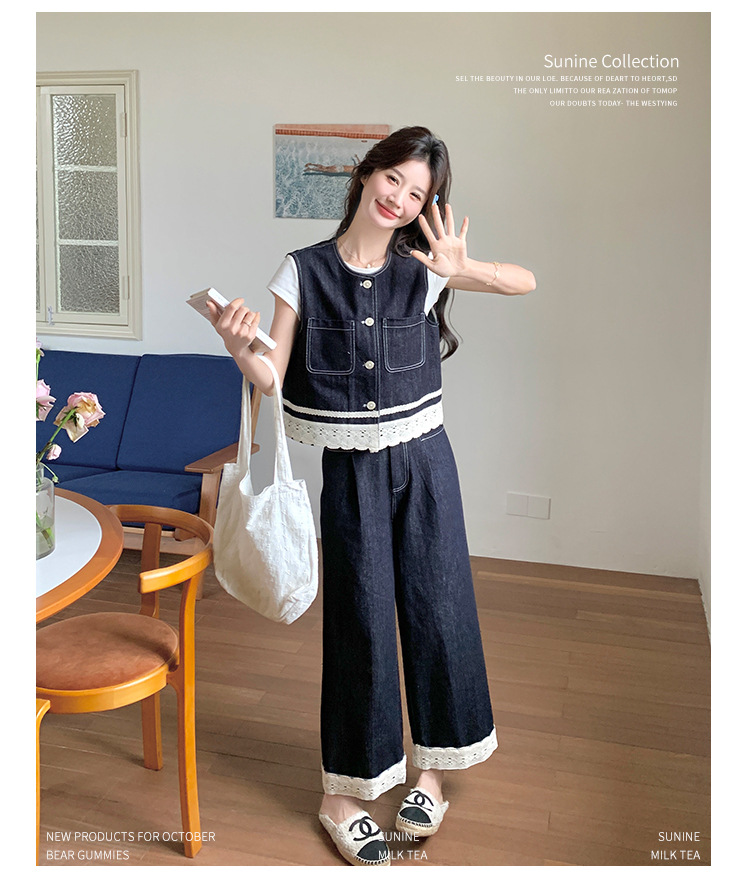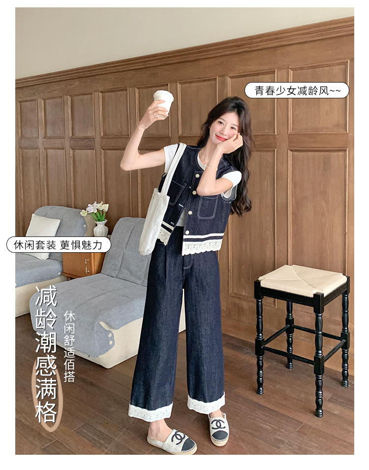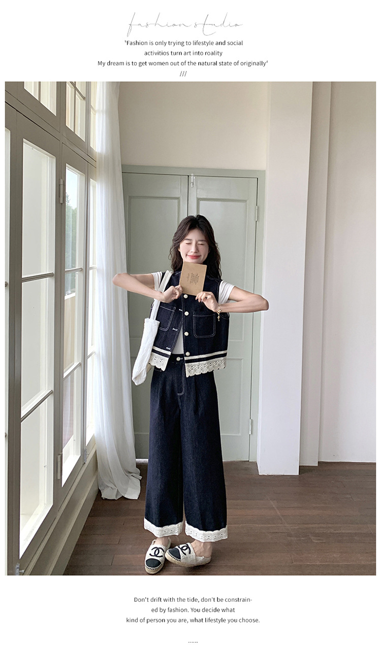 리얼 샷 레이스 스티칭 얇은 데님 세트 여자 2025 년 여름 뉴 오트 착용 조끼 와이드 레그 바지 투피스 세트스토어 가기