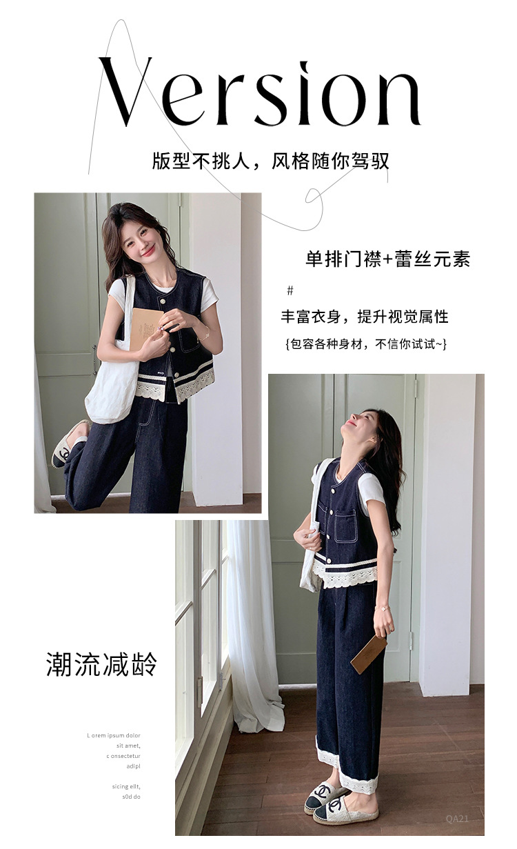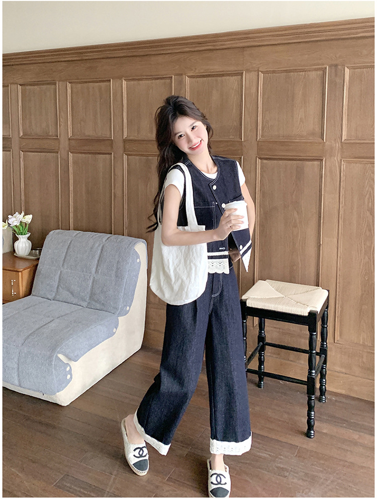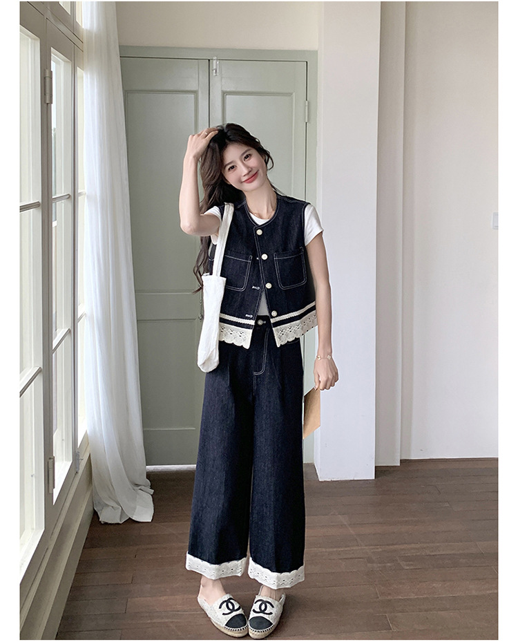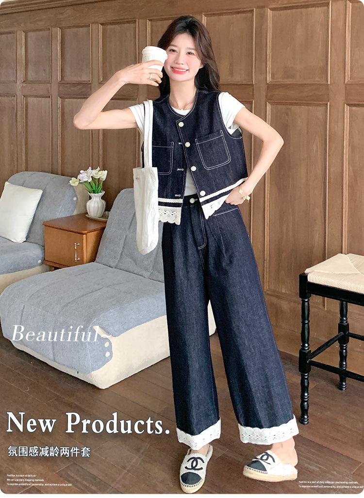 리얼 샷 레이스 스티칭 얇은 데님 세트 여자 2025 년 여름 뉴 오트 착용 조끼 와이드 레그 바지 투피스 세트