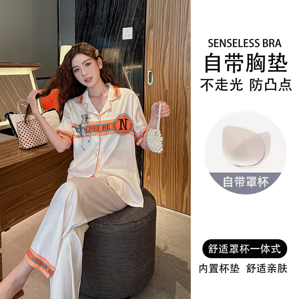 인기상품 A 가슴패드 내장 스타일리시한 실크 잠옷 여성용 여름 얇은 3피스 세트 실크 고급스러운 홈웨어