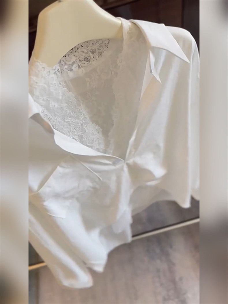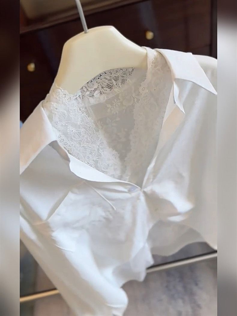 "새로운 패션을 잠금 해제하고 쌓아 올리세요" 여성용 고급 다용도 화이트 레이스 스플라이스 셔츠, 우아한 틈새 상의스토어 가기