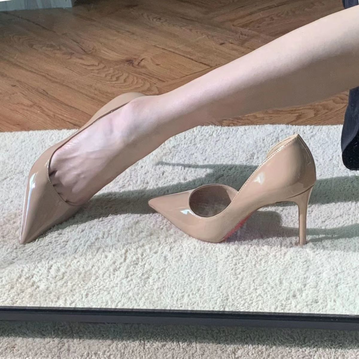 특허 가죽 사이드 빈 레드 밑창 슈즈 스틸레토 힐 블랙 하이힐 슈즈 2025 봄과 가을 새로운 섹시한 슬리밍 전문 통근 신발스토어 가기