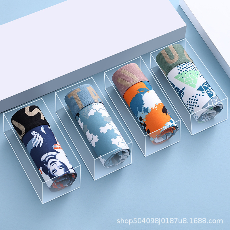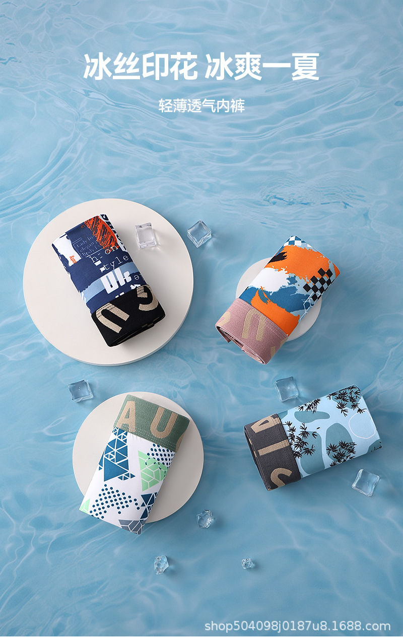 [4팩] 남성용 여름 복서 팬티, 남성용 미드 웨이스트 프린트 속옷, 남성용 통기성 아이스 실크 속옷
