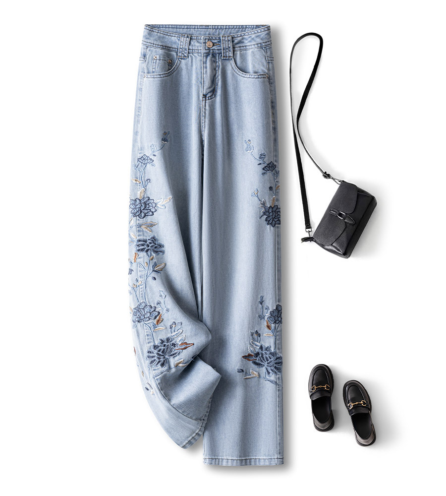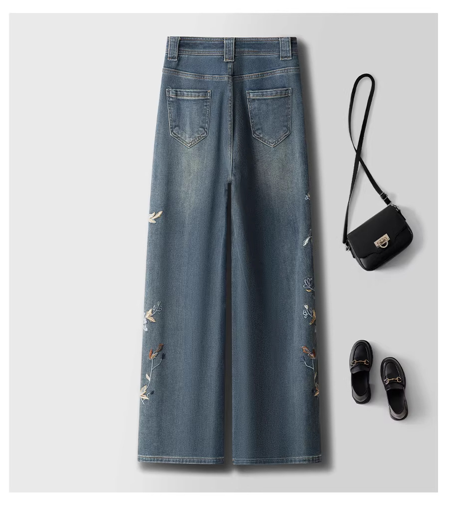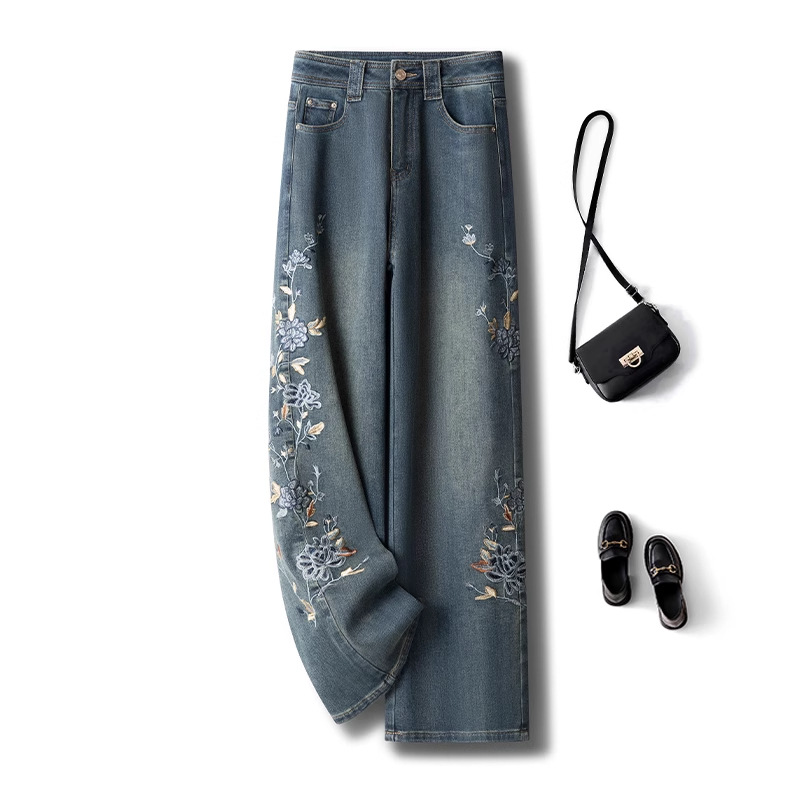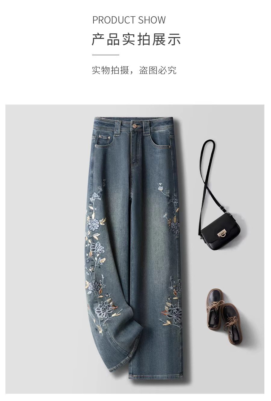 여성을위한 새로운 중국 스타일 국가 스타일 수 놓은 청바지 2025 슬림하고 좁은 버전 와이드 레그 팬츠 레트로 캐주얼 바지스토어 가기