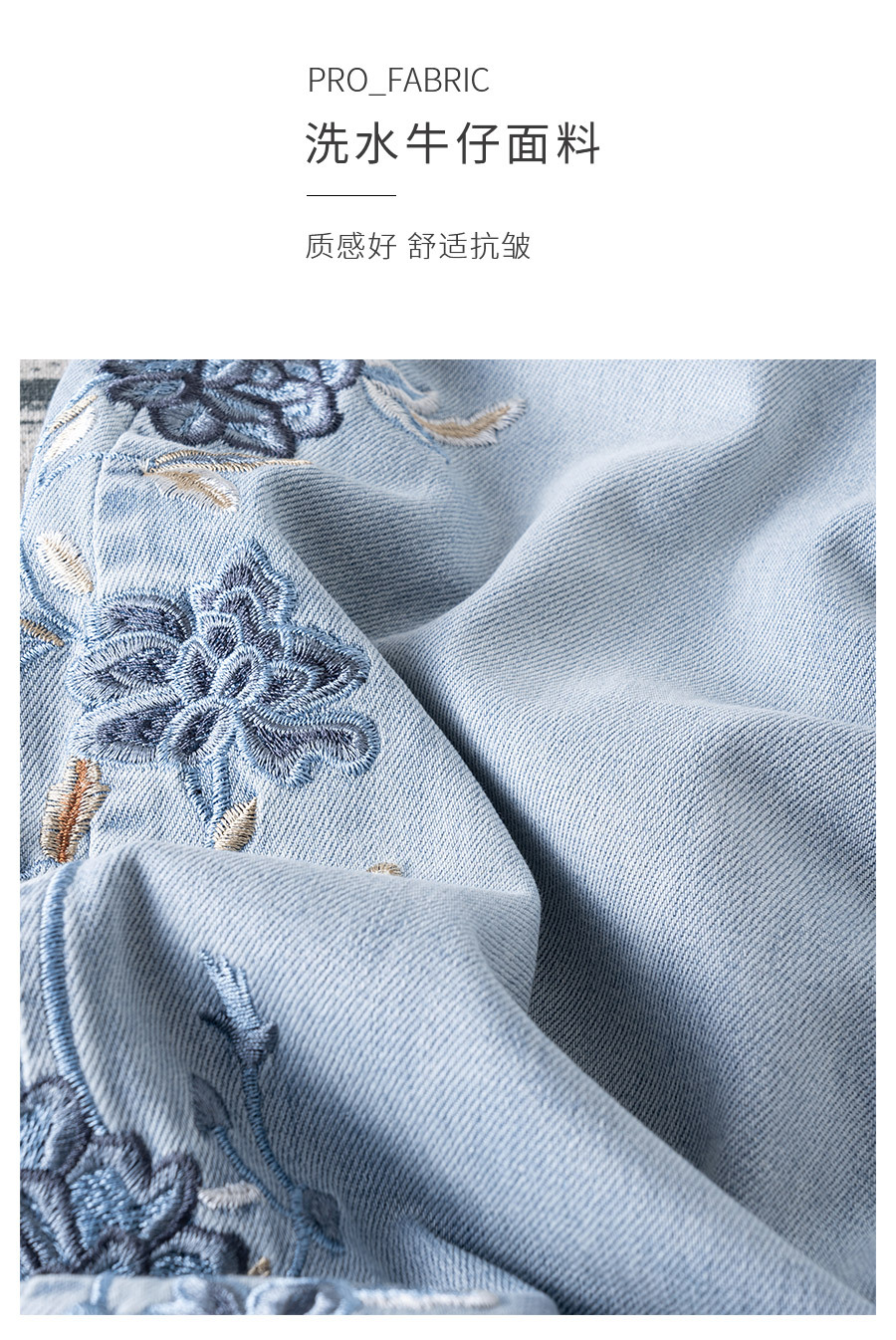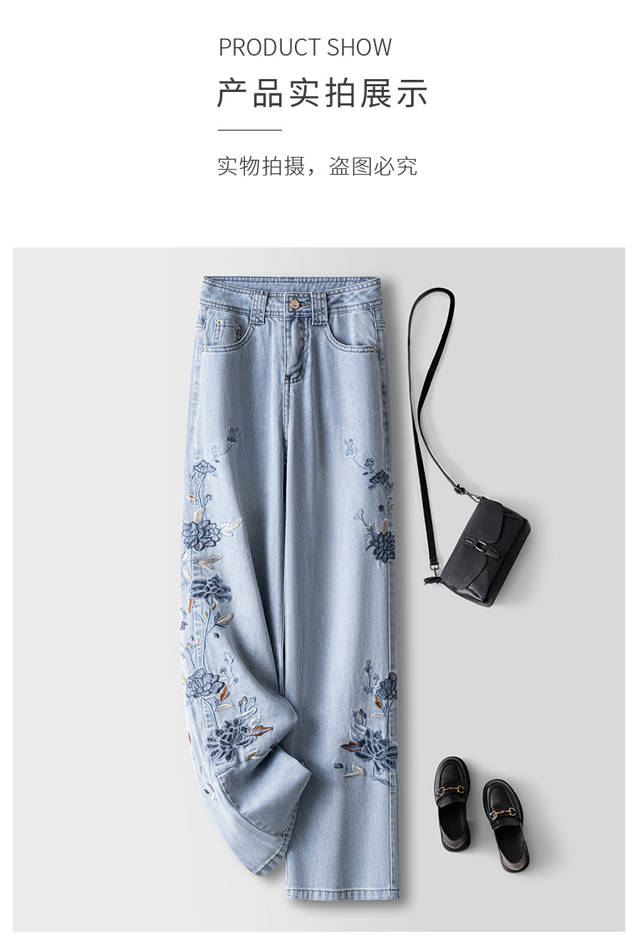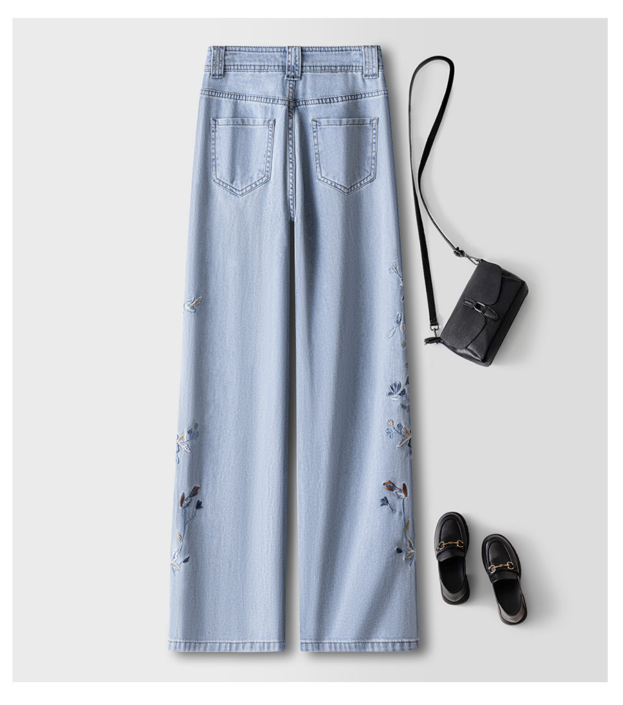 여성을위한 새로운 중국 스타일 국가 스타일 수 놓은 청바지 2025 슬림하고 좁은 버전 와이드 레그 팬츠 레트로 캐주얼 바지스토어 가기