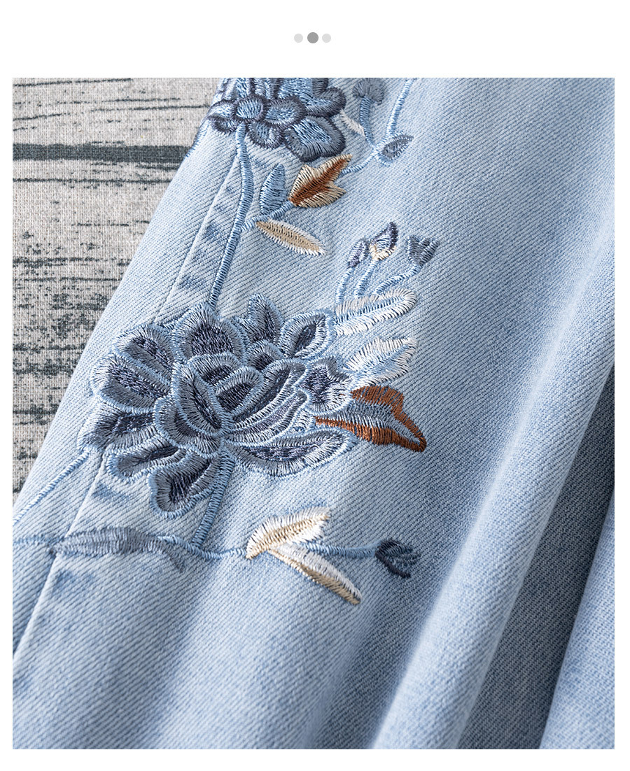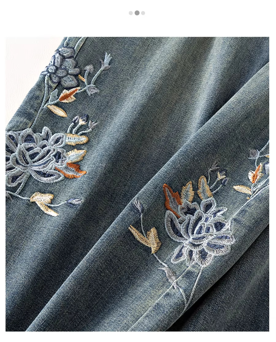 여성을위한 새로운 중국 스타일 국가 스타일 수 놓은 청바지 2025 슬림하고 좁은 버전 와이드 레그 팬츠 레트로 캐주얼 바지
