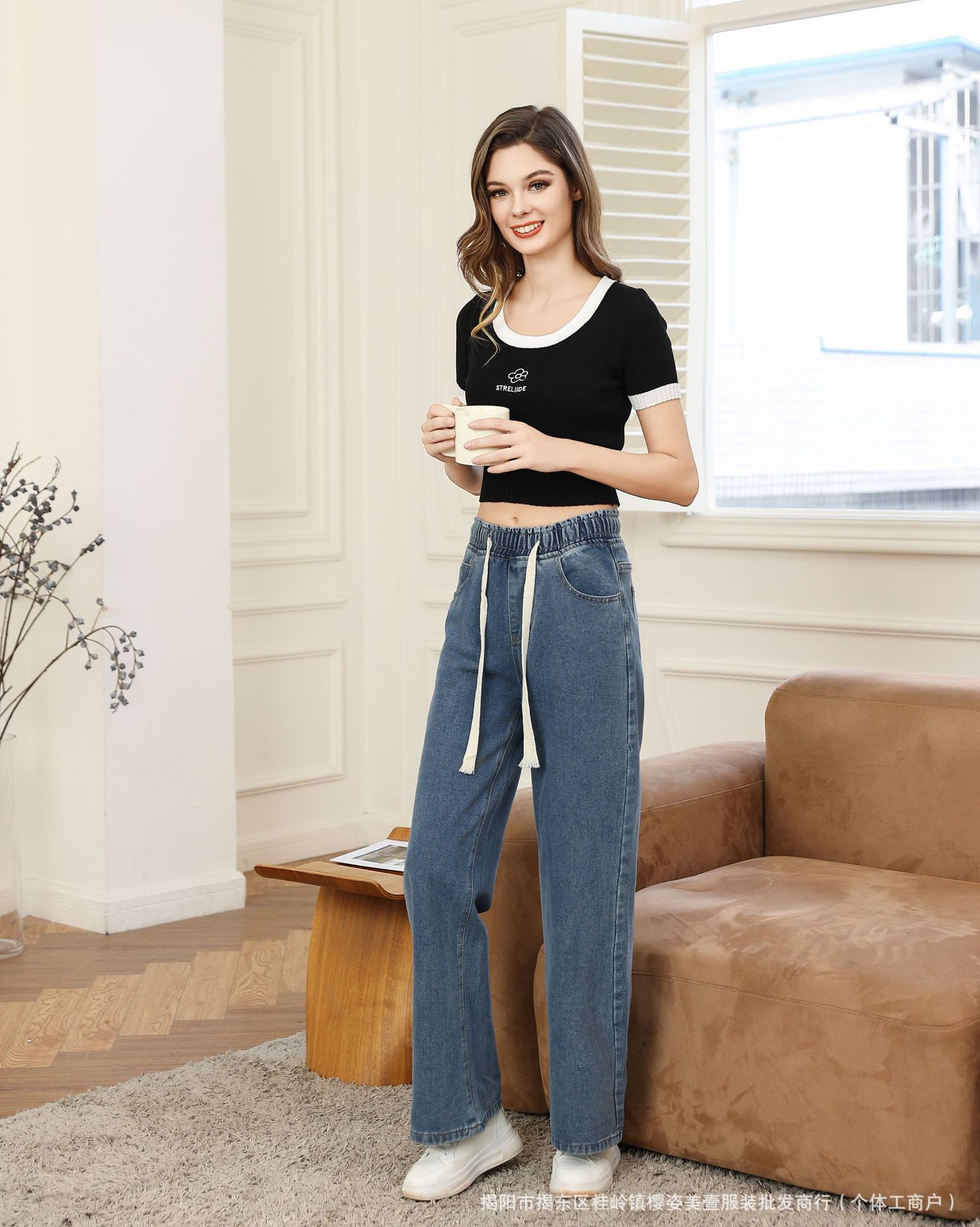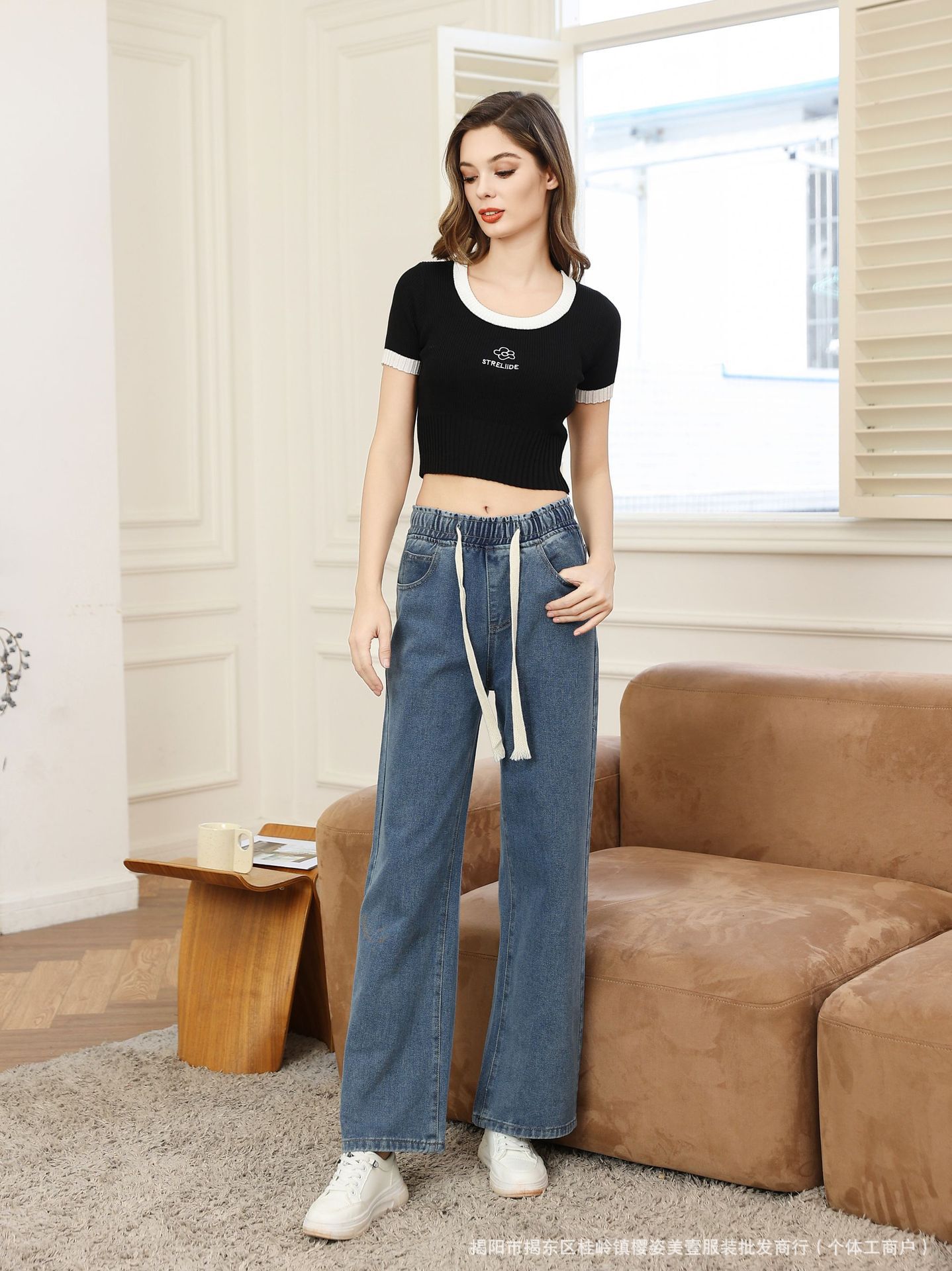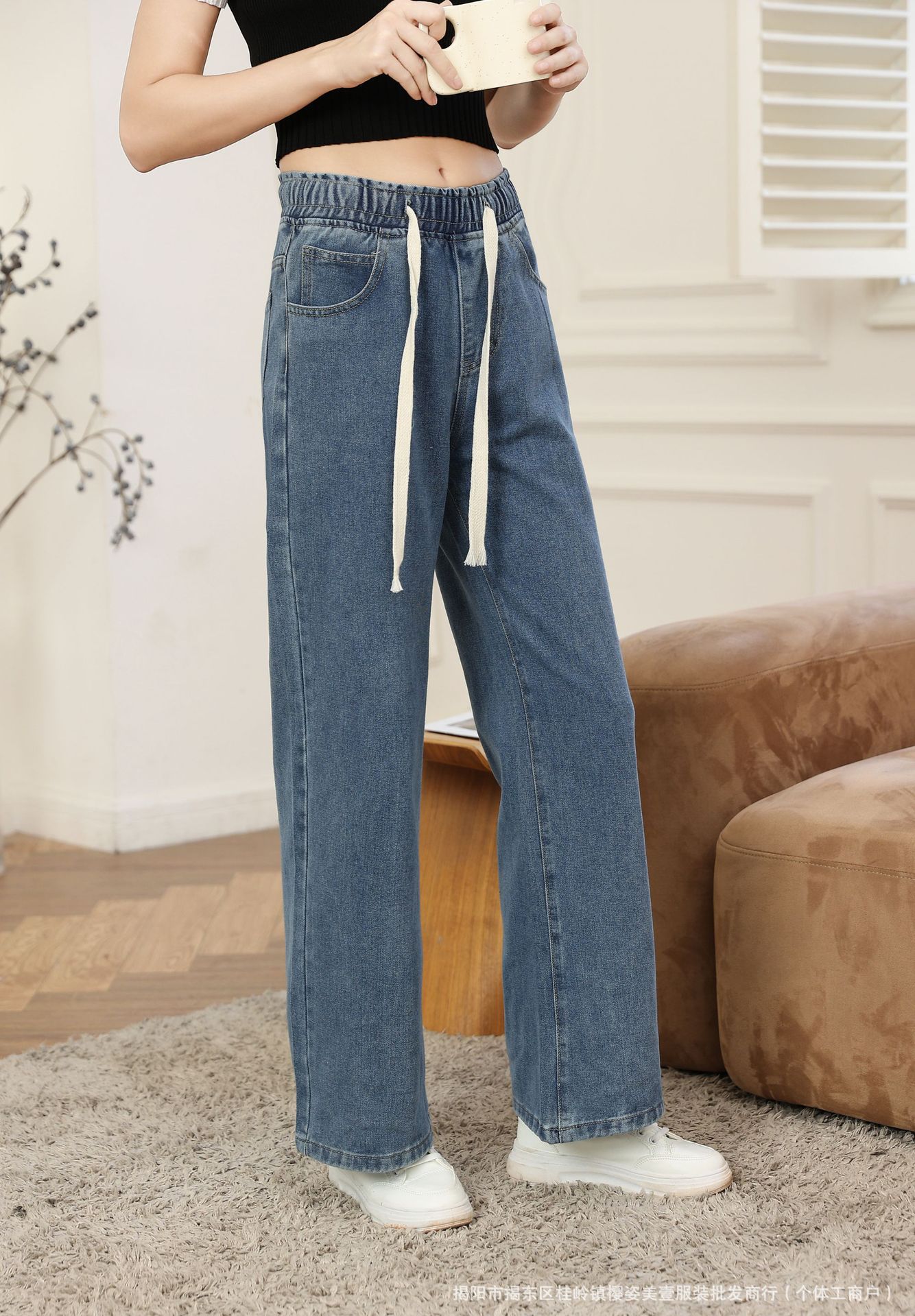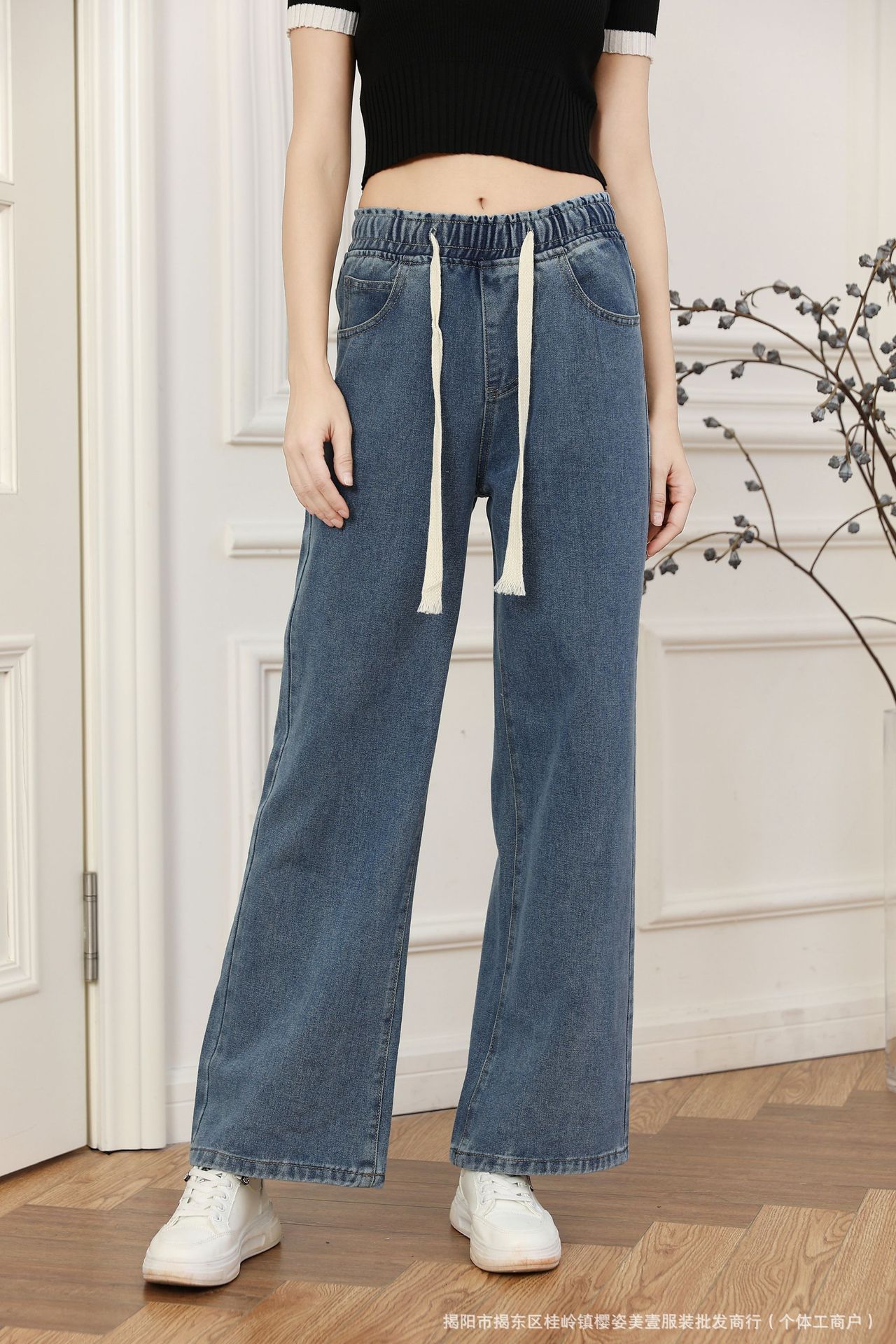 유럽과 미국의 봄과 여름 높은 허리 넓은 다리 바지 대외 무역은 느슨한 슬리밍 Elastoelastelic 허리 직선 청바지 여성 국경스토어 가기