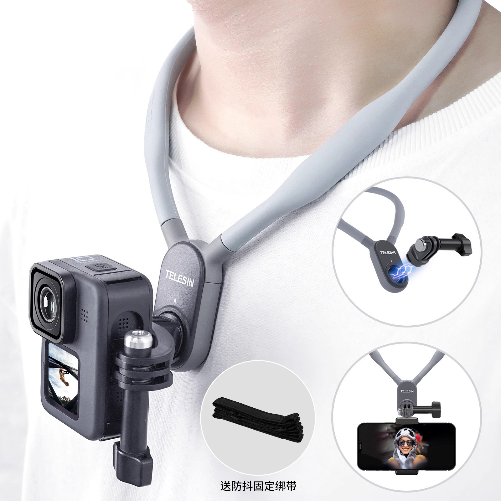 • 자석 걸이형 목 브래킷 + 중앙 수직 촬영 + 휴대폰 클립(휴대폰 카메라에 사용 가능)(흔들림 방지 스트랩 포함)