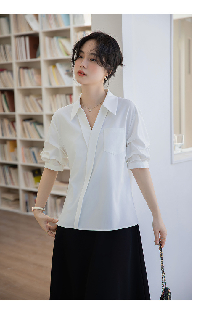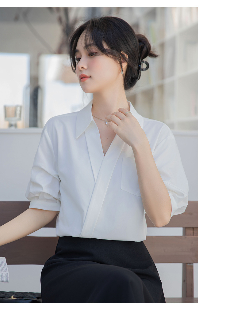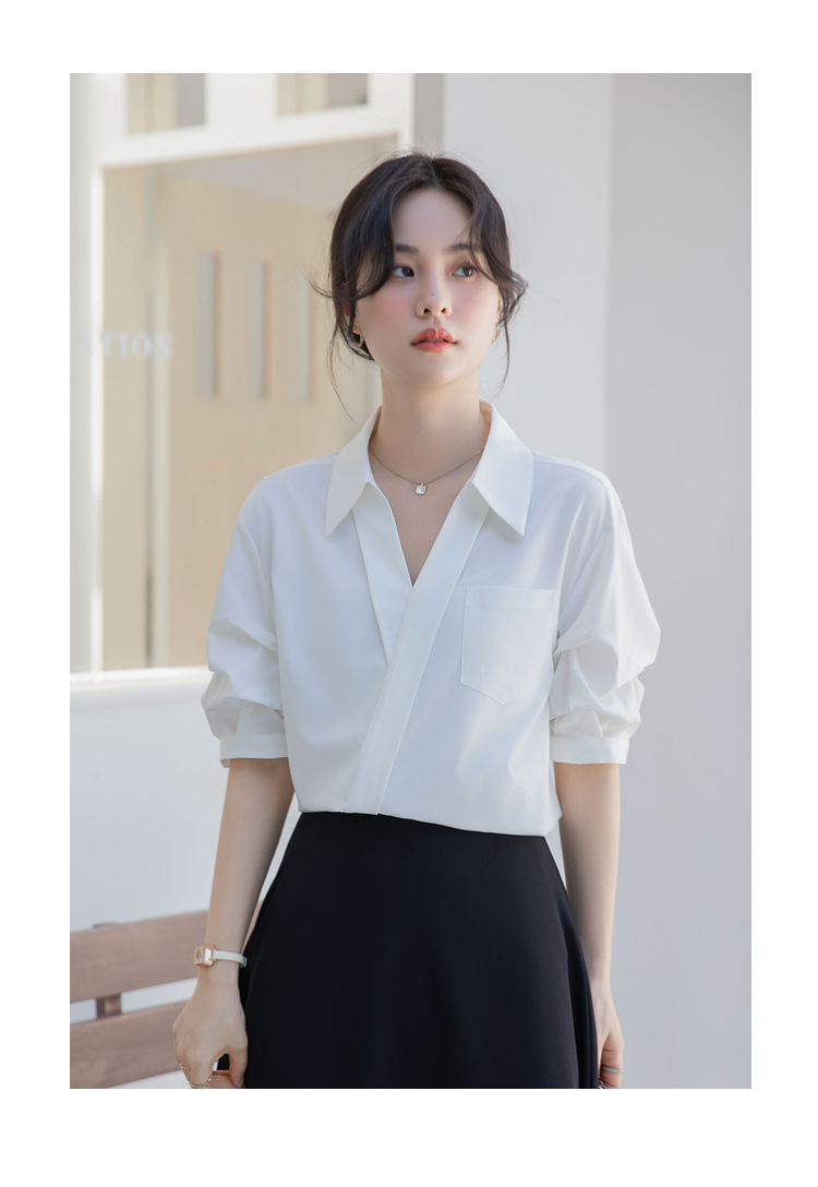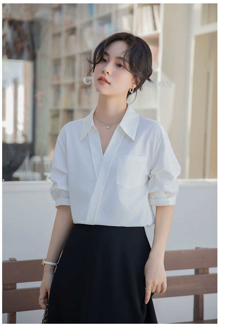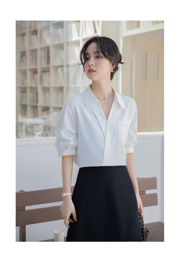 여성용 화이트 셔츠 2025 여름 새 스타일 캐주얼 루즈 전문 프렌치 니치 탑 v 넥 반팔 셔츠