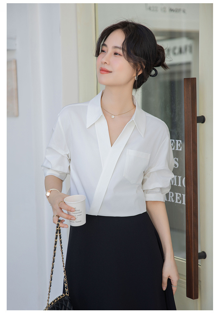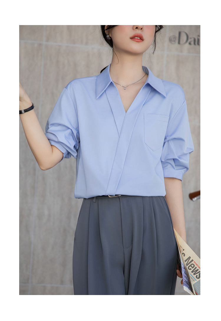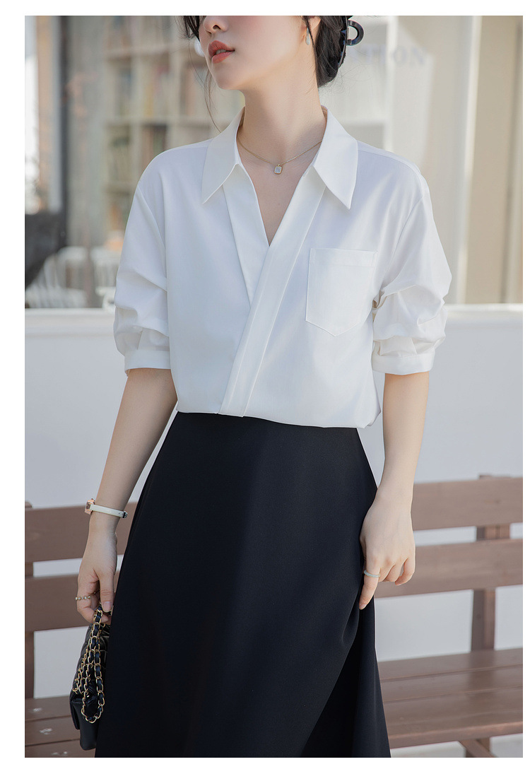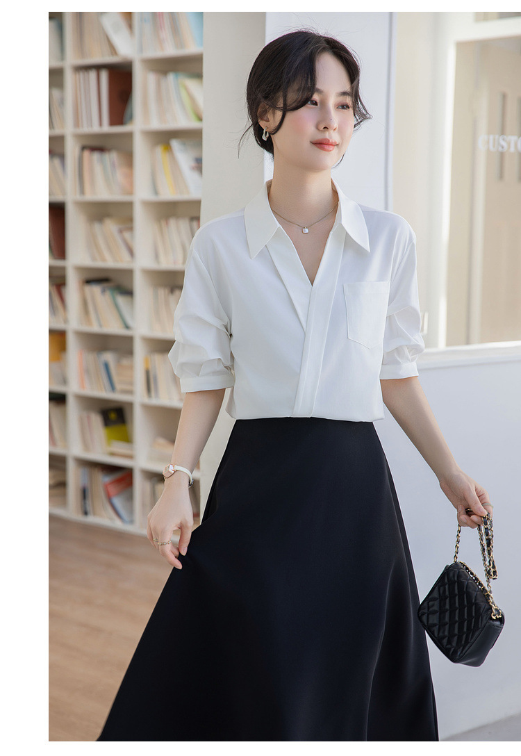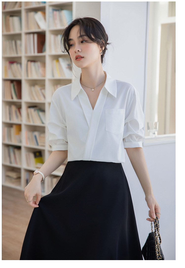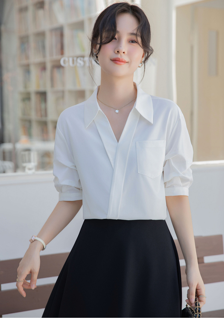 여성용 화이트 셔츠 2025 여름 새 스타일 캐주얼 루즈 전문 프렌치 니치 탑 v 넥 반팔 셔츠