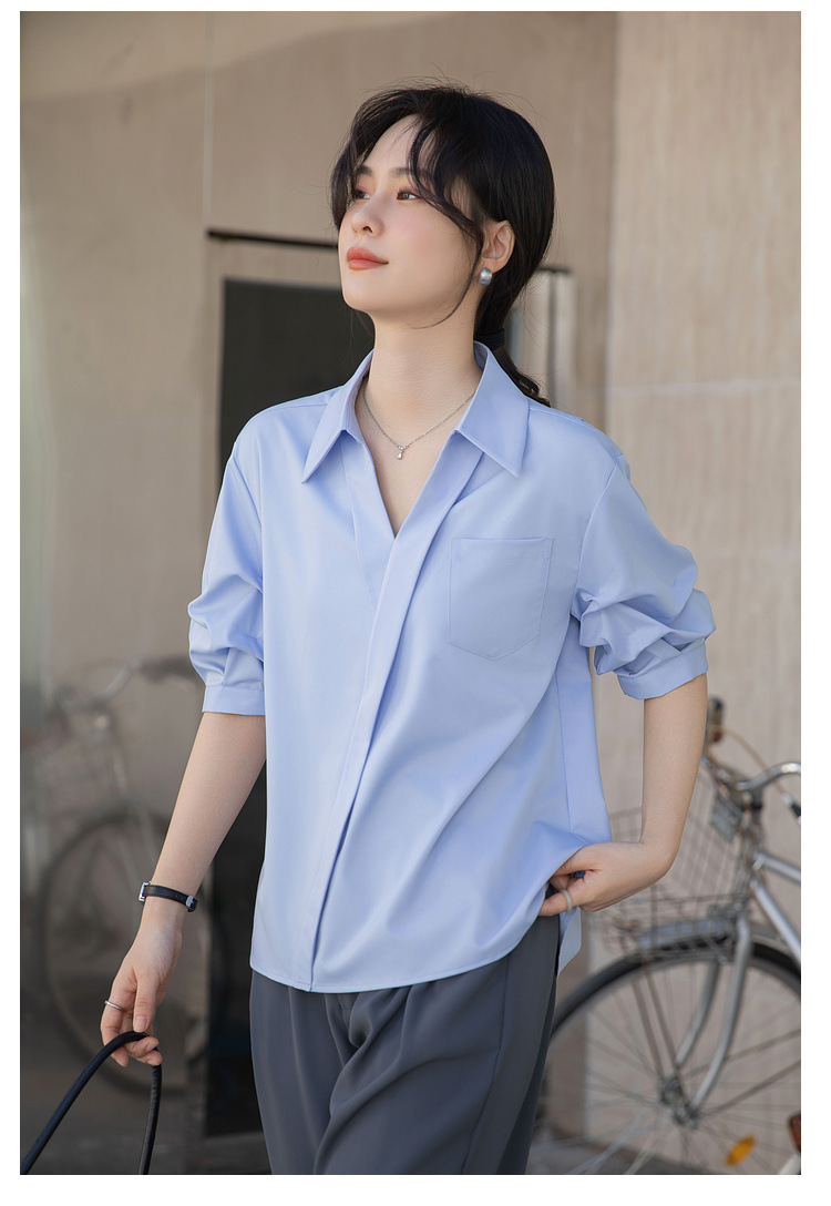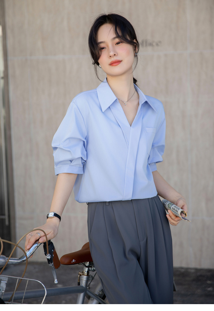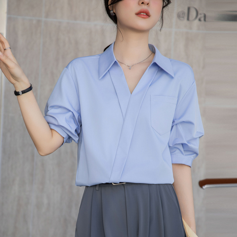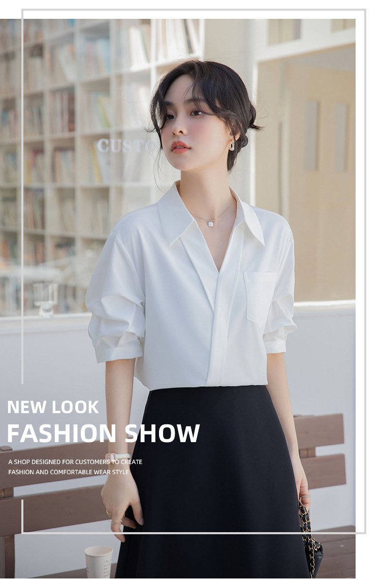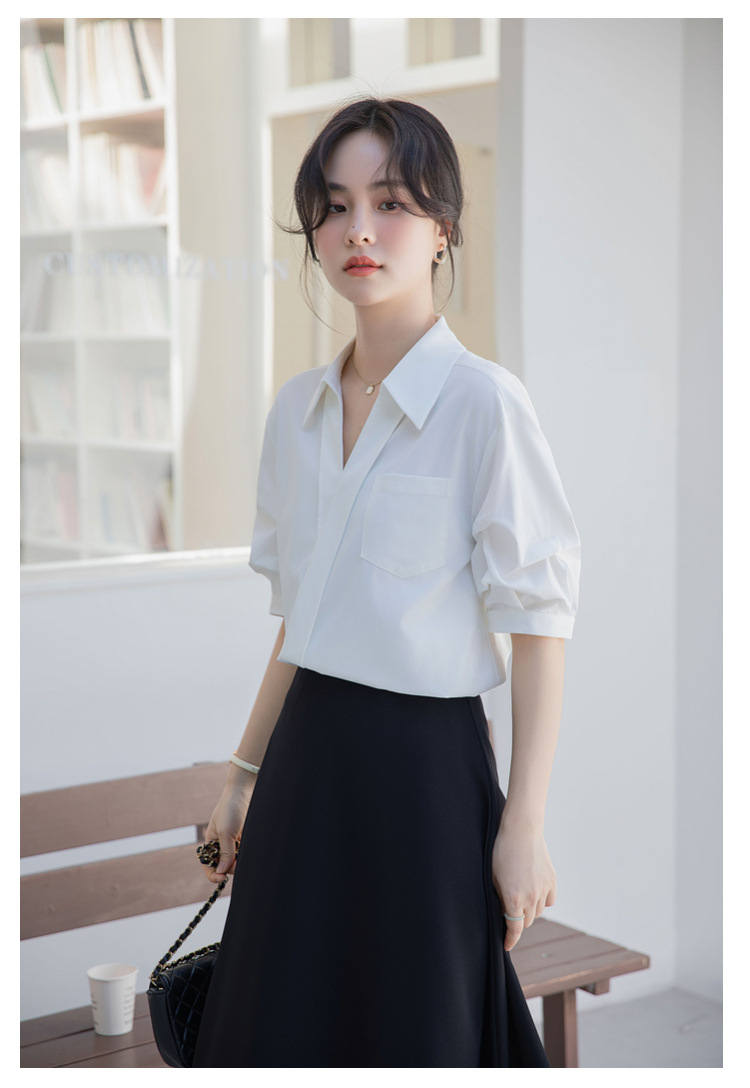 여성용 화이트 셔츠 2025 여름 새 스타일 캐주얼 루즈 전문 프렌치 니치 탑 v 넥 반팔 셔츠스토어 가기