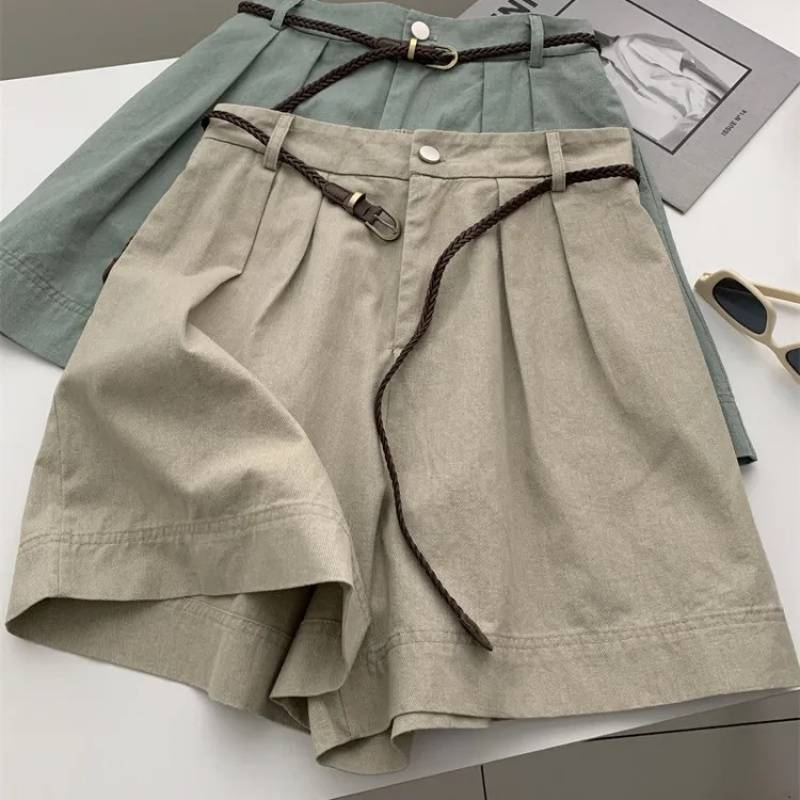 오래 된 문자 높은 허리 넓은 다리 반바지 여성 벨트 여름 느슨한 슬리밍 유행 올 매치 캐주얼 바지 유행