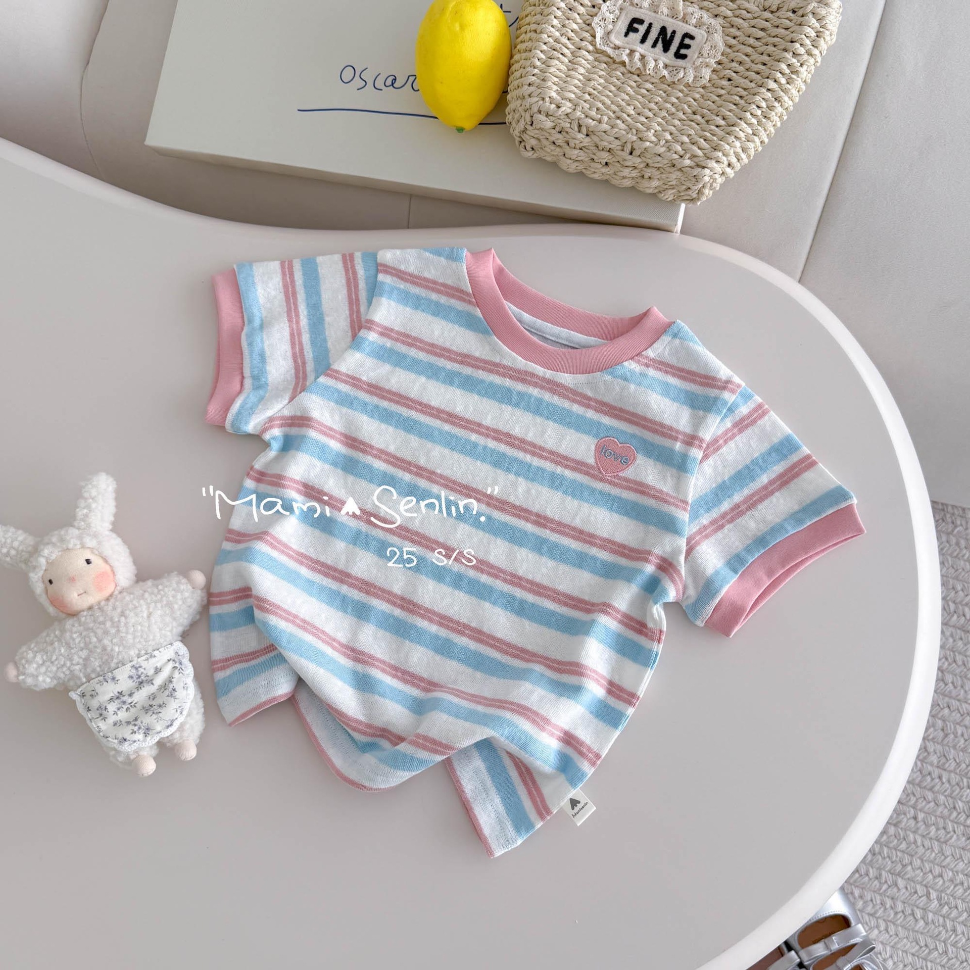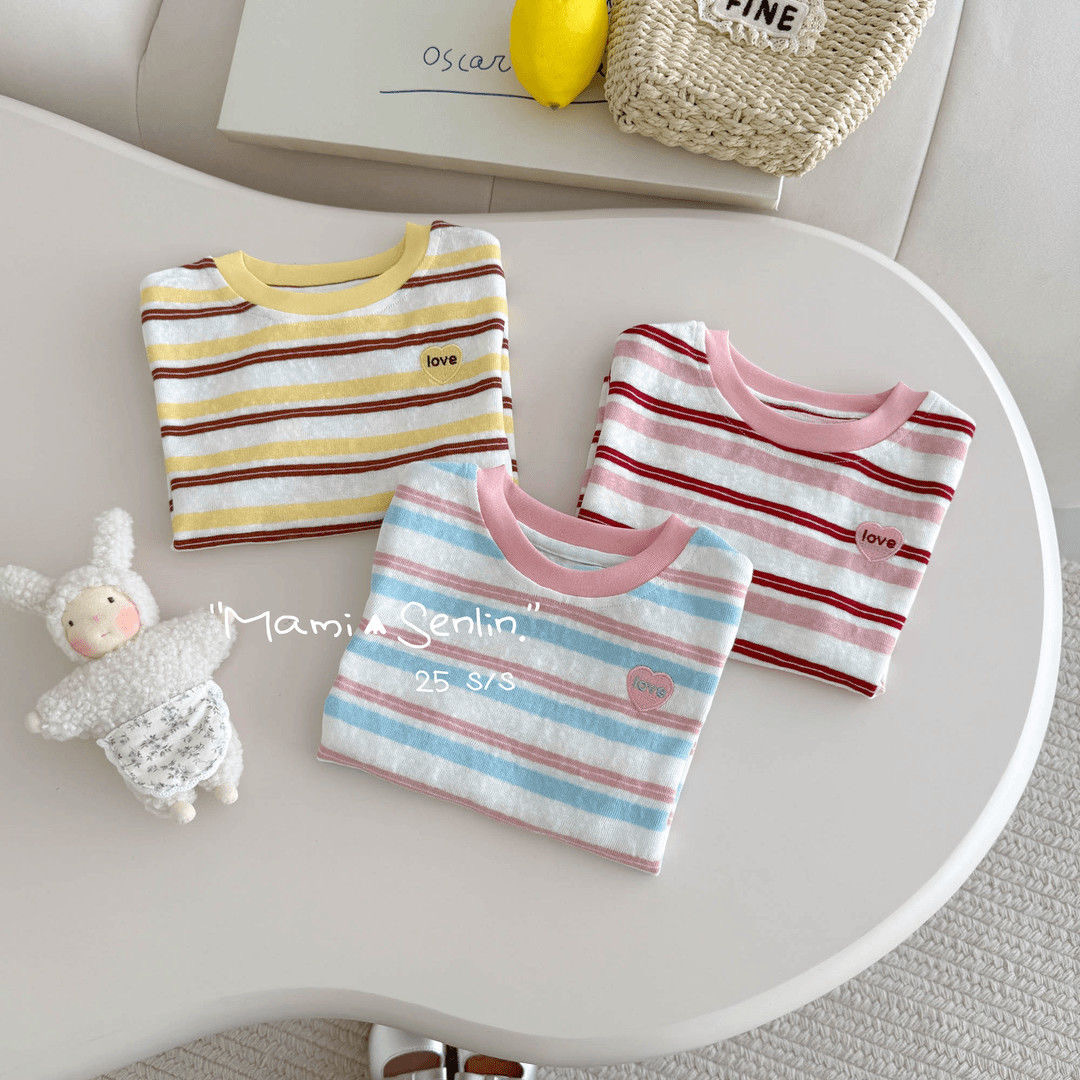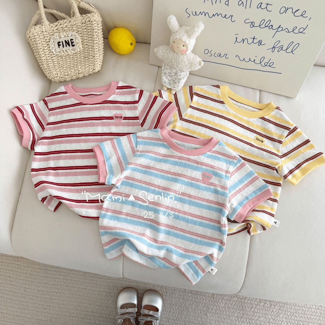 【48시간 배송】여름 아동 여아 반팔 티셔츠 한국 스타일 다용도 배색 칼라 하트 자수 스트라이프 이너웨어