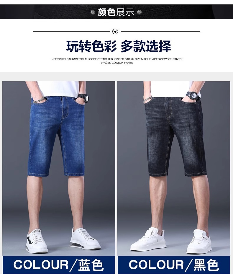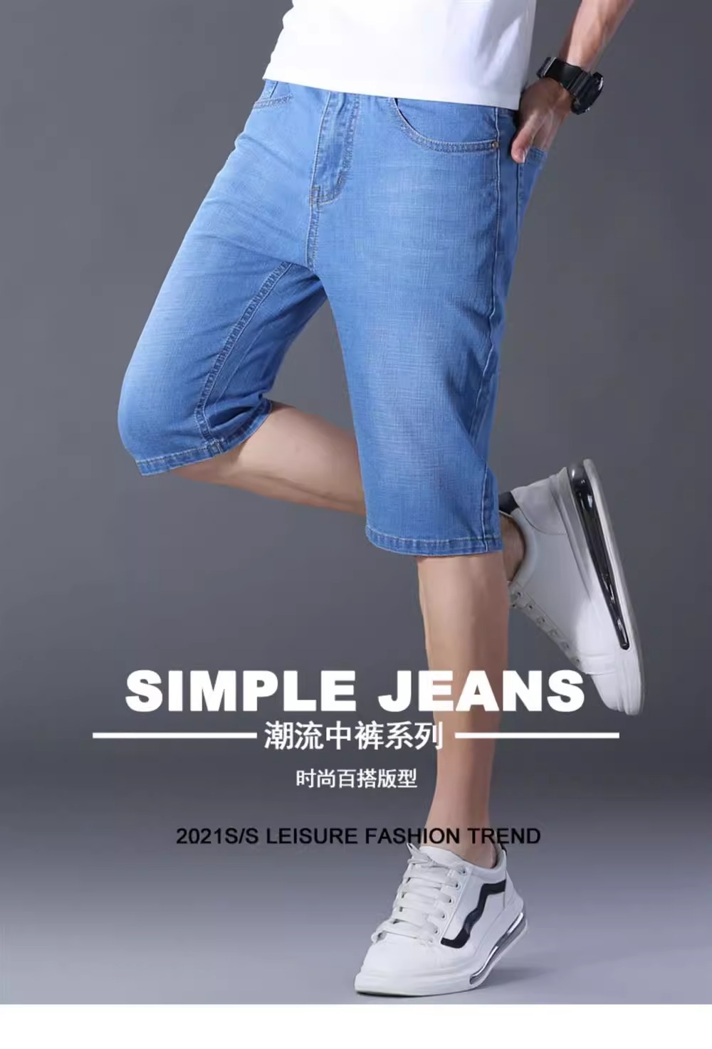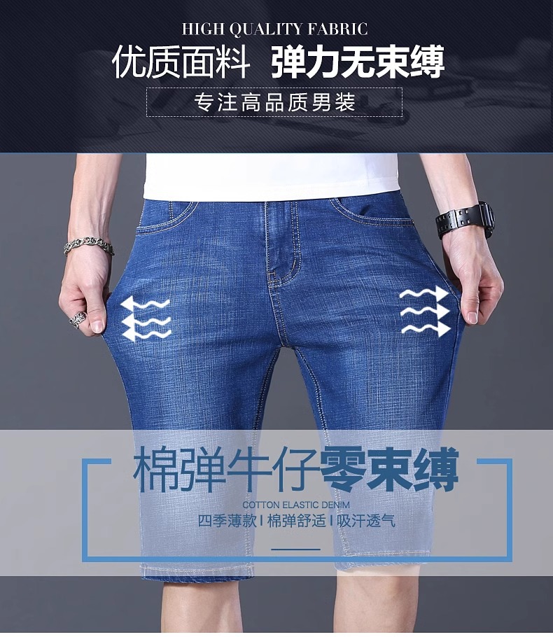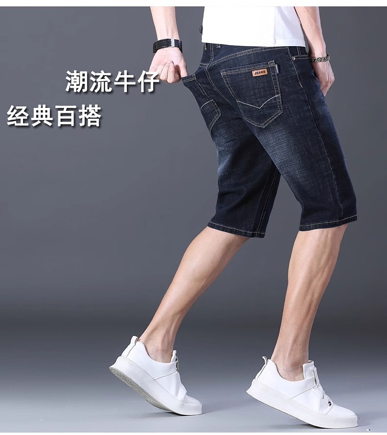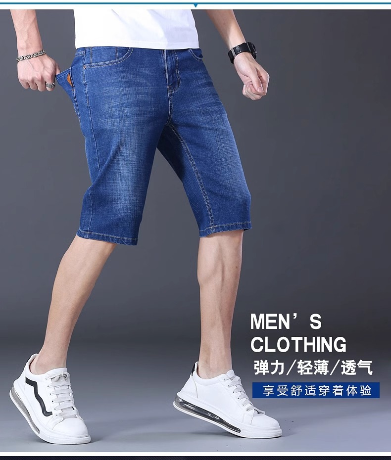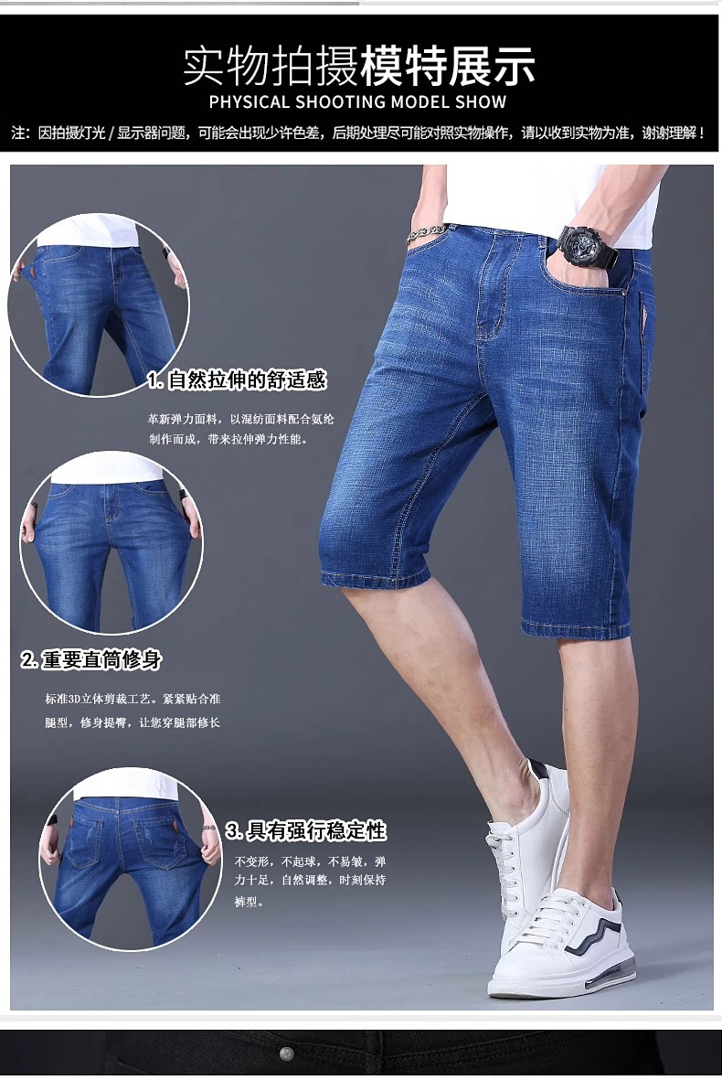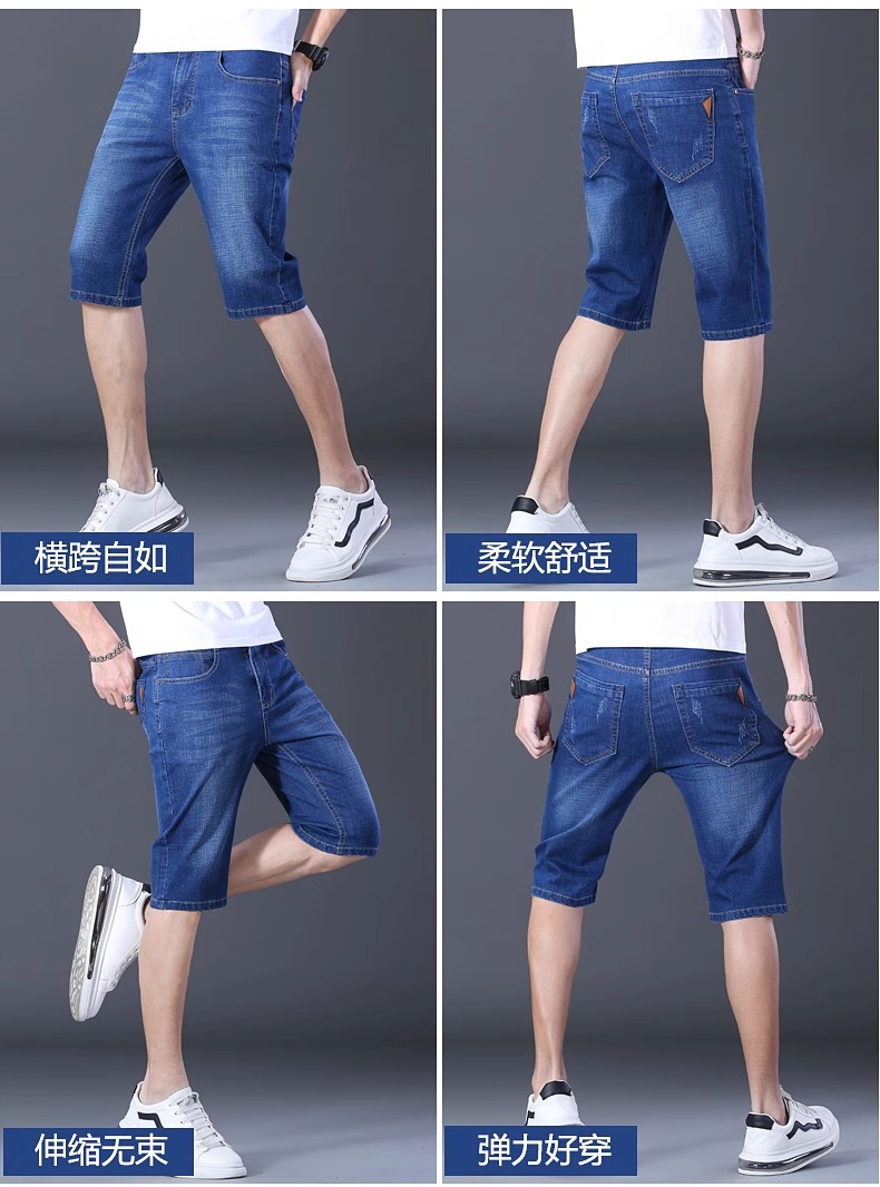 신축성 있는 데님 반바지 남성 여름 얇은 루즈 스트레이트 한국 스타일 트렌디 5부 캐주얼 미드팬츠 남성 7부 팬츠