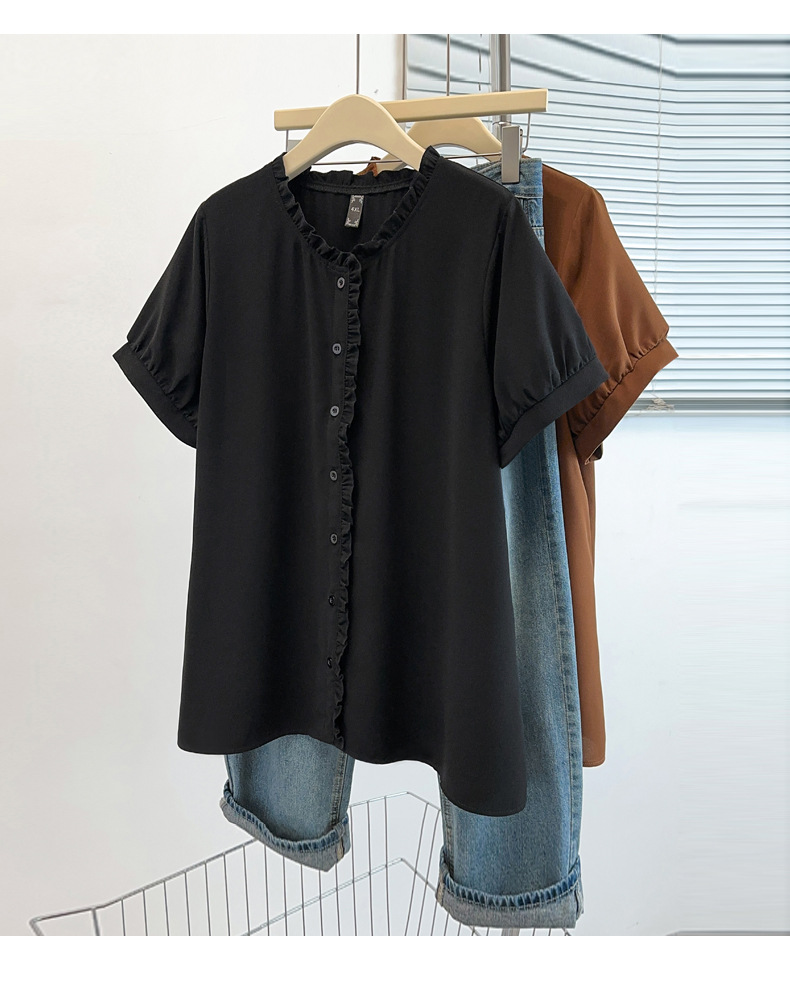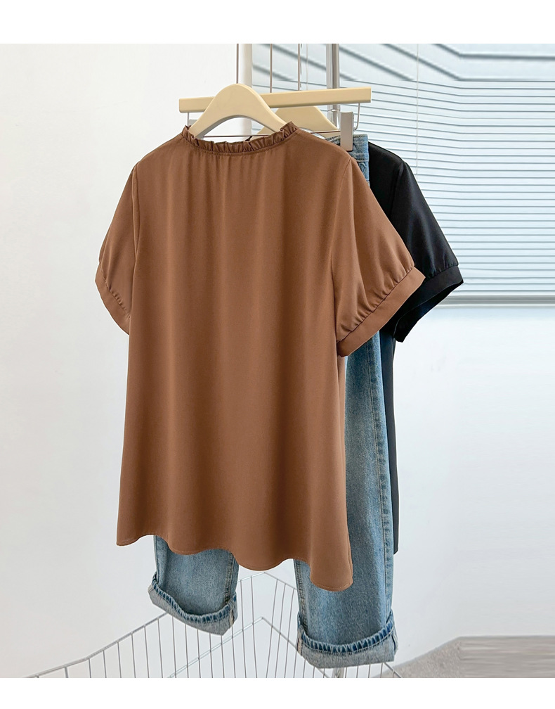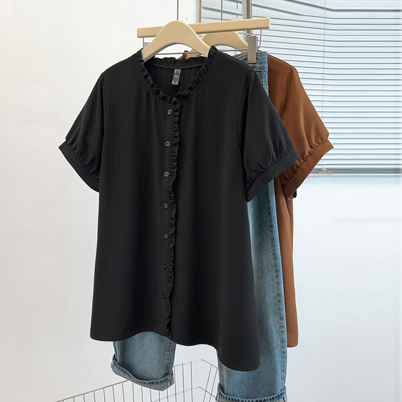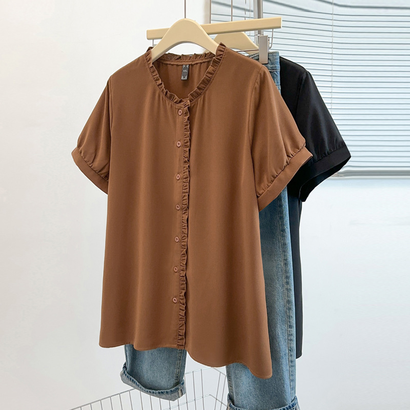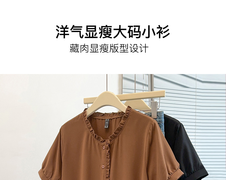 플러스 사이즈 짧은 소매 쉬폰 셔츠 여성용 서양식 여름 통통녀 느슨한 슬림 셔츠 탑 벨리 커버 셔츠 25009T
