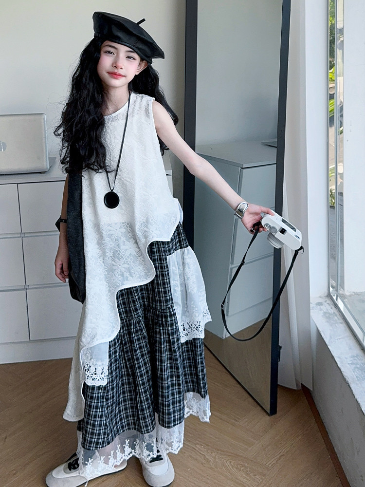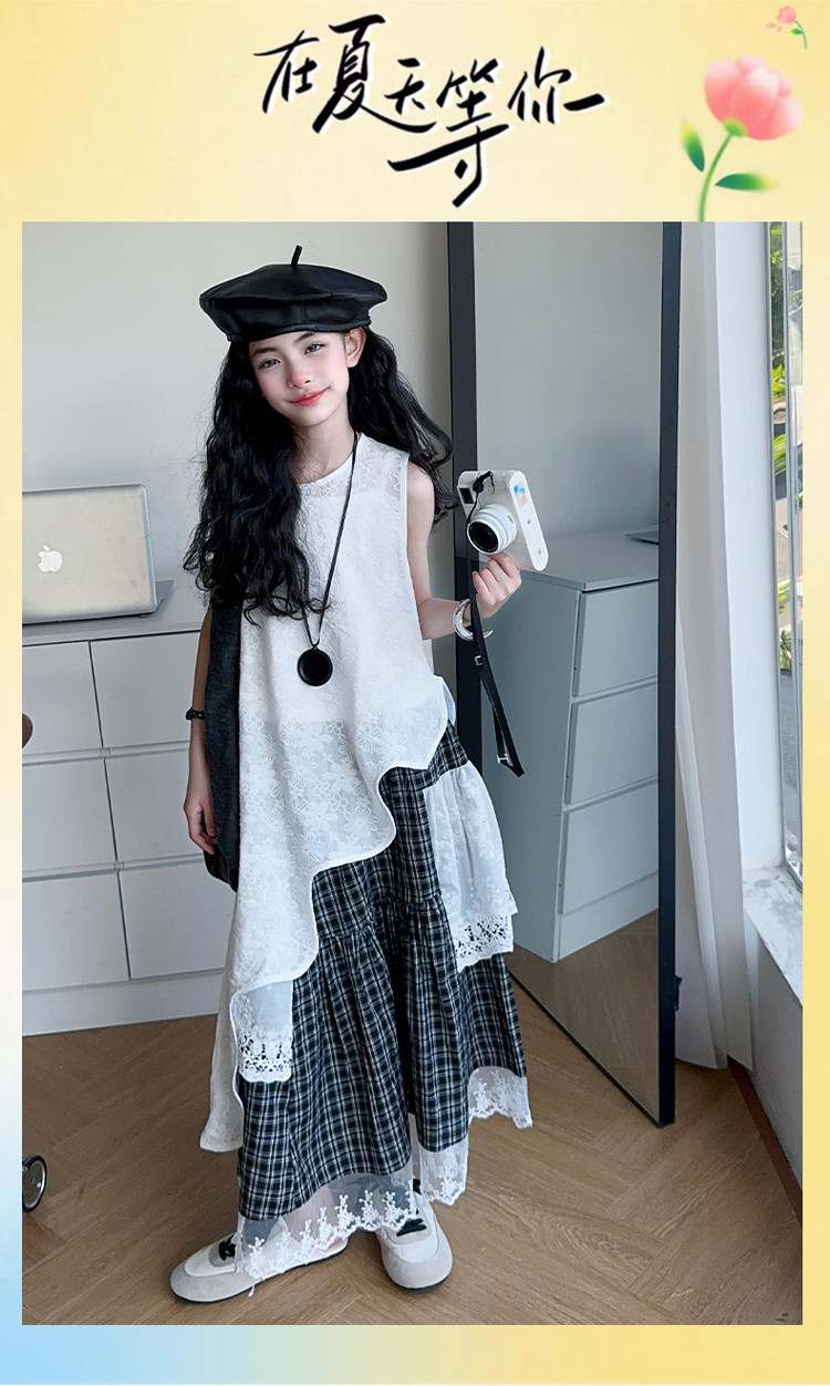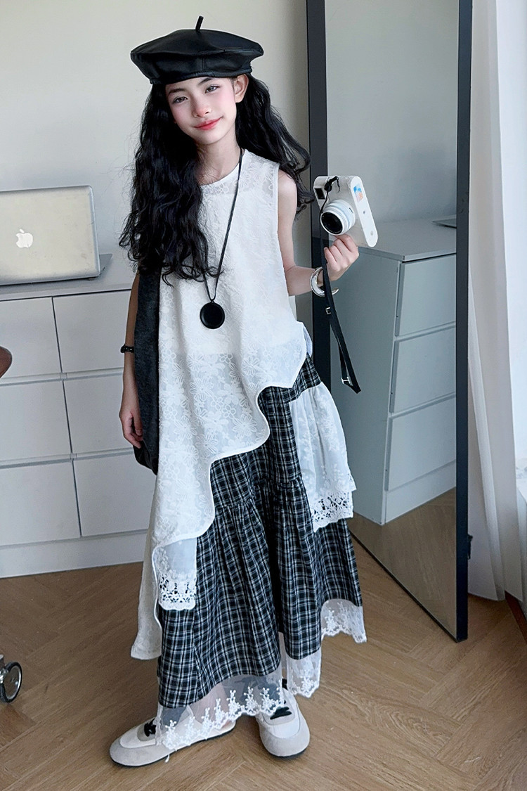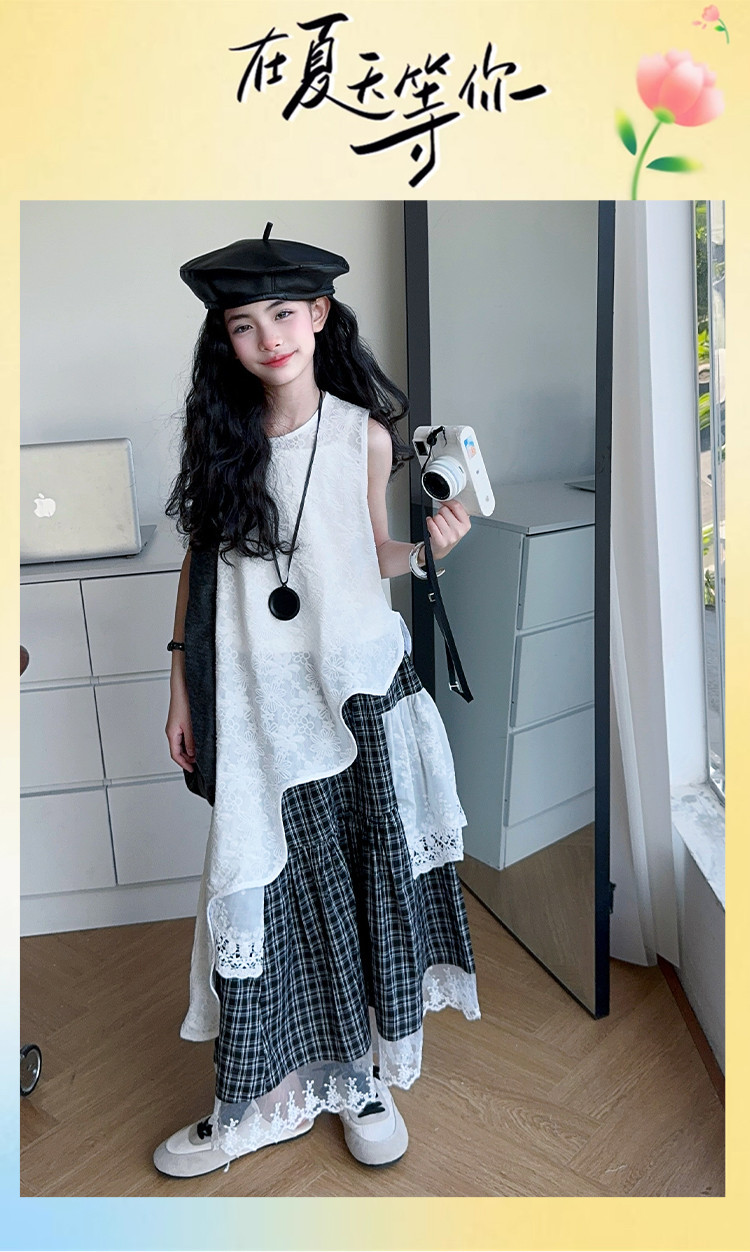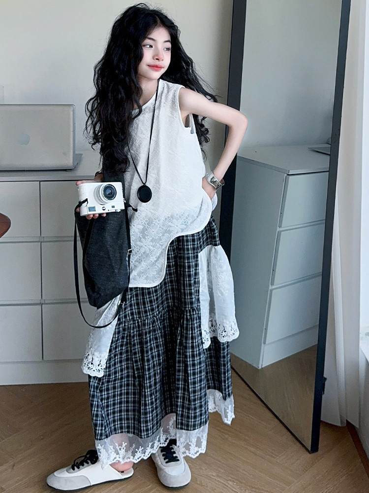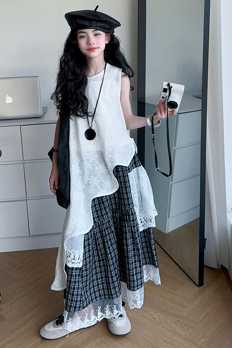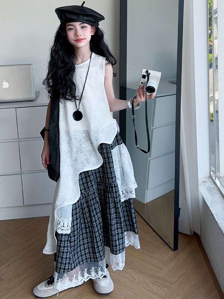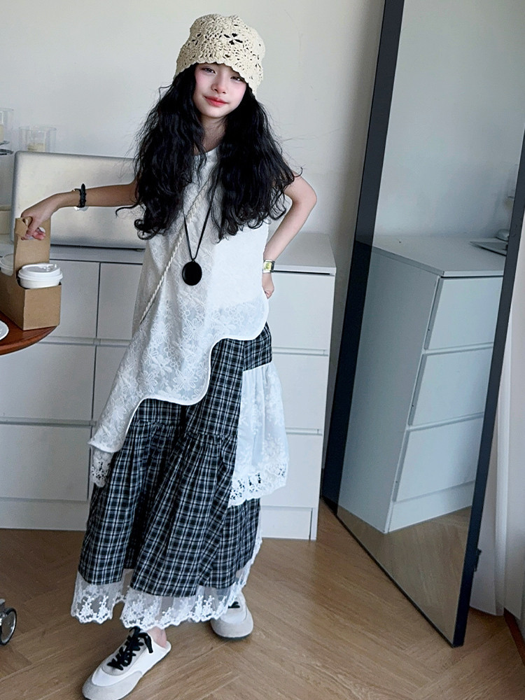 여자 여름 세트 2025 여름 새로운 어린이 한국 스타일 레이스 블라우스 내부 격자 무늬 스커트 3 조각 세트