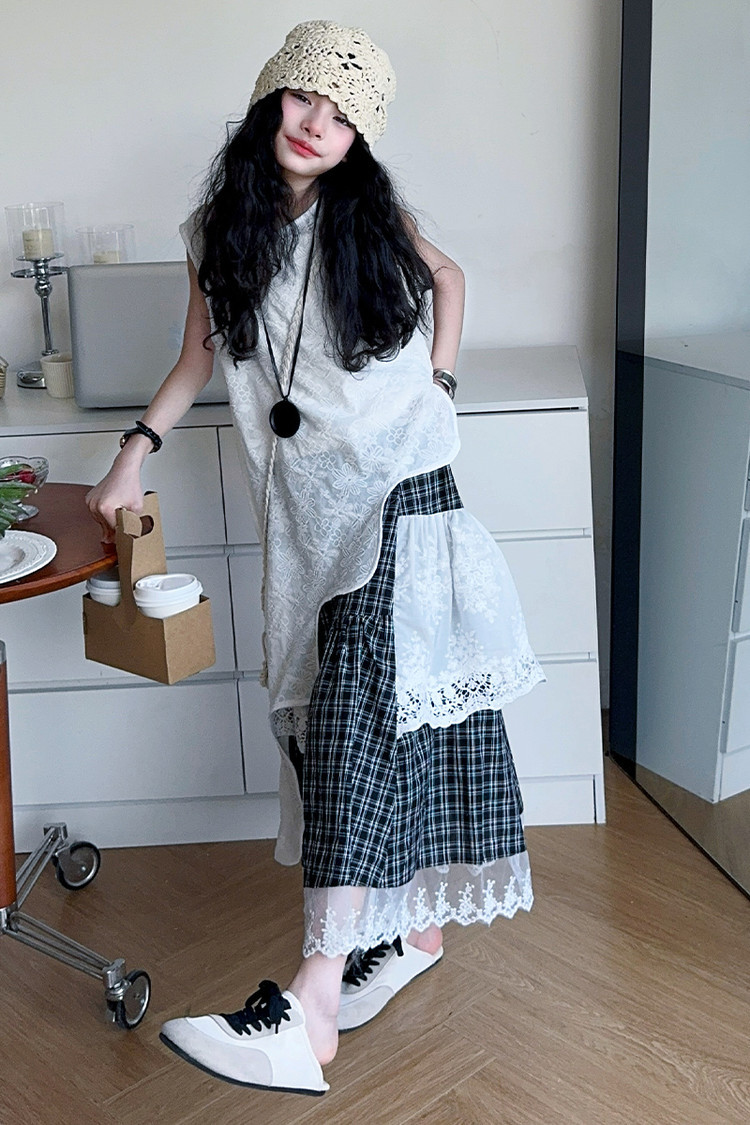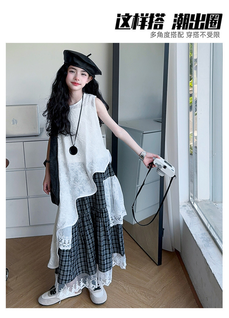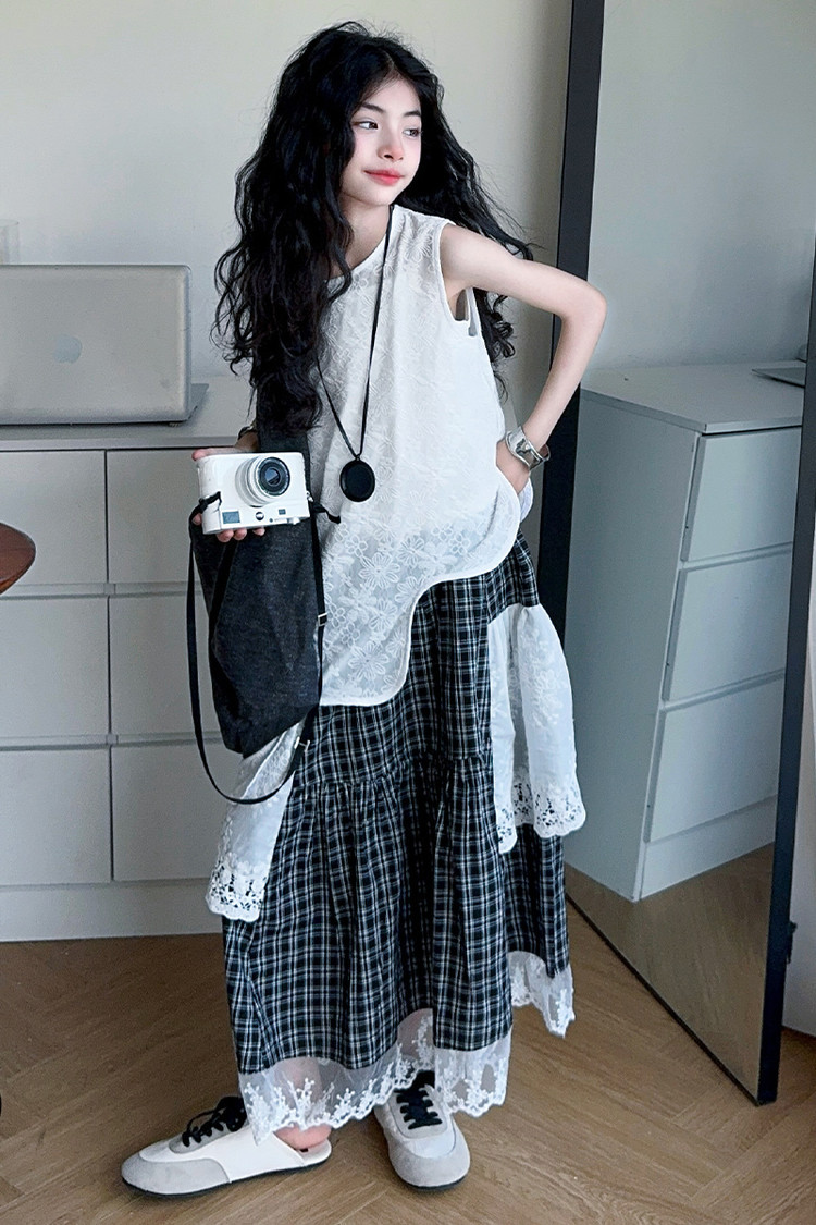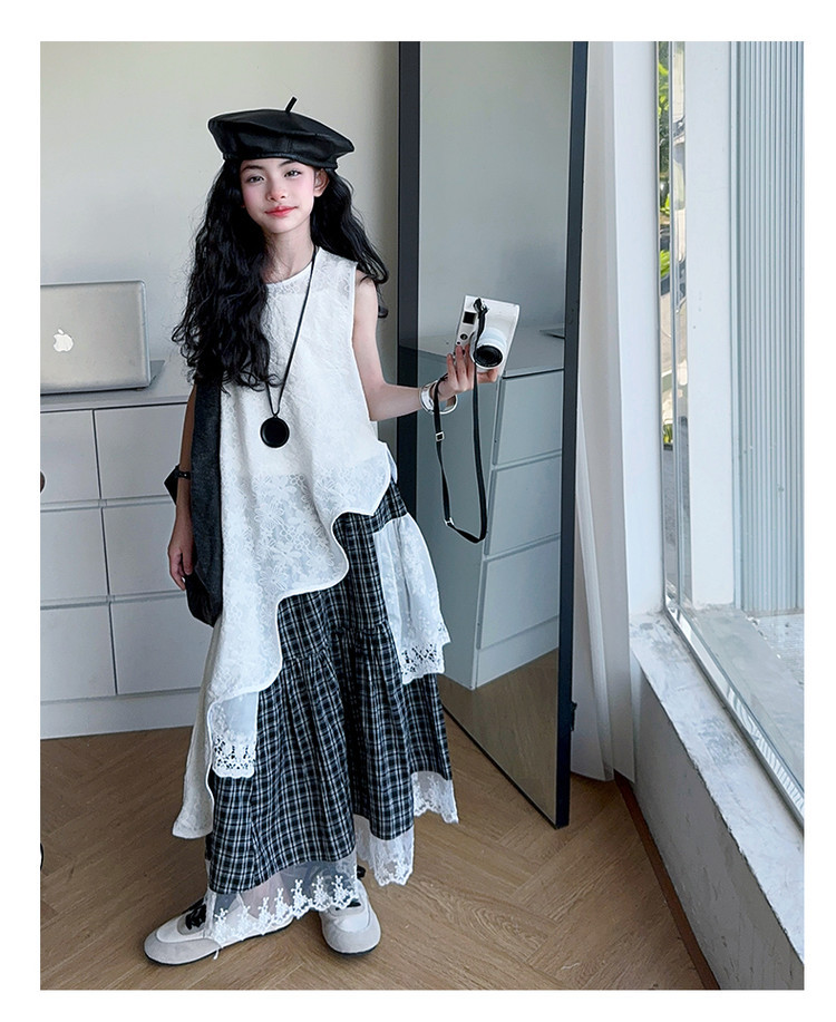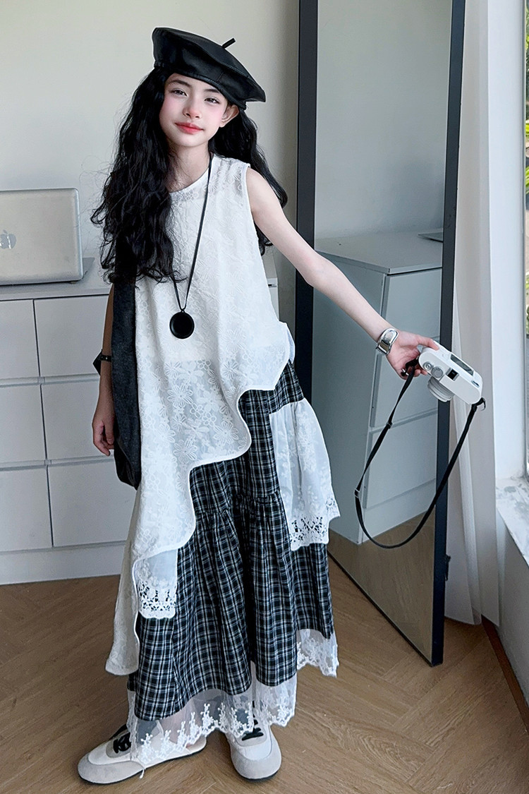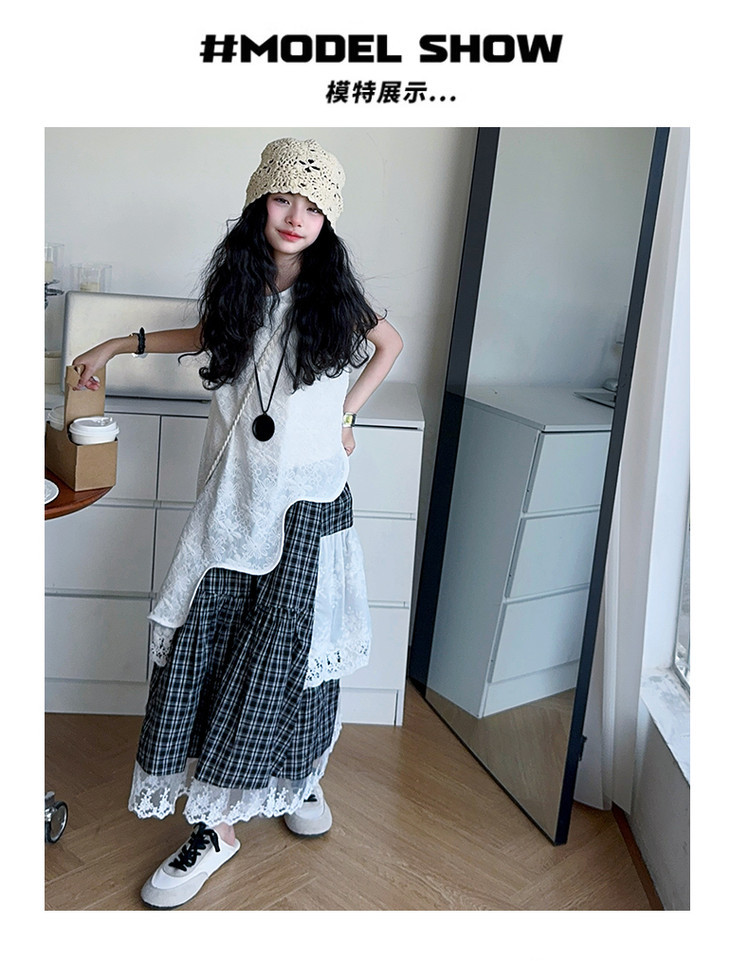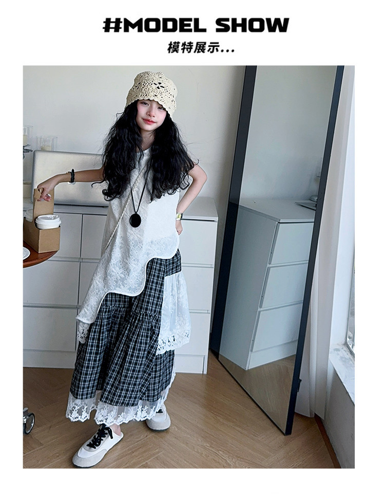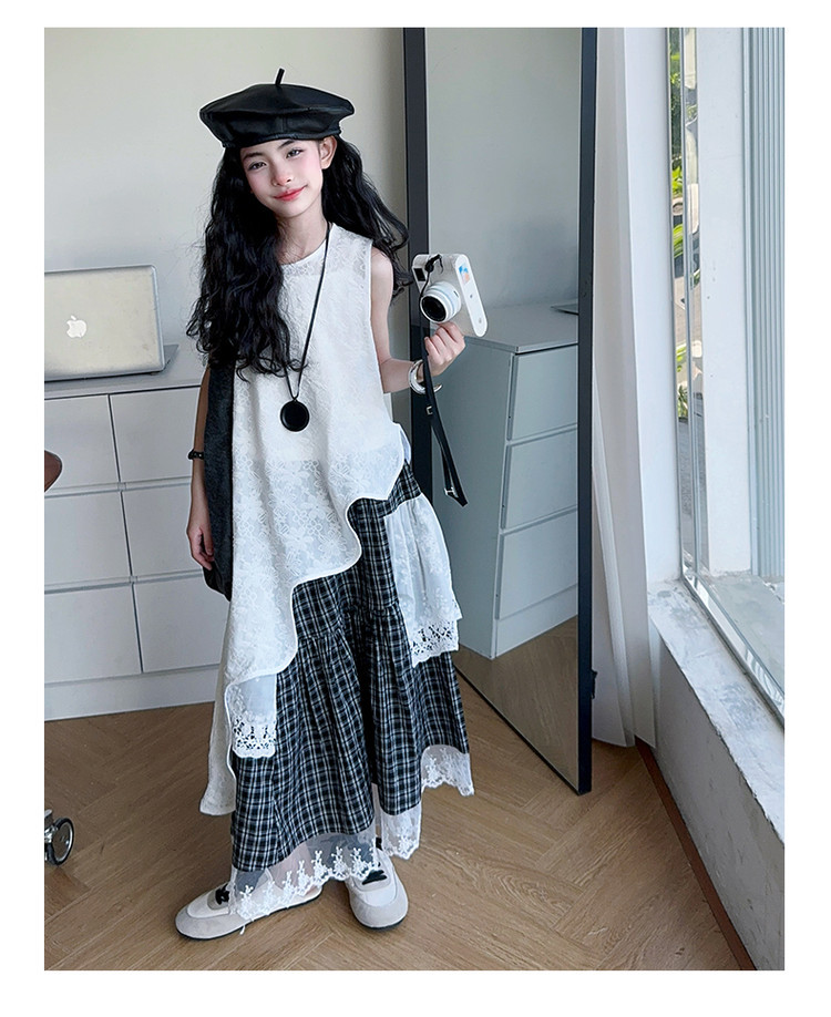 여자 여름 세트 2025 여름 새로운 어린이 한국 스타일 레이스 블라우스 내부 격자 무늬 스커트 3 조각 세트