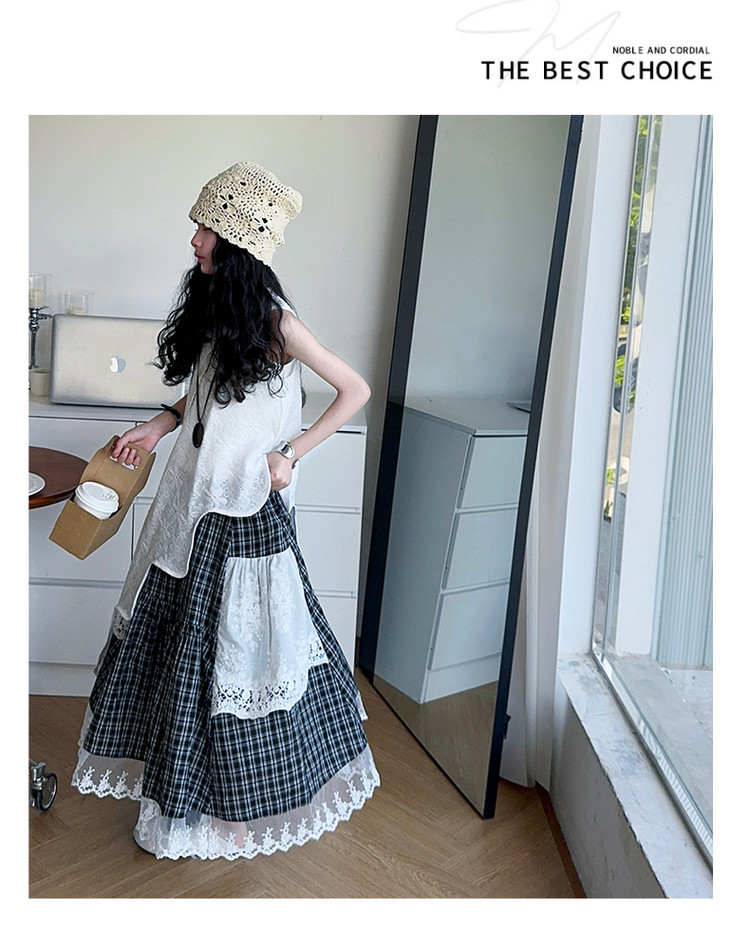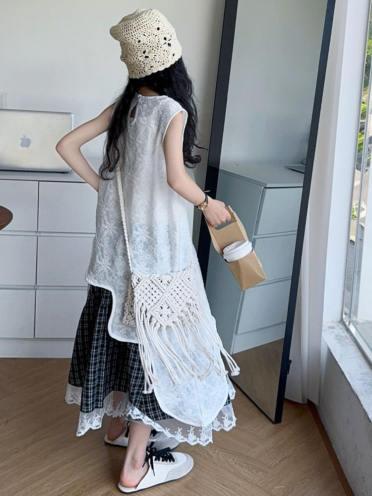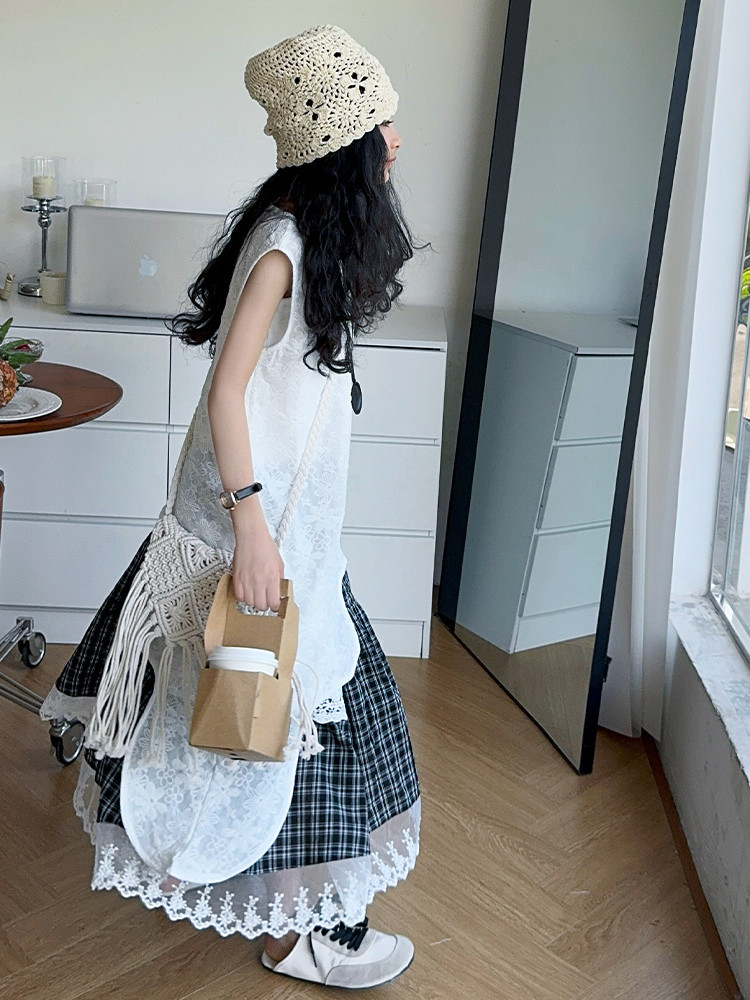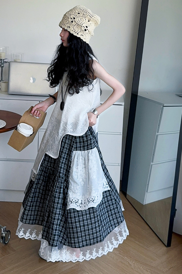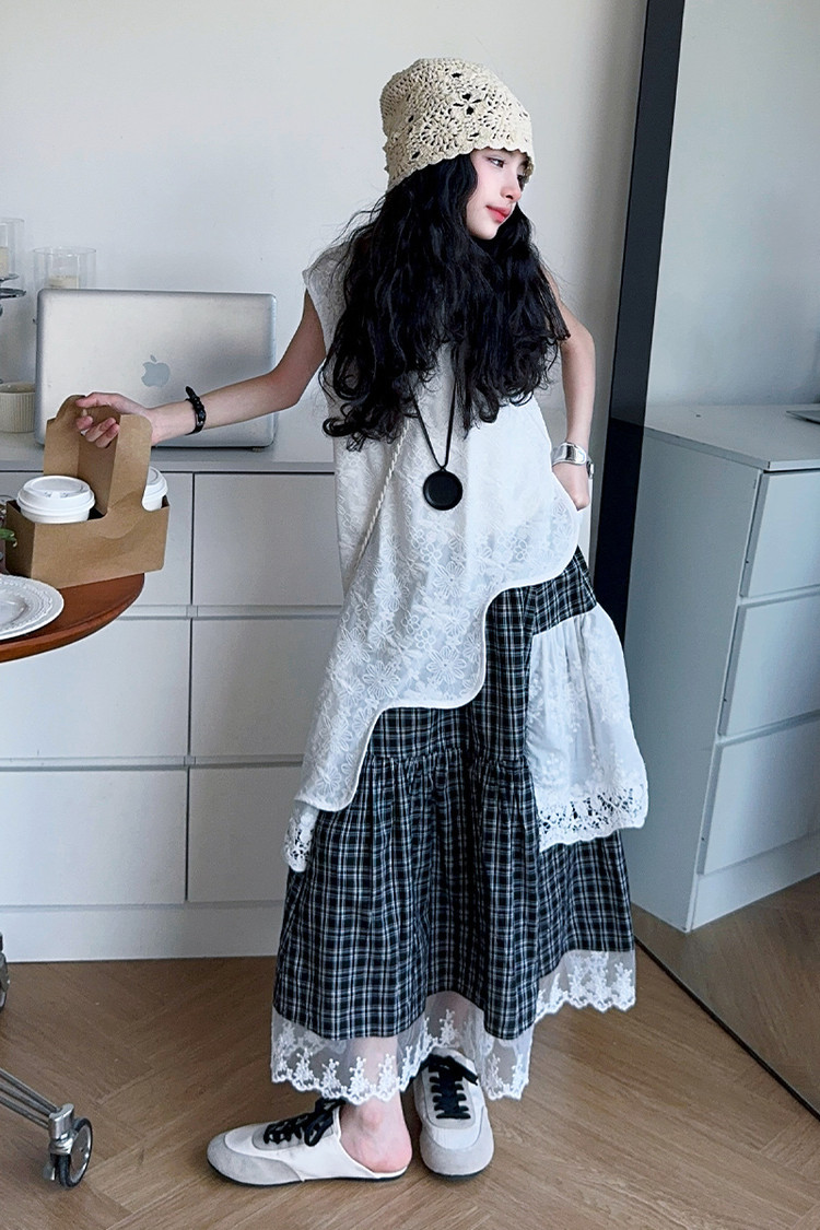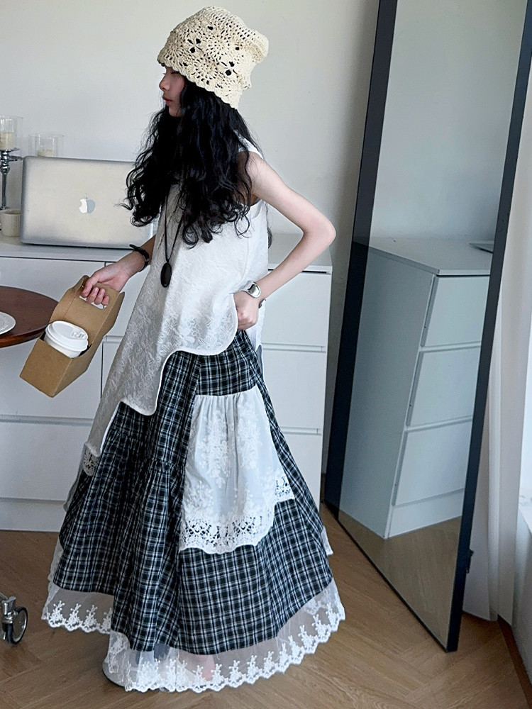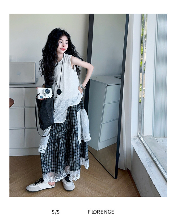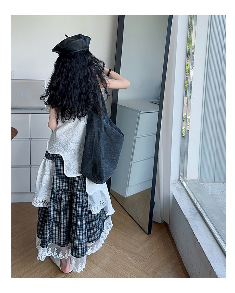 여자 여름 세트 2025 여름 새로운 어린이 한국 스타일 레이스 블라우스 내부 격자 무늬 스커트 3 조각 세트