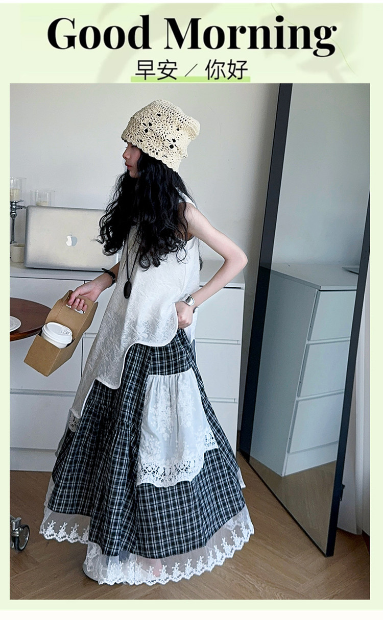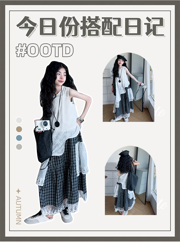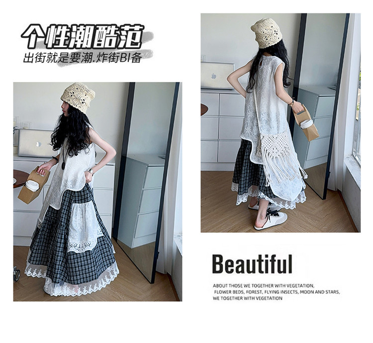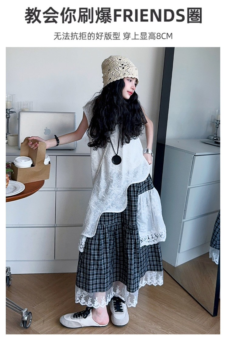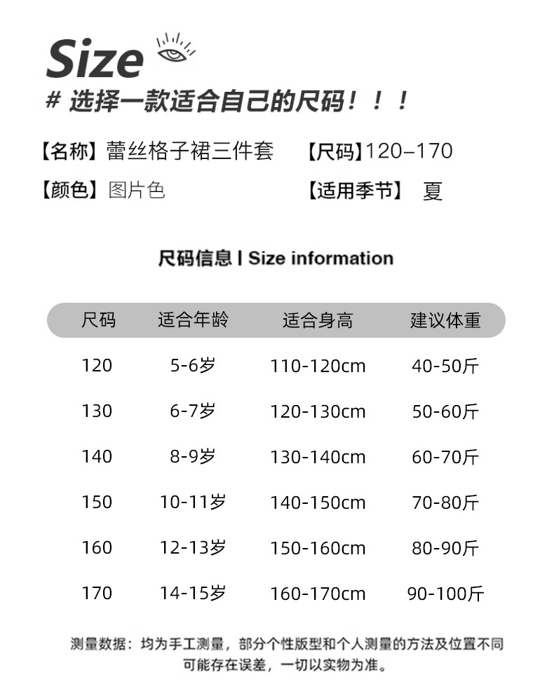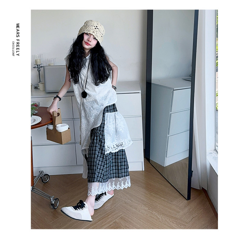 여자 여름 세트 2025 여름 새로운 어린이 한국 스타일 레이스 블라우스 내부 격자 무늬 스커트 3 조각 세트스토어 가기