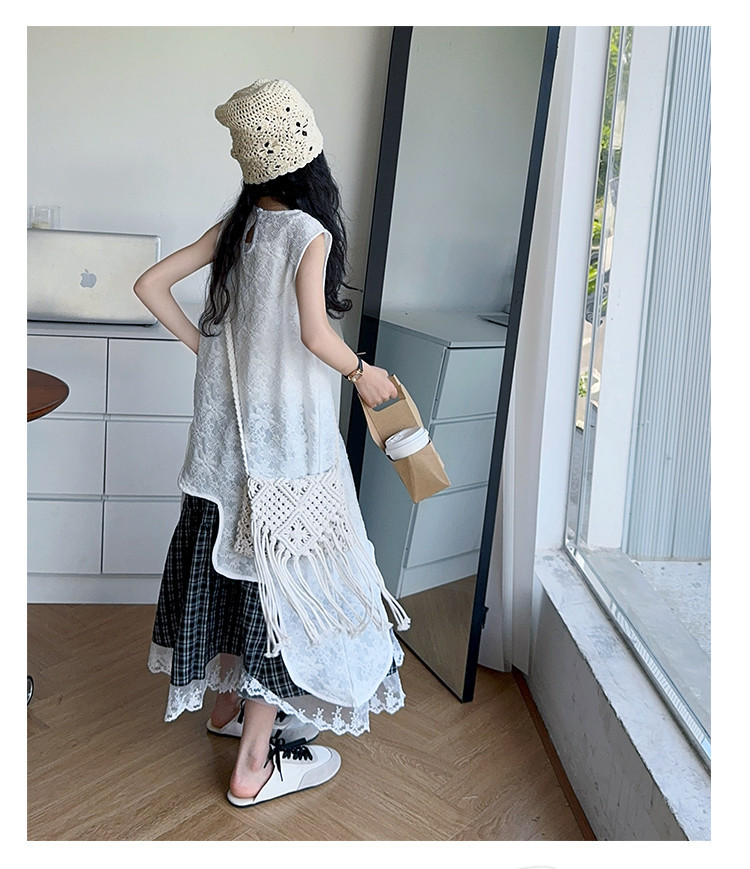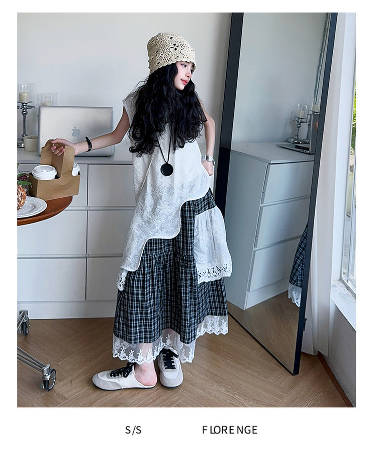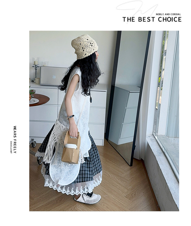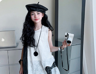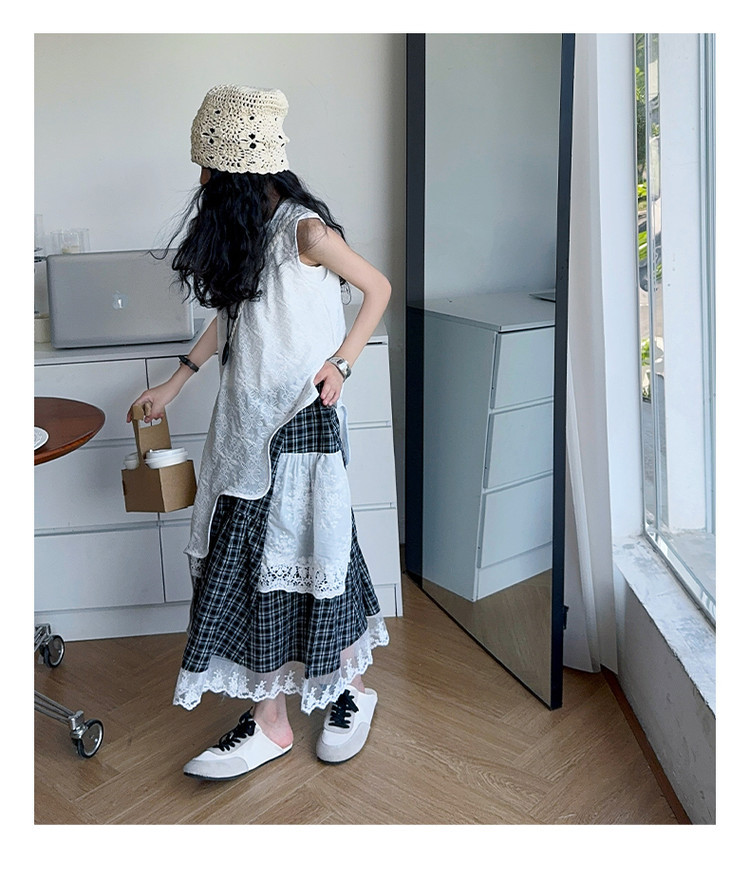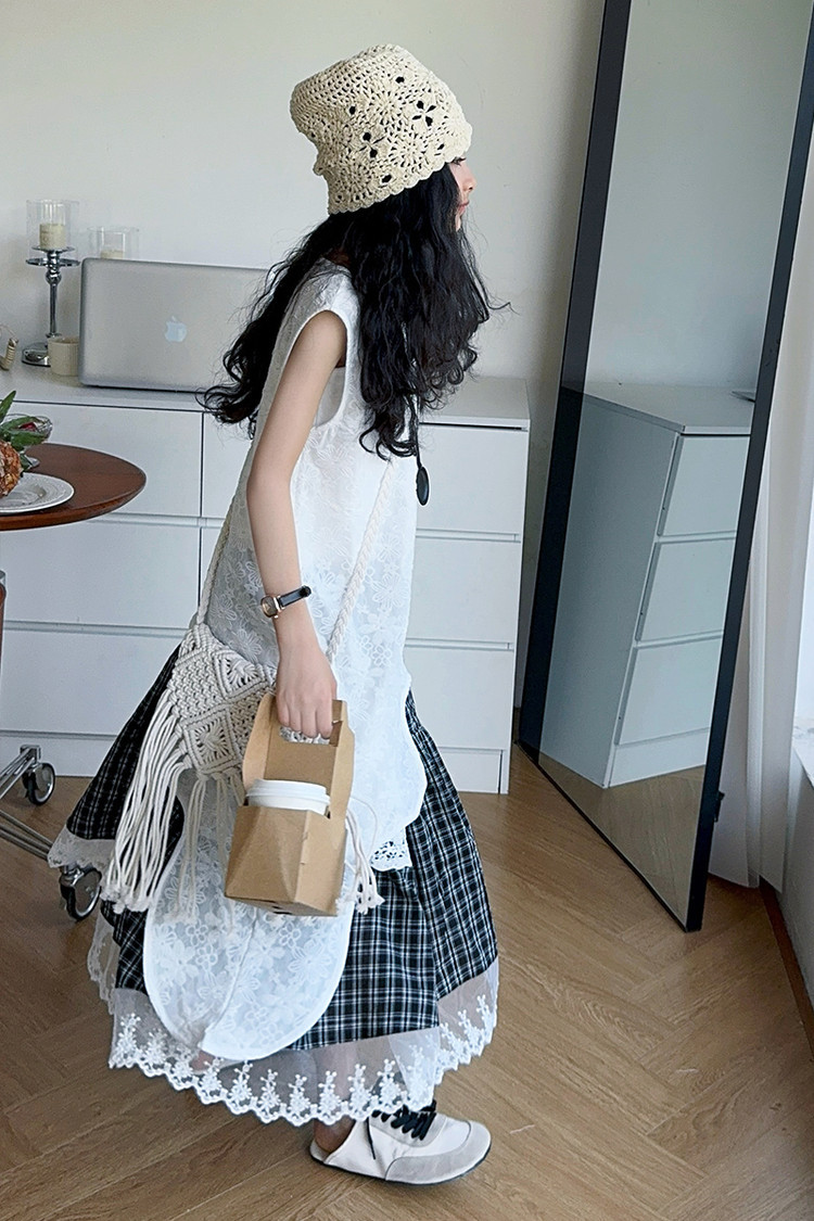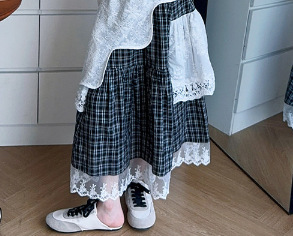 여자 여름 세트 2025 여름 새로운 어린이 한국 스타일 레이스 블라우스 내부 격자 무늬 스커트 3 조각 세트스토어 가기
