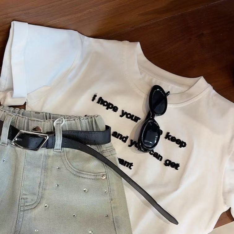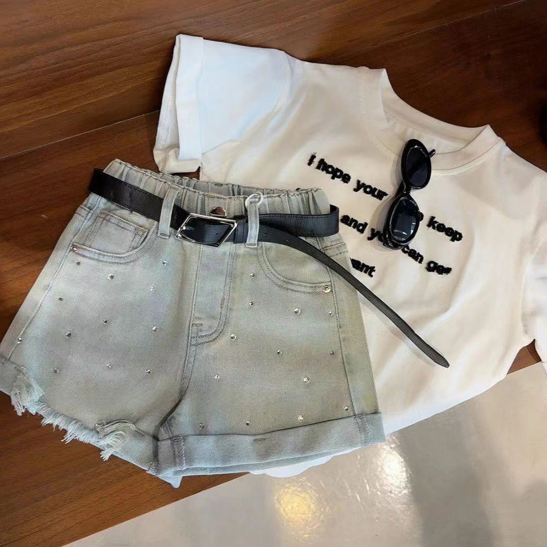 여자 여름 2025 반팔 세트 어린이 한국식 프린트 티셔츠 여성용 보석 박힌 데님 반바지 여름 착용