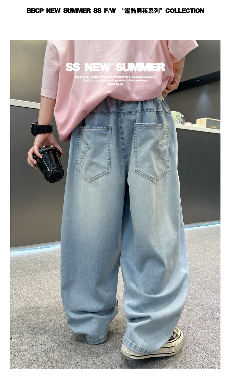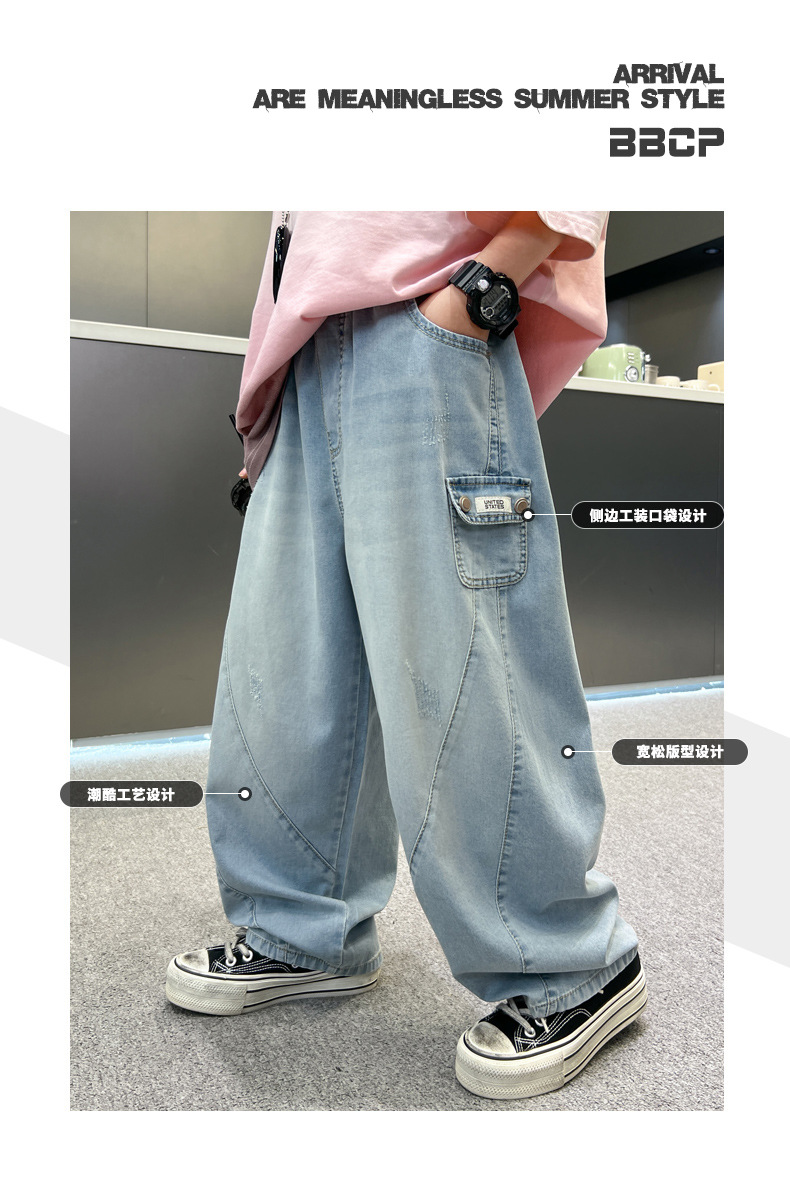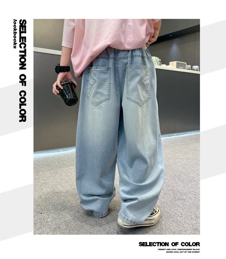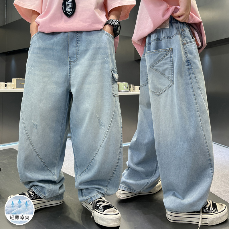 소년 여름 얇은 데님 바지 2025 새로운 스타일 소년의 멋진 스트리트 스타일 중대형 어린이의 느슨하고 다재다능한 모기 방지 바지