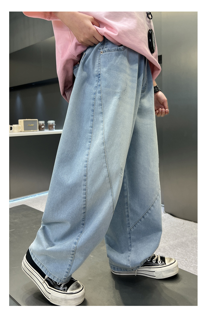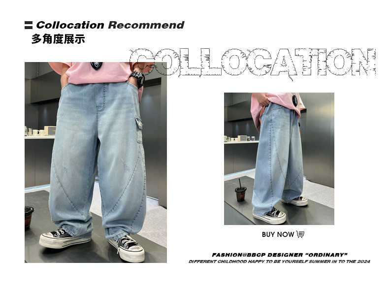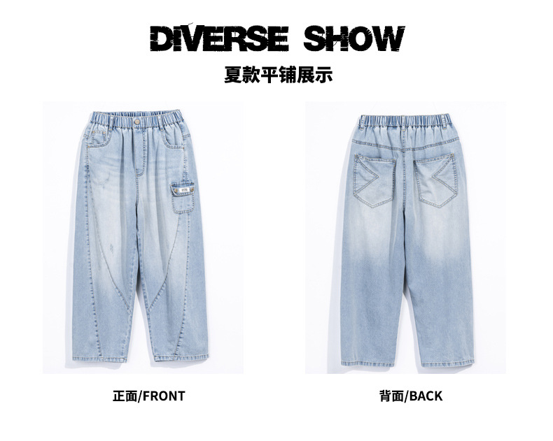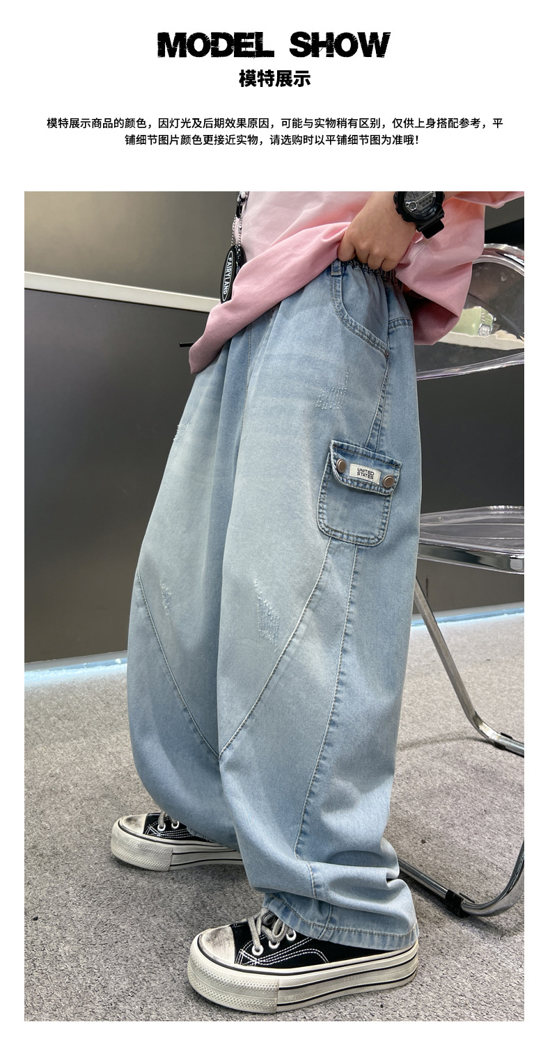 소년 여름 얇은 데님 바지 2025 새로운 스타일 소년의 멋진 스트리트 스타일 중대형 어린이의 느슨하고 다재다능한 모기 방지 바지스토어 가기