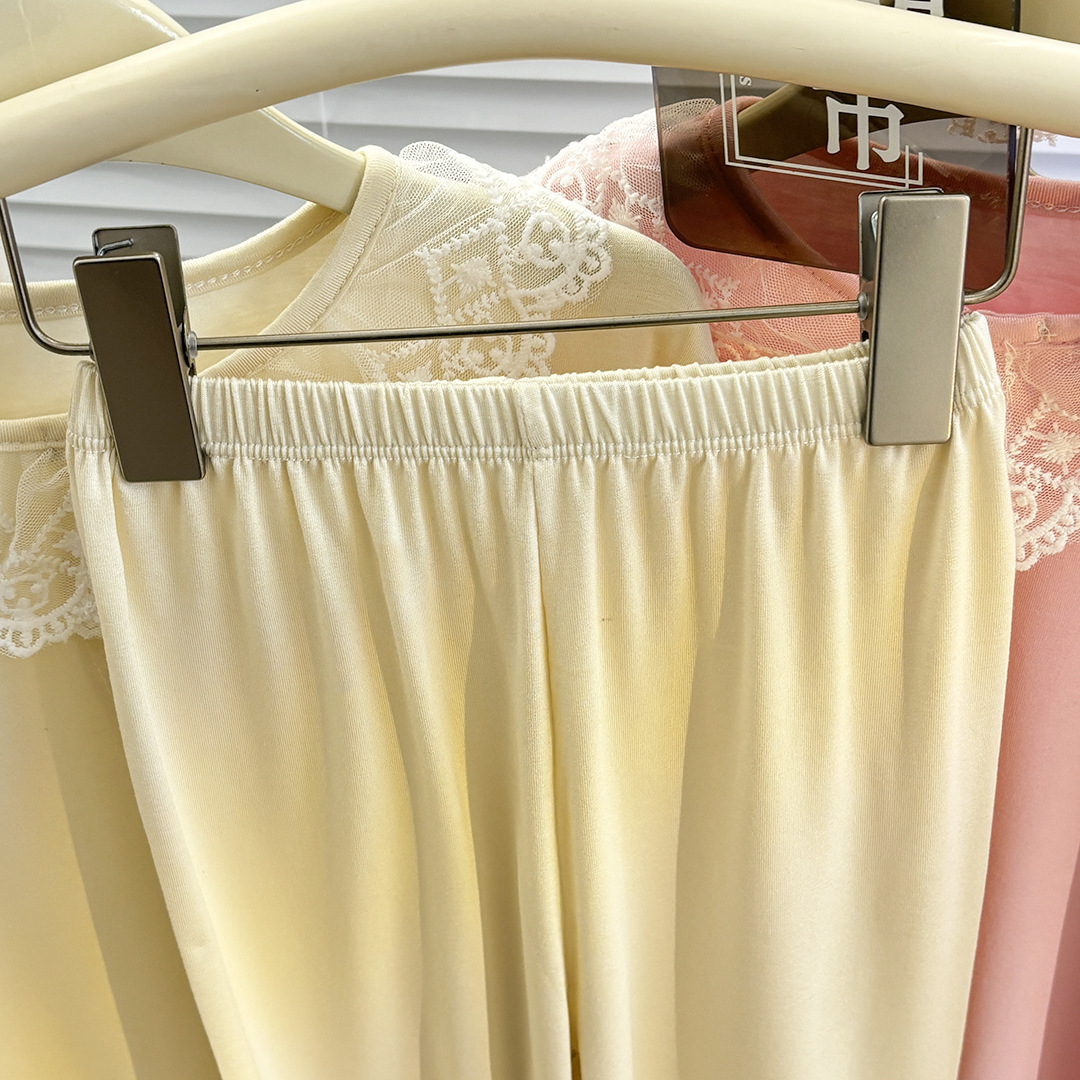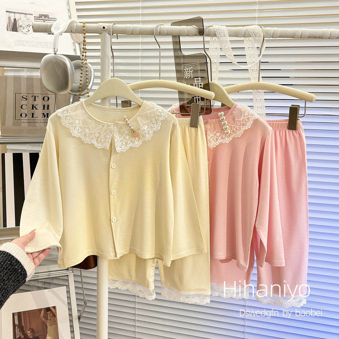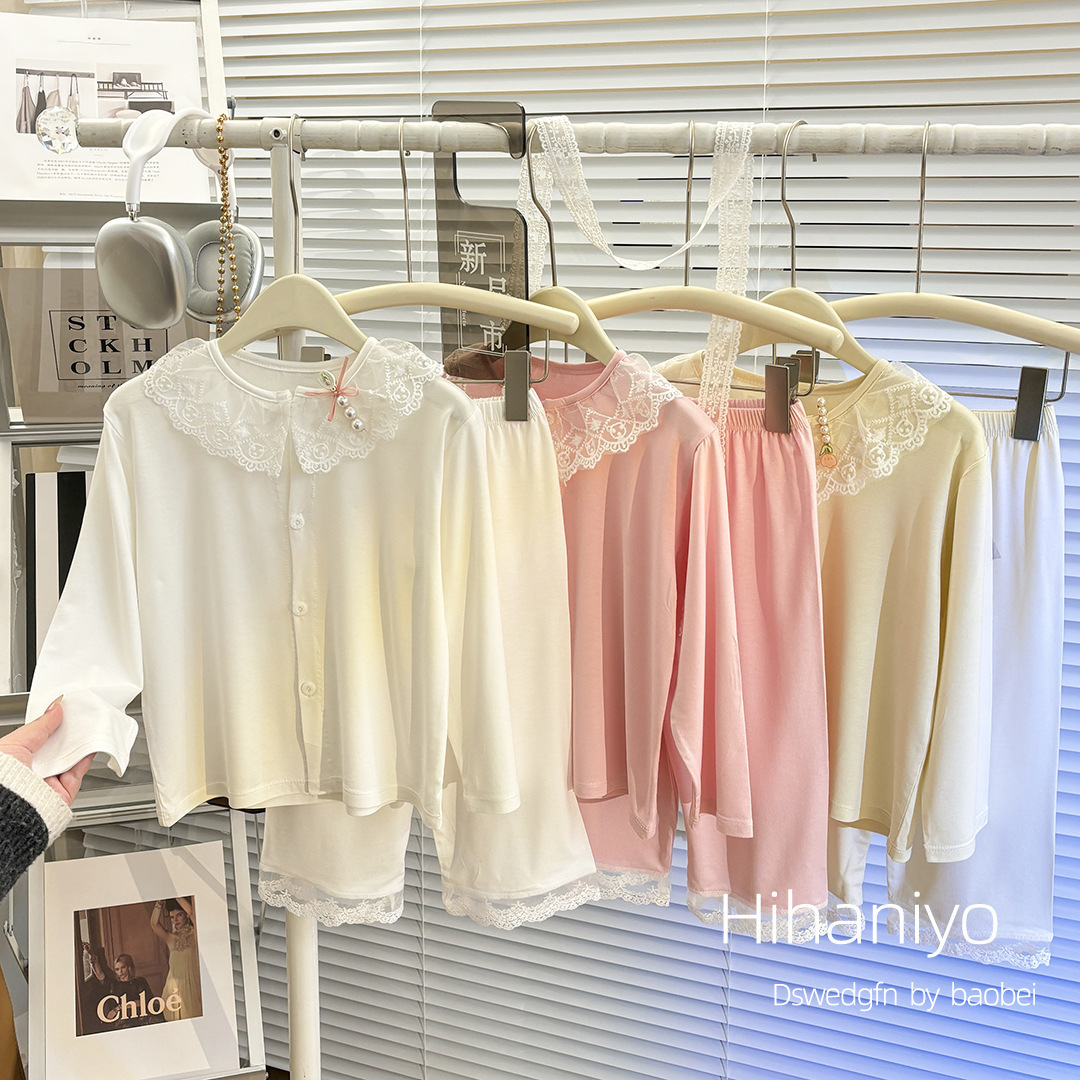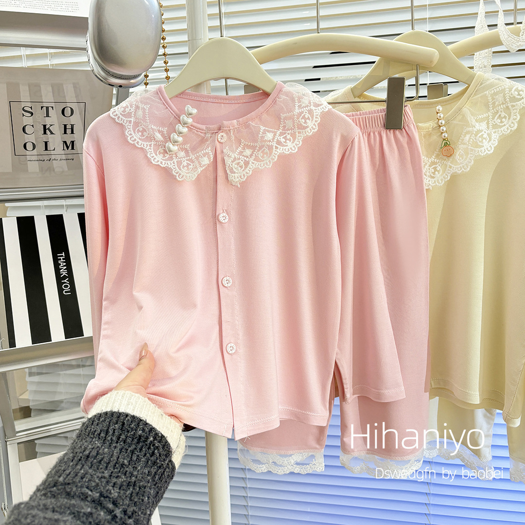 여아 신작 봄 여름 가디건 모달 레이스 칼라 긴팔 잠옷 세트, 큰 어린이를 위한 부모-자식 가정복스토어 가기