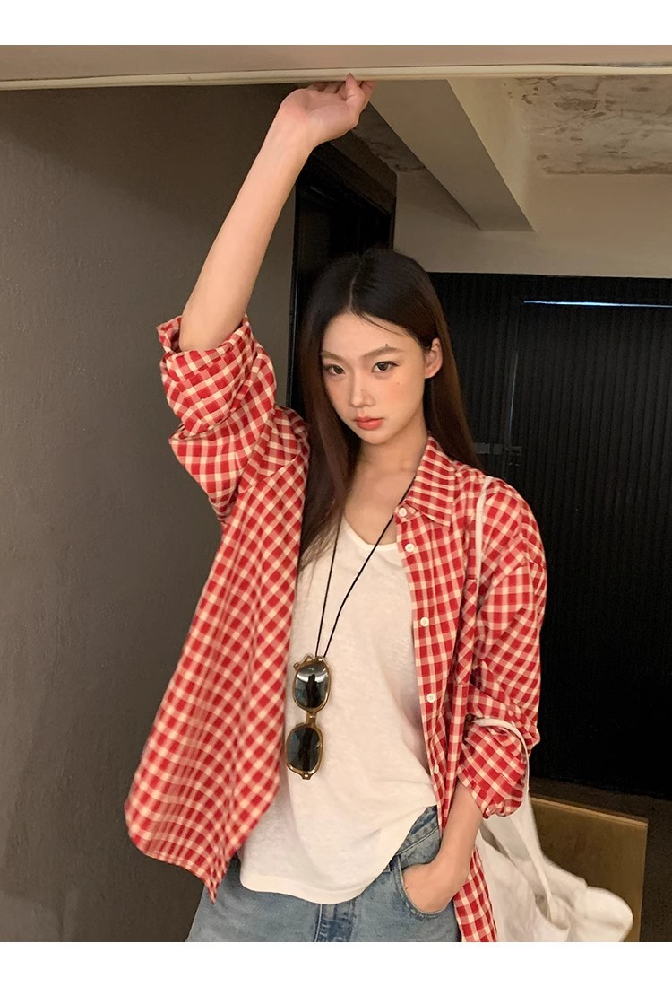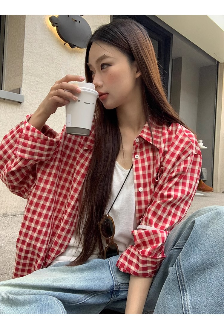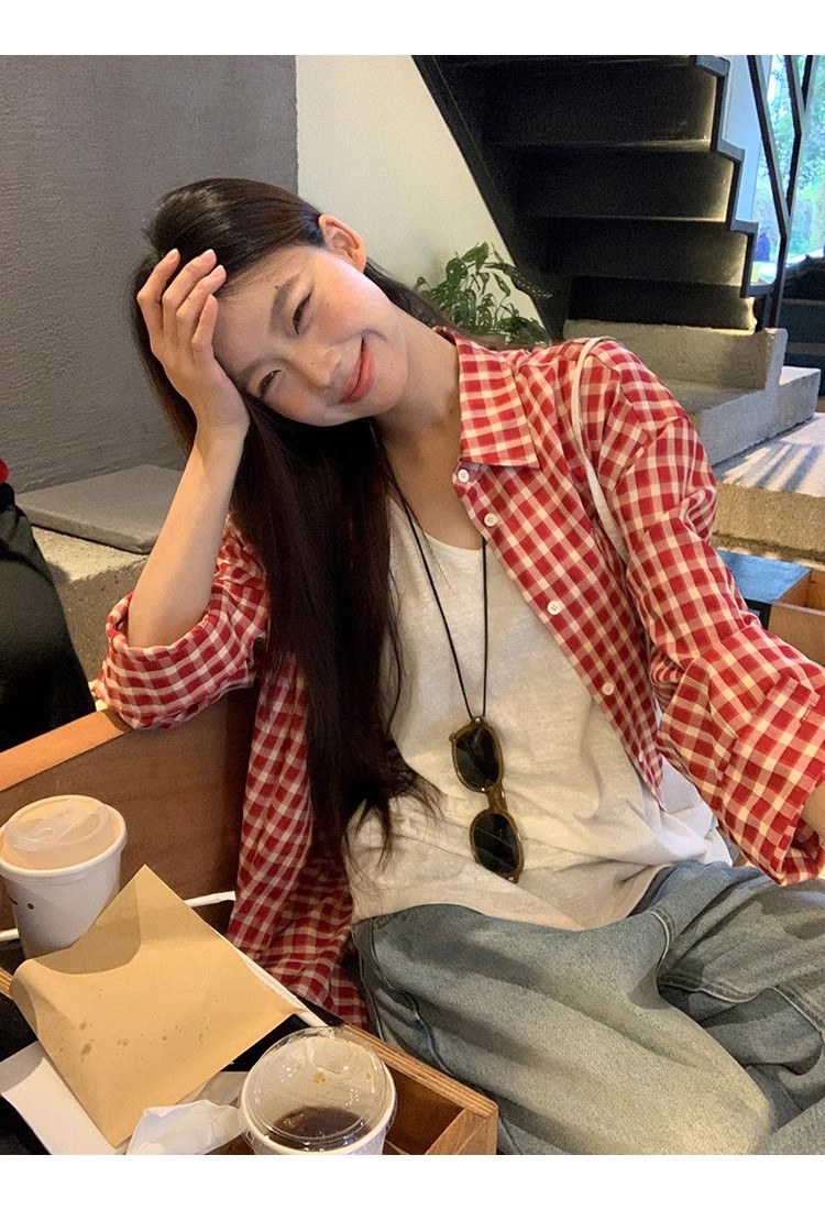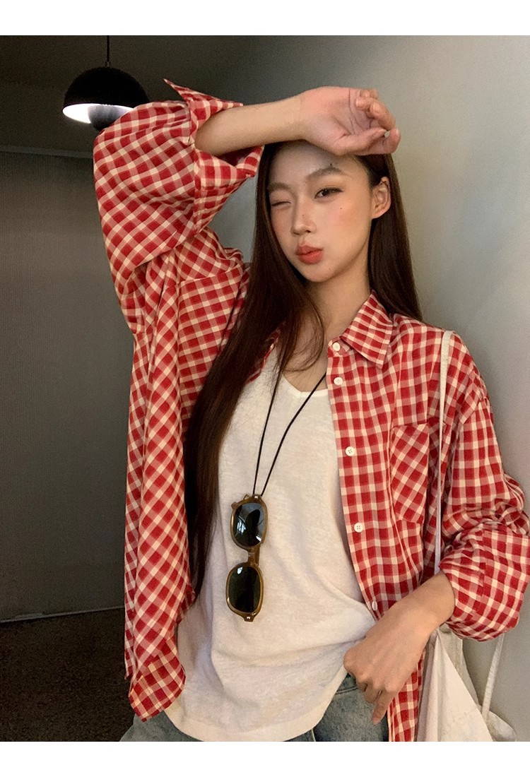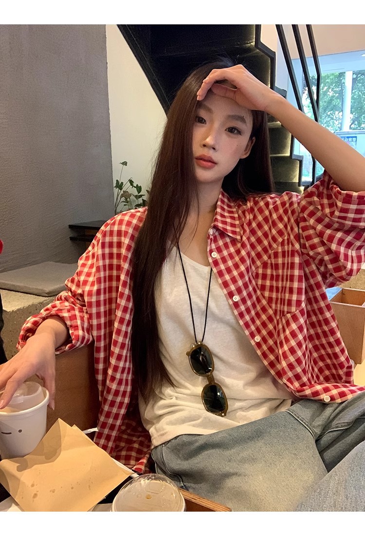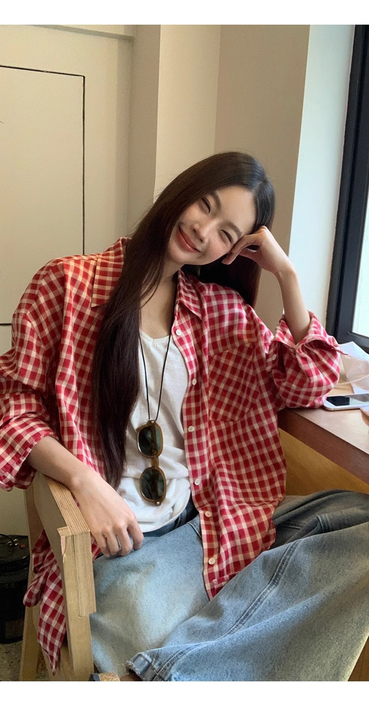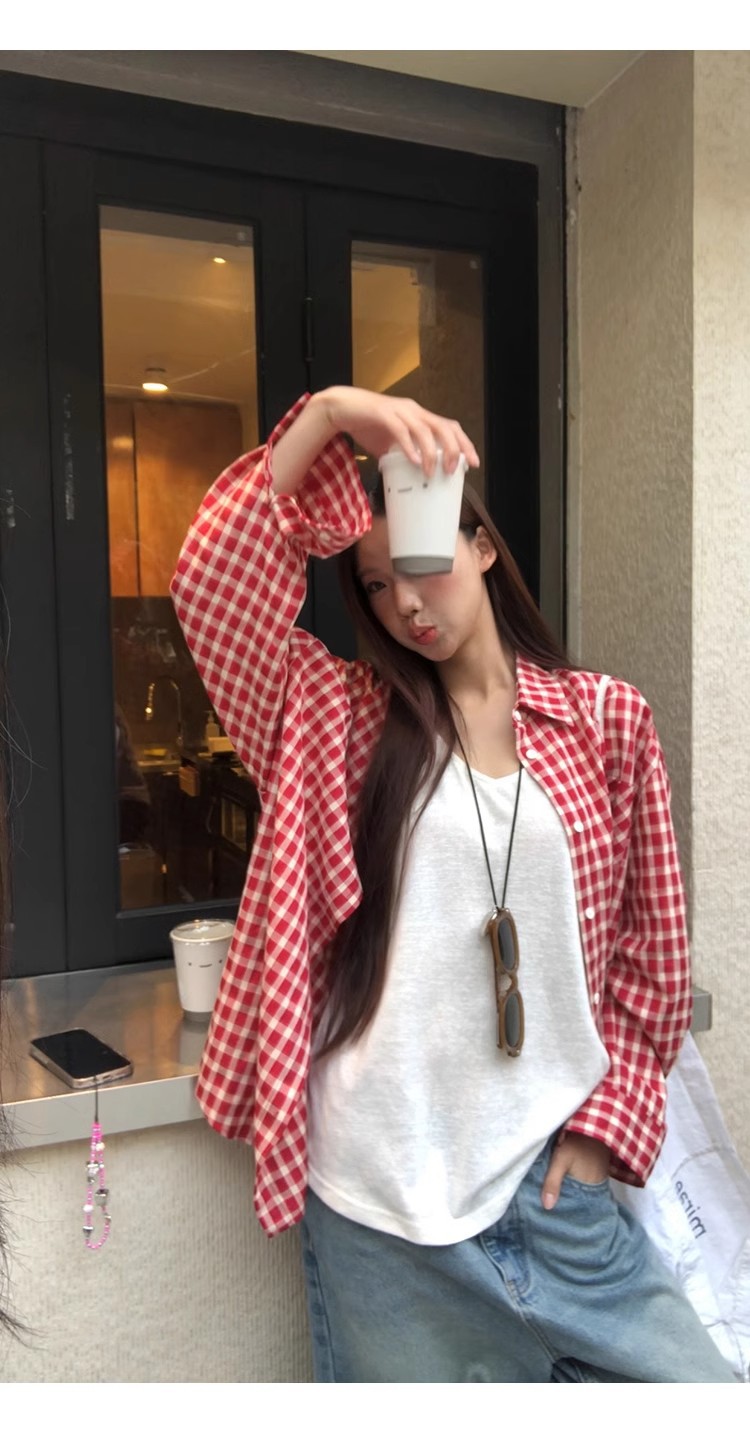 레드 체크 무늬 셔츠 프렌치 카디건 셔츠 여성 봄 여름 신작 긴팔 루즈 다용도 셔츠 탑 재킷스토어 가기