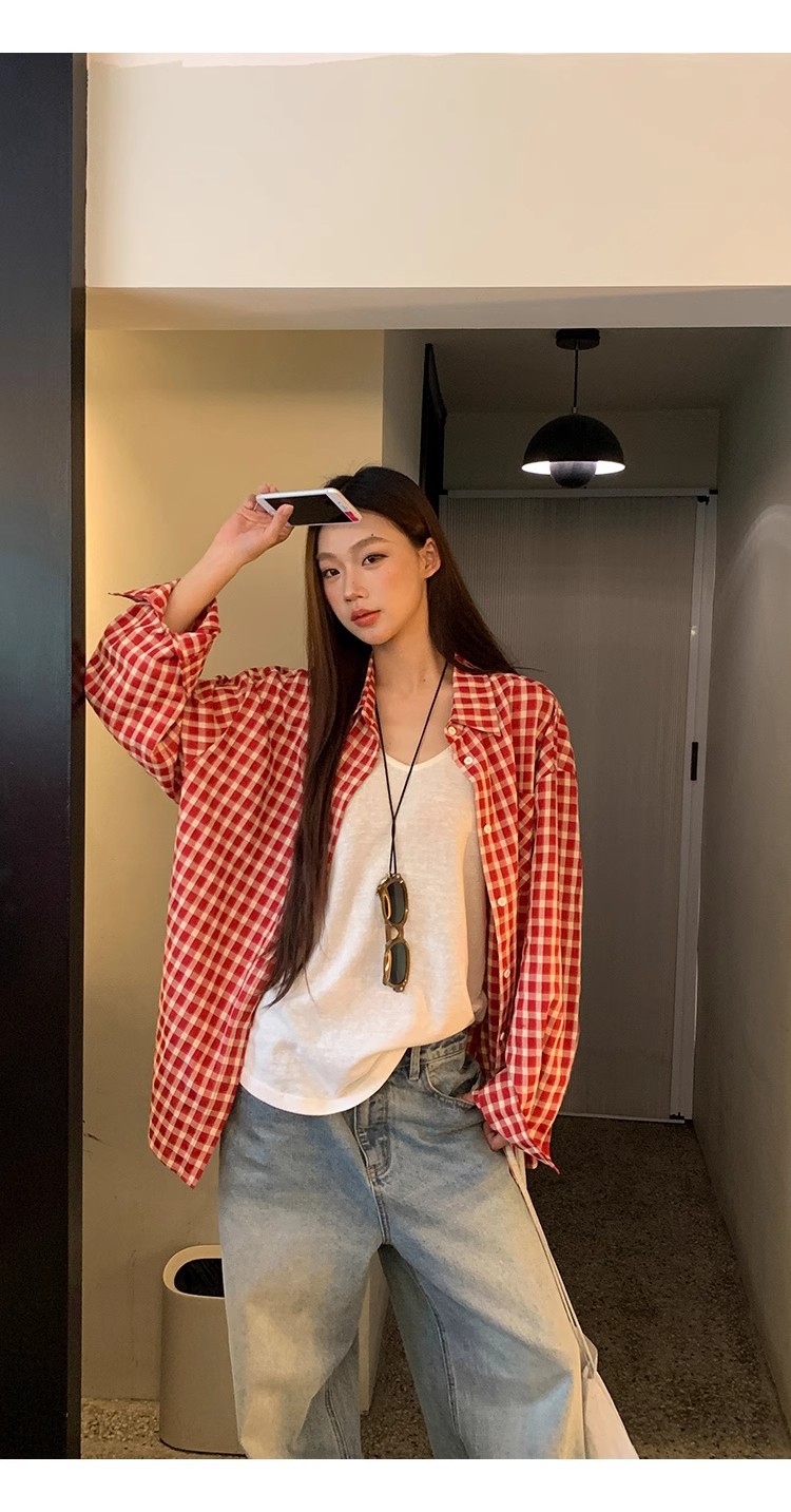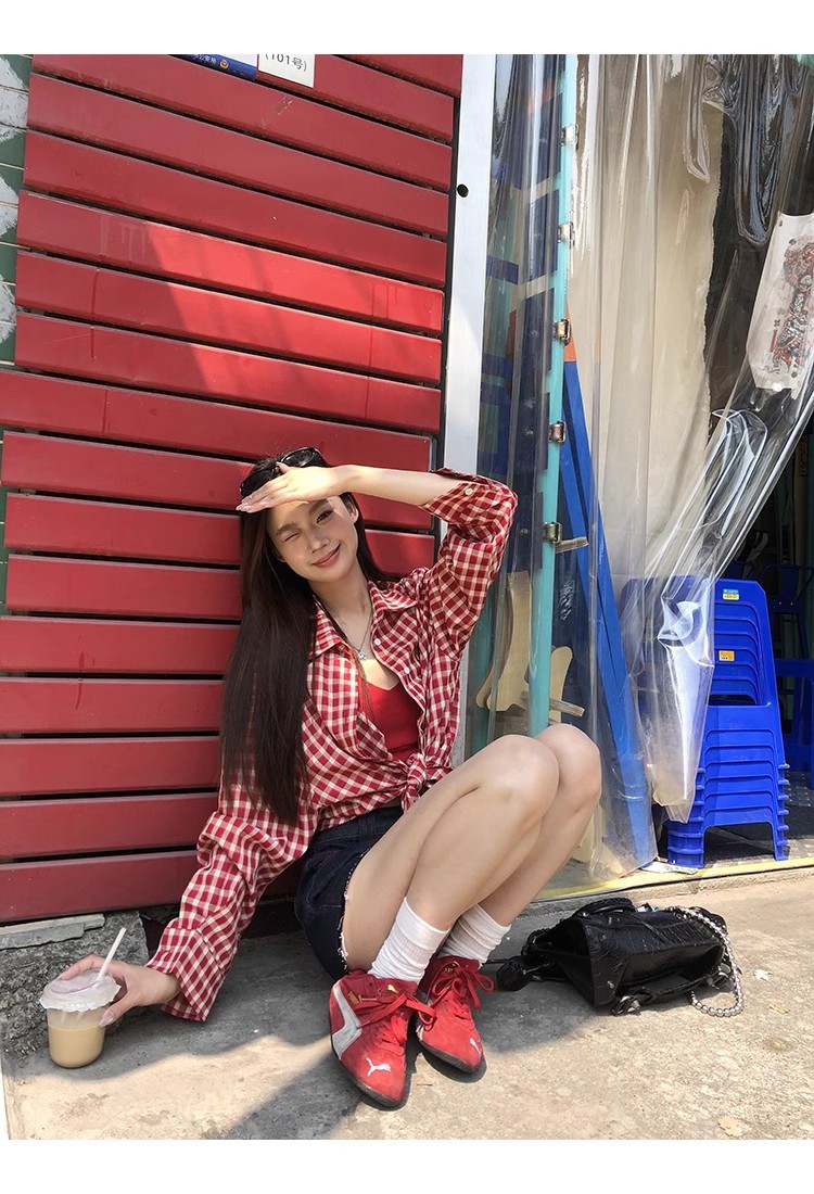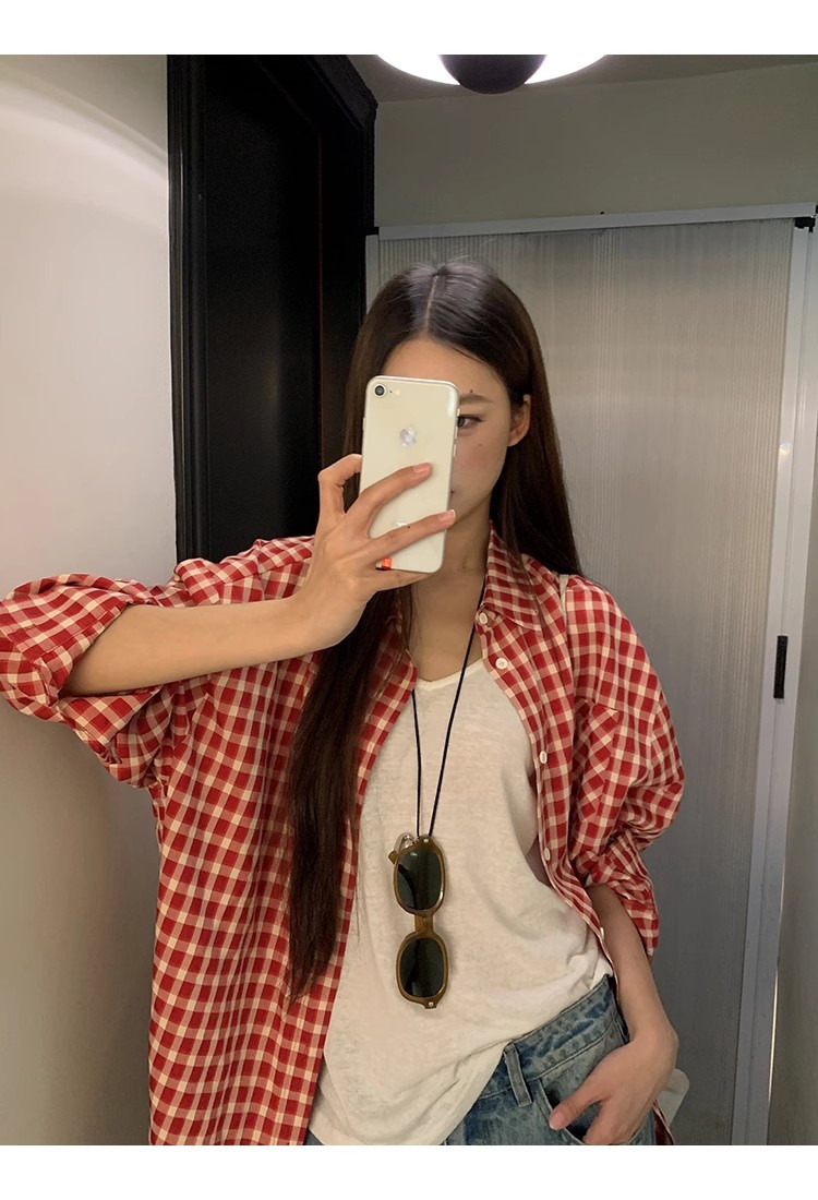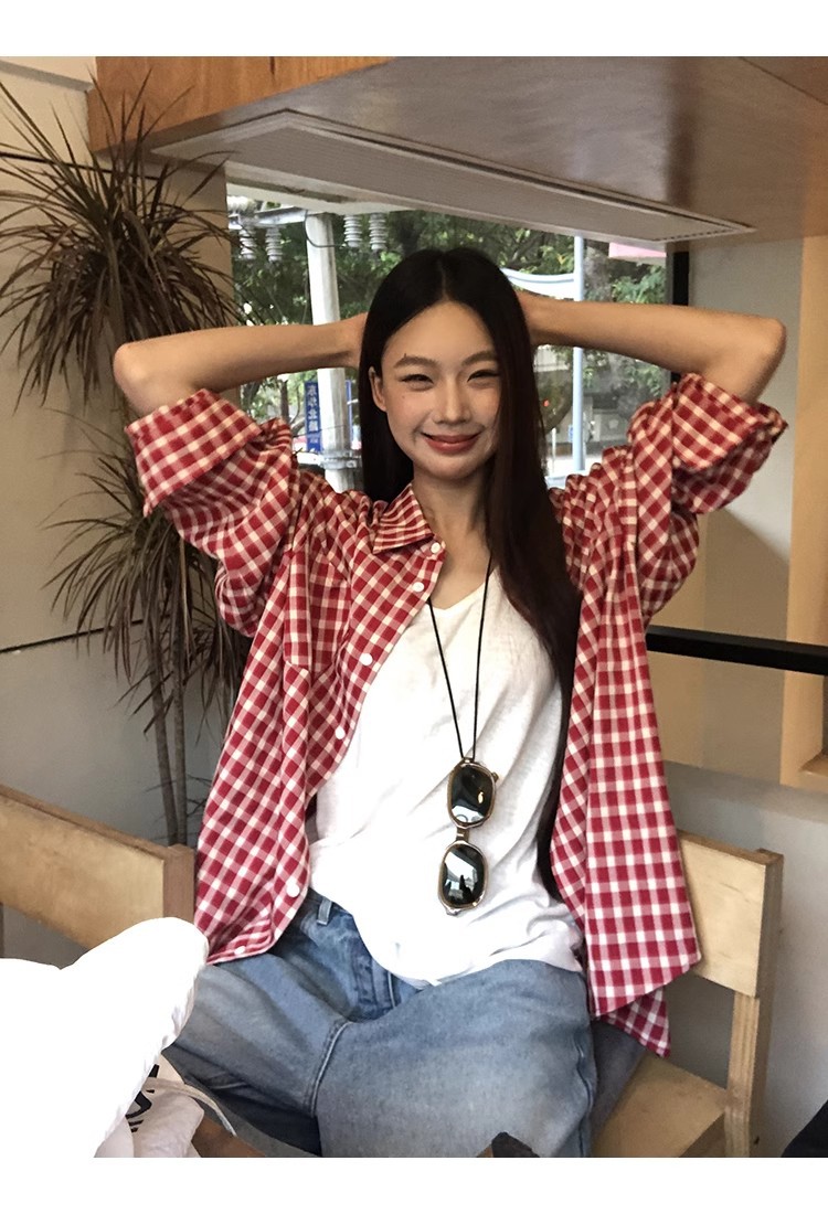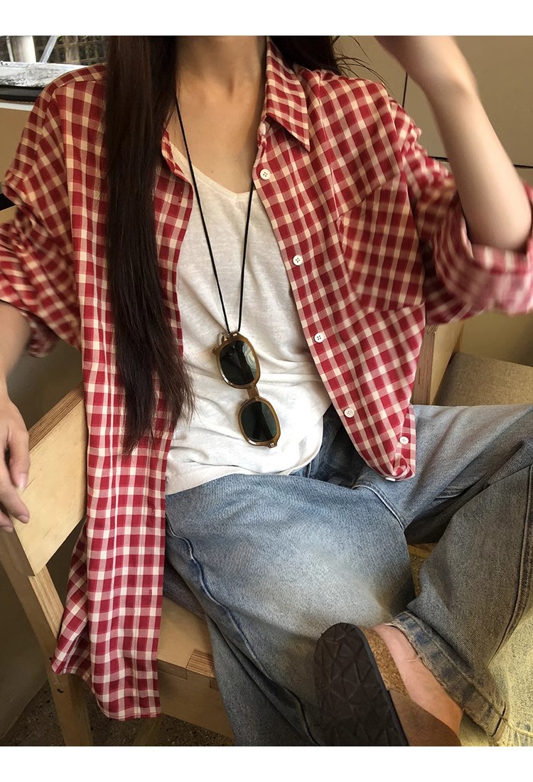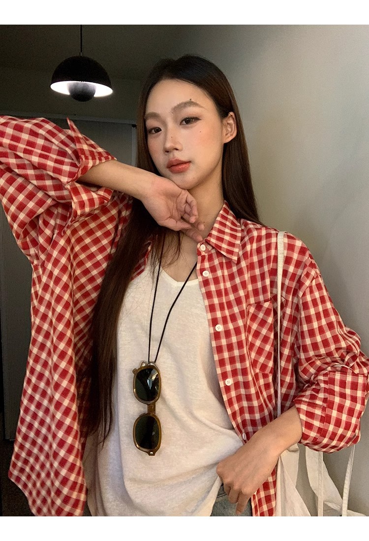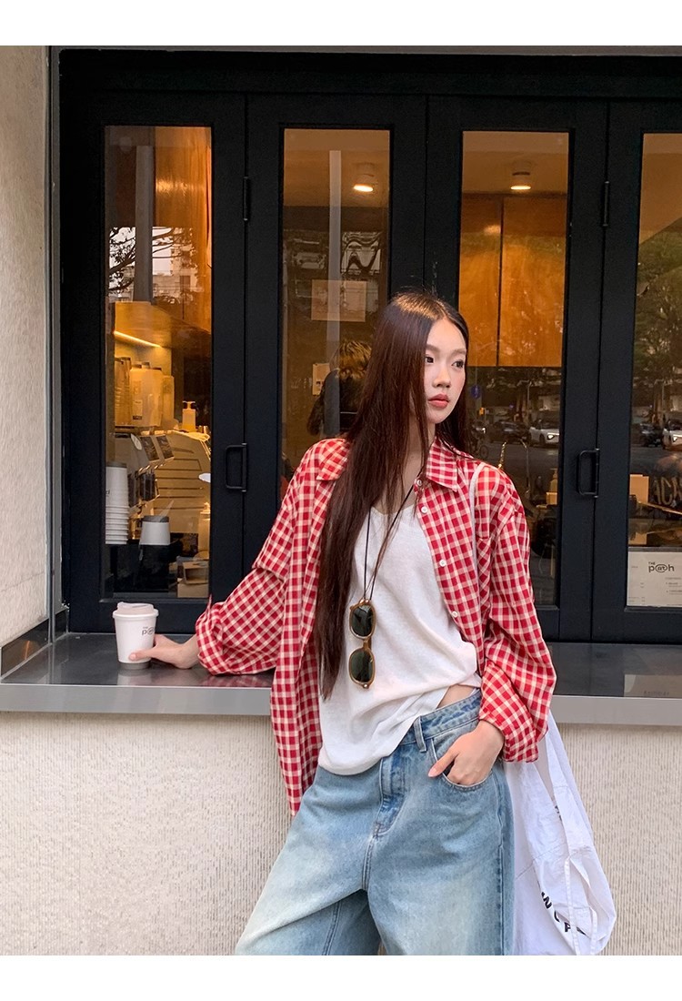레드 체크 무늬 셔츠 프렌치 카디건 셔츠 여성 봄 여름 신작 긴팔 루즈 다용도 셔츠 탑 재킷스토어 가기