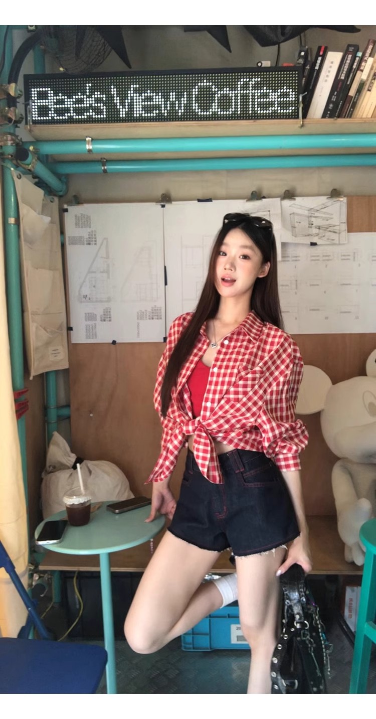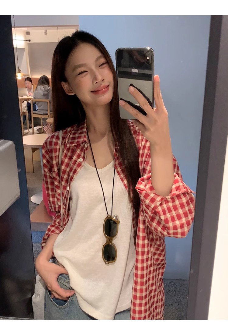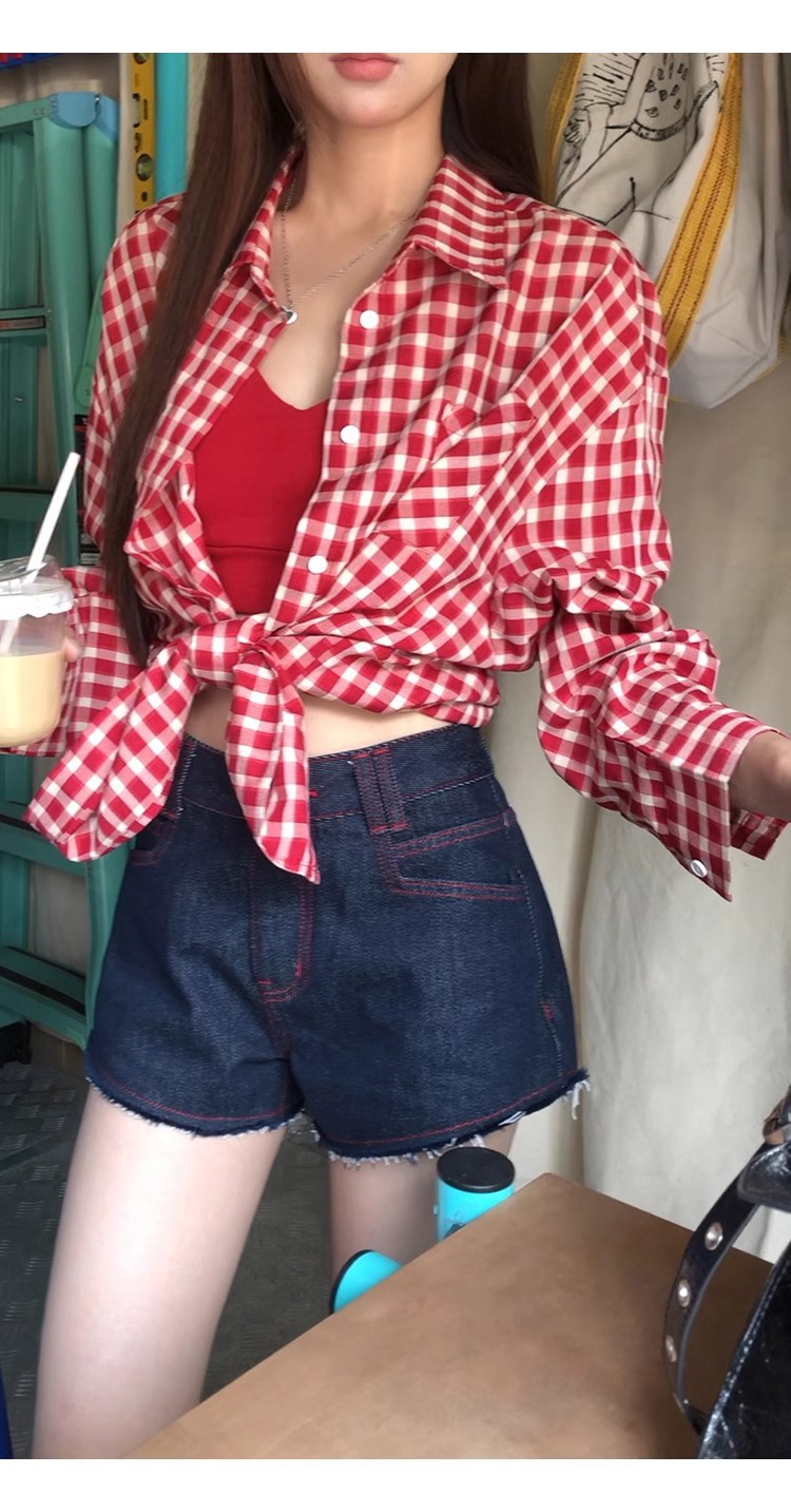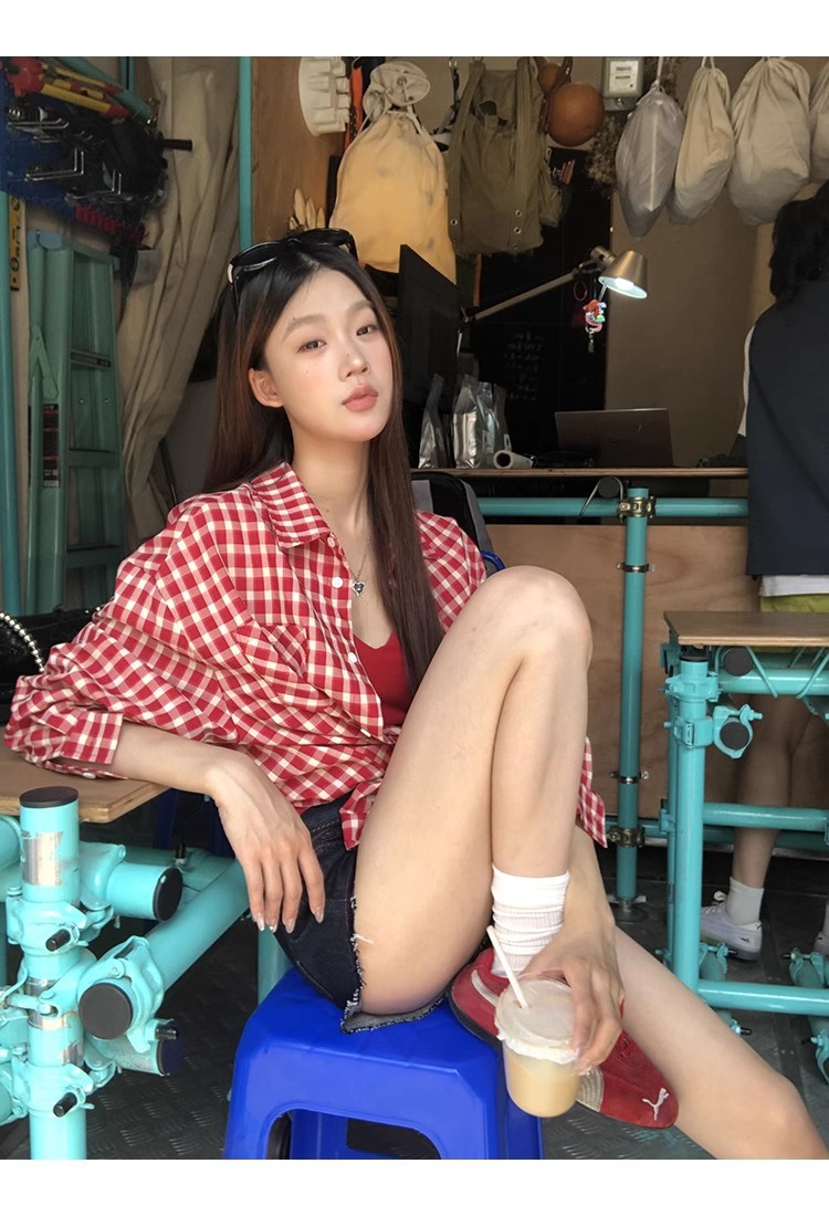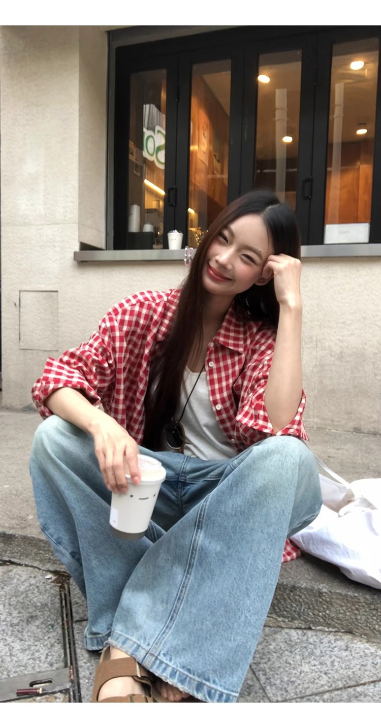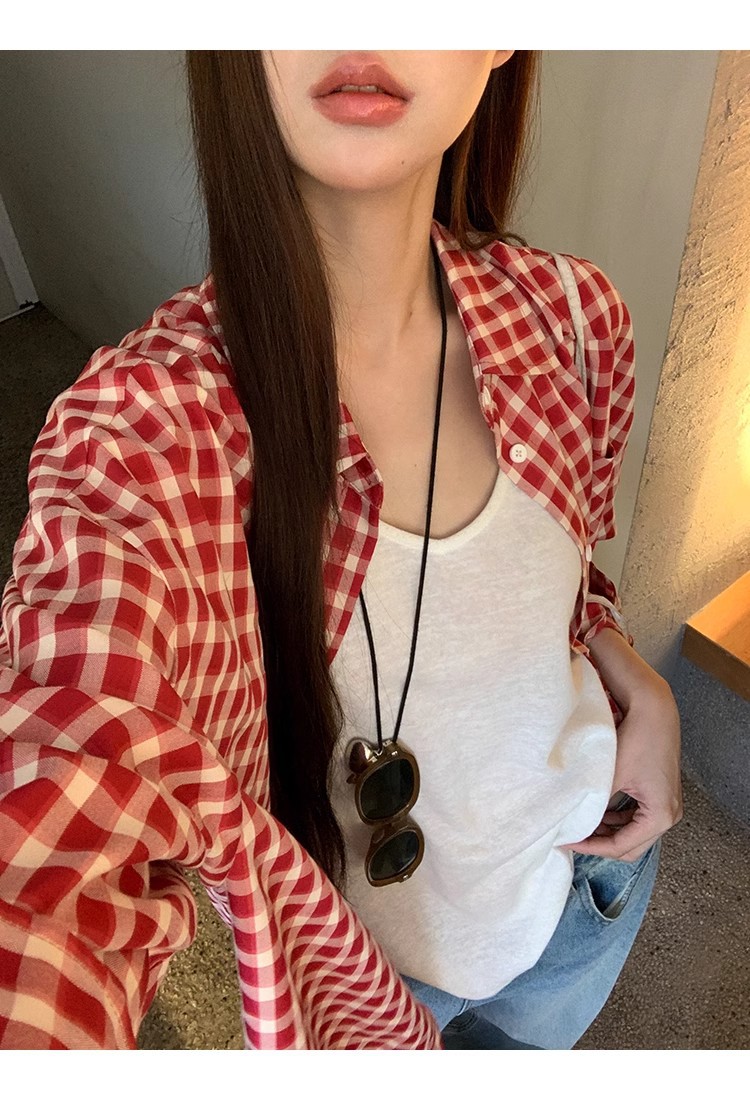 레드 체크 무늬 셔츠 프렌치 카디건 셔츠 여성 봄 여름 신작 긴팔 루즈 다용도 셔츠 탑 재킷스토어 가기
