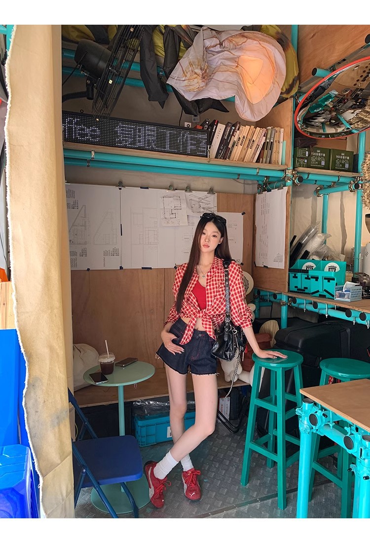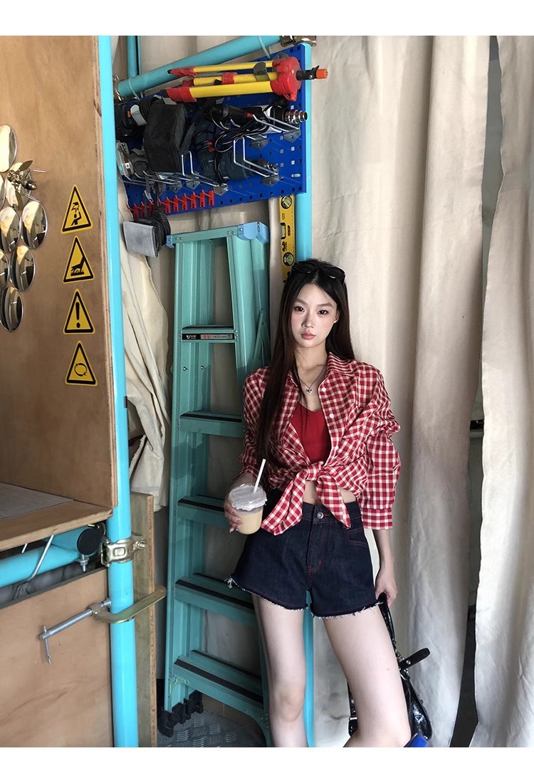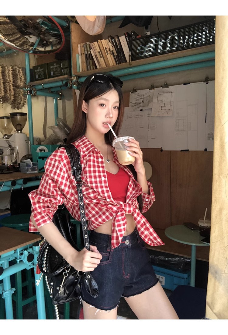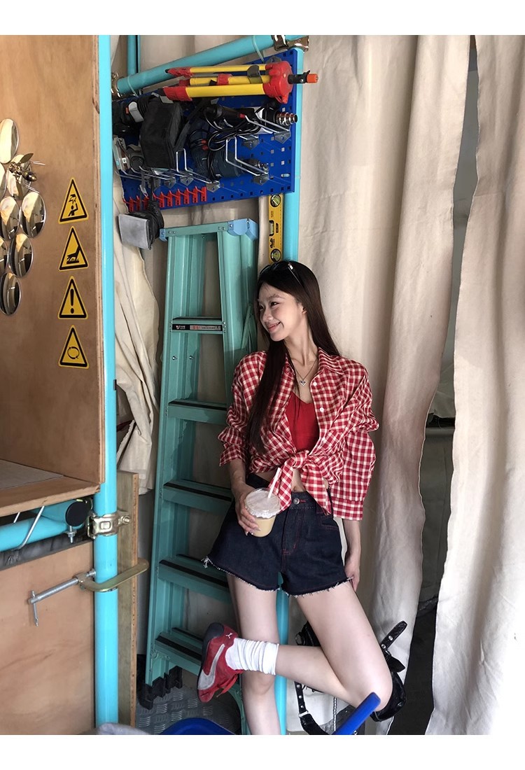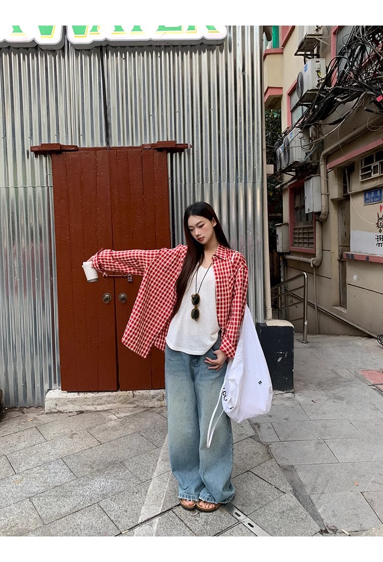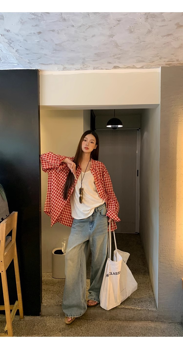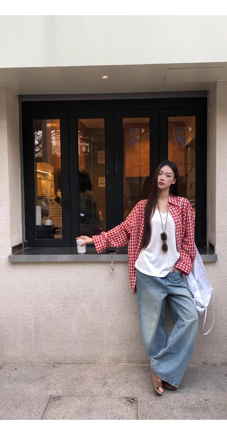 레드 체크 무늬 셔츠 프렌치 카디건 셔츠 여성 봄 여름 신작 긴팔 루즈 다용도 셔츠 탑 재킷스토어 가기