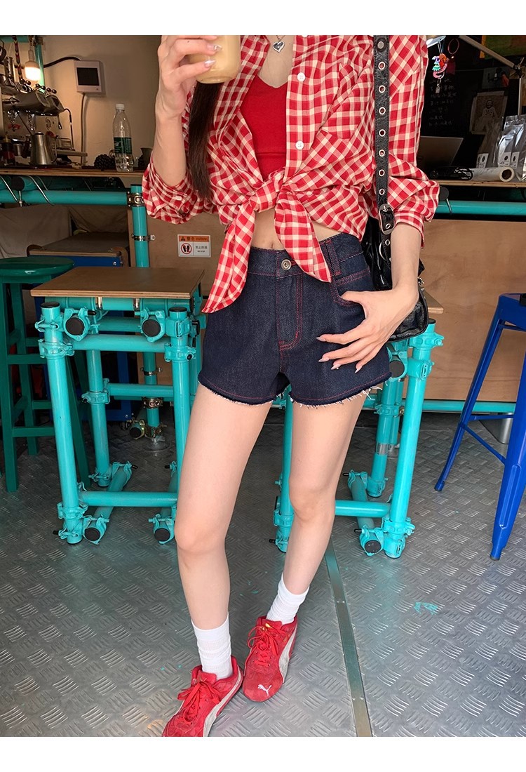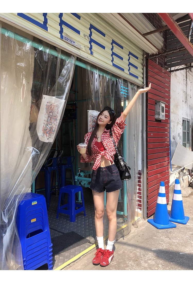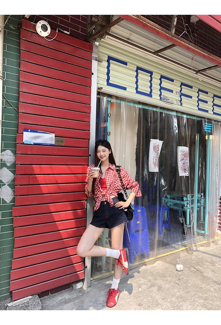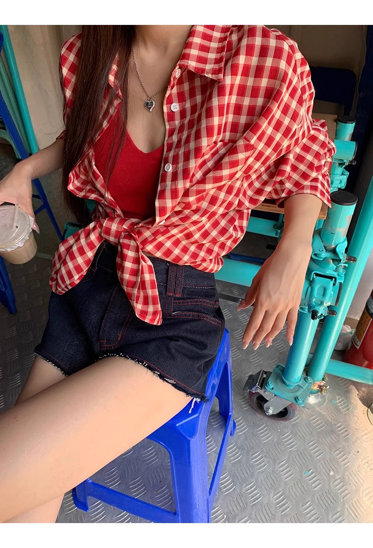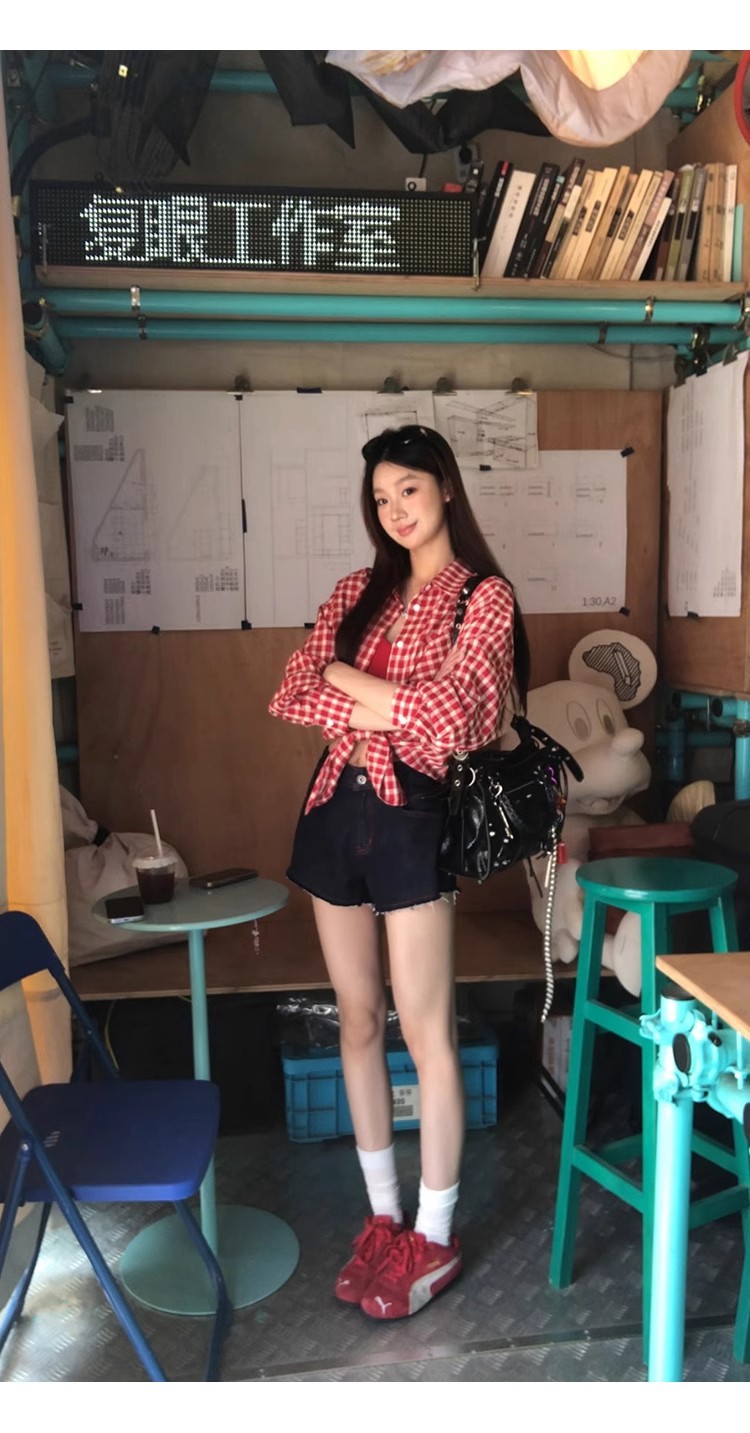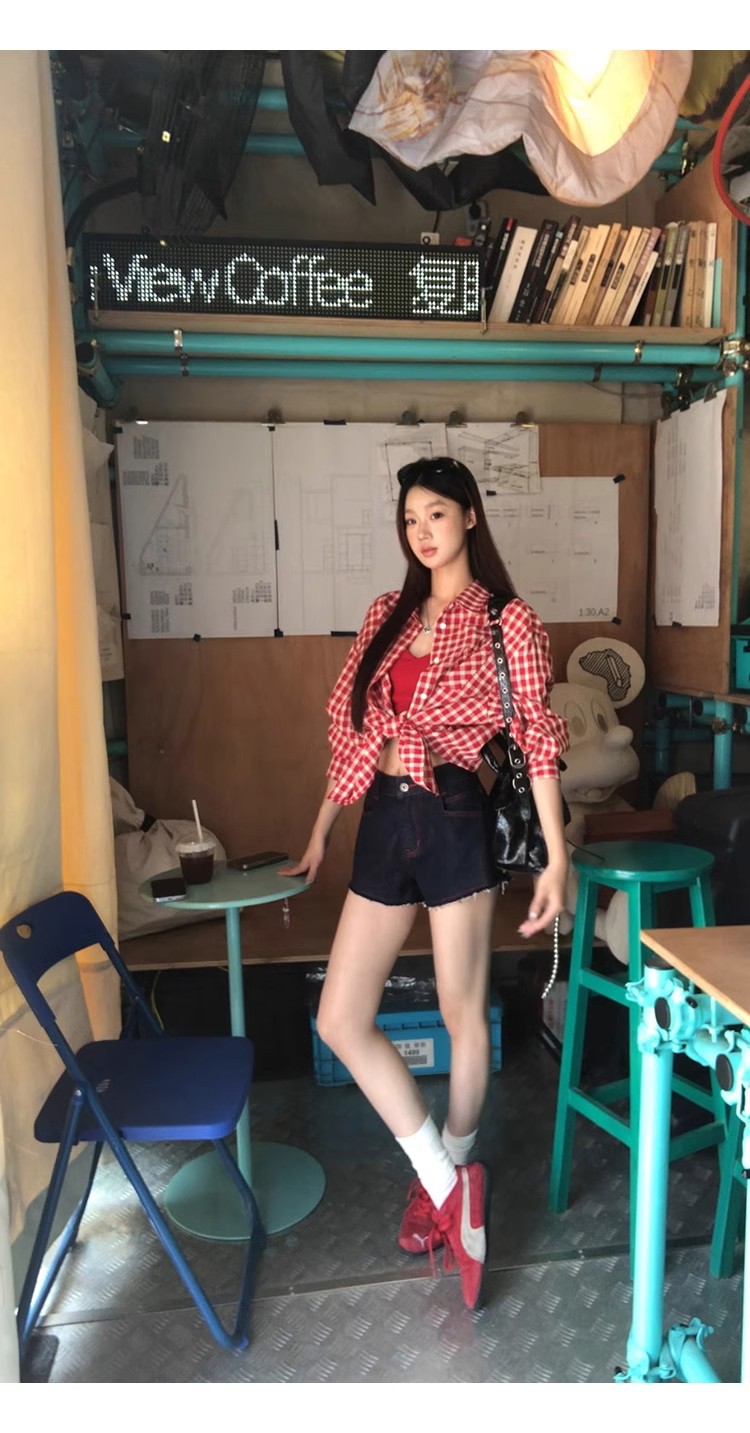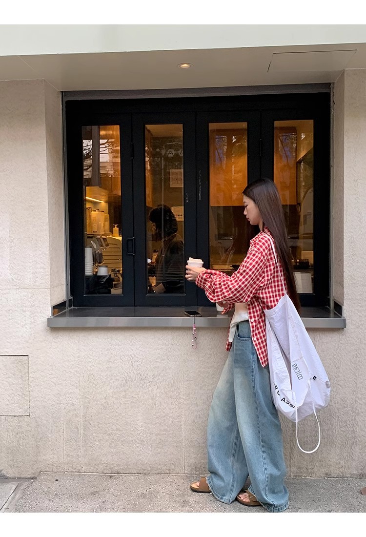 레드 체크 무늬 셔츠 프렌치 카디건 셔츠 여성 봄 여름 신작 긴팔 루즈 다용도 셔츠 탑 재킷스토어 가기