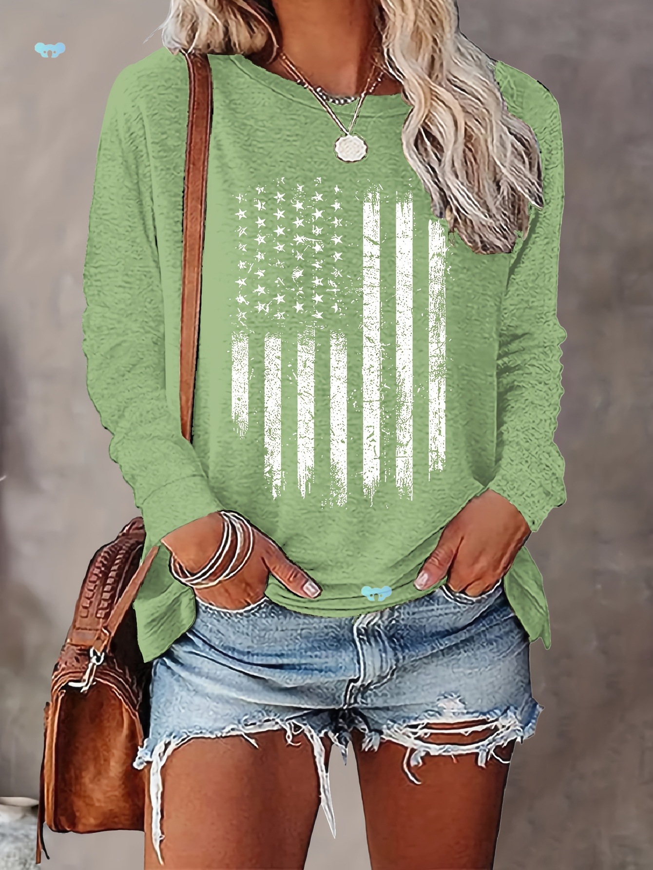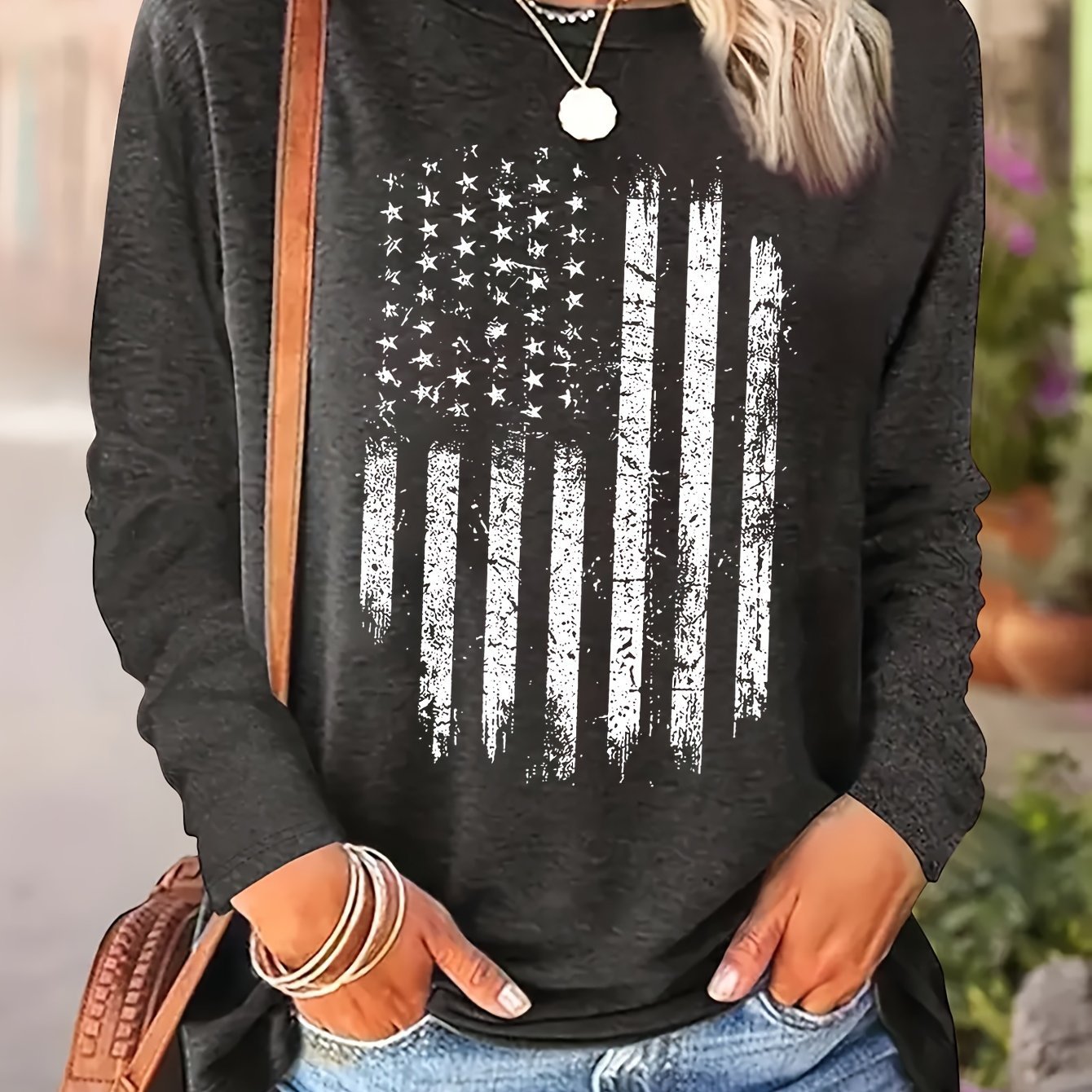 여성 캐주얼 긴팔 크루넥 티셔츠 with American
