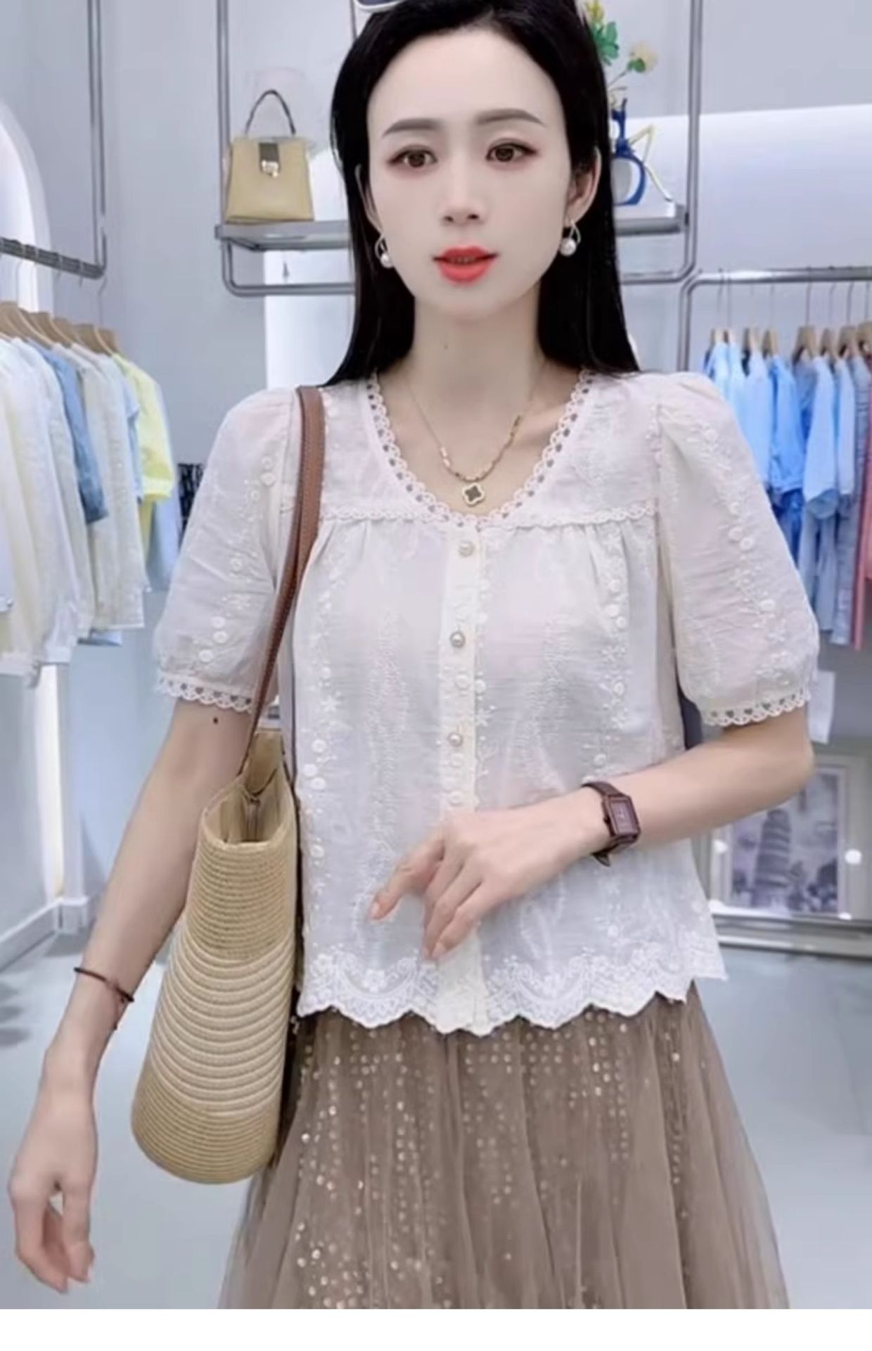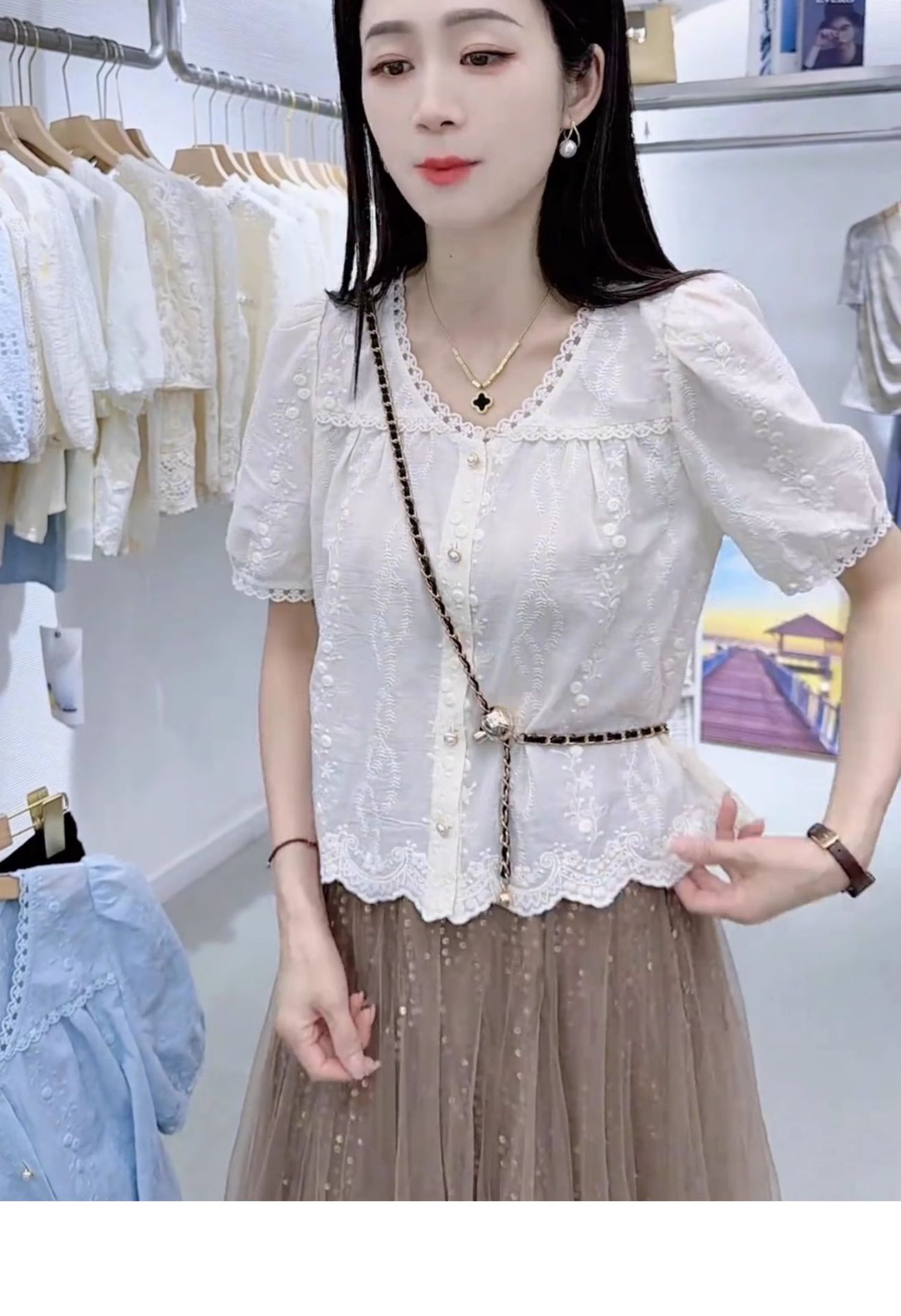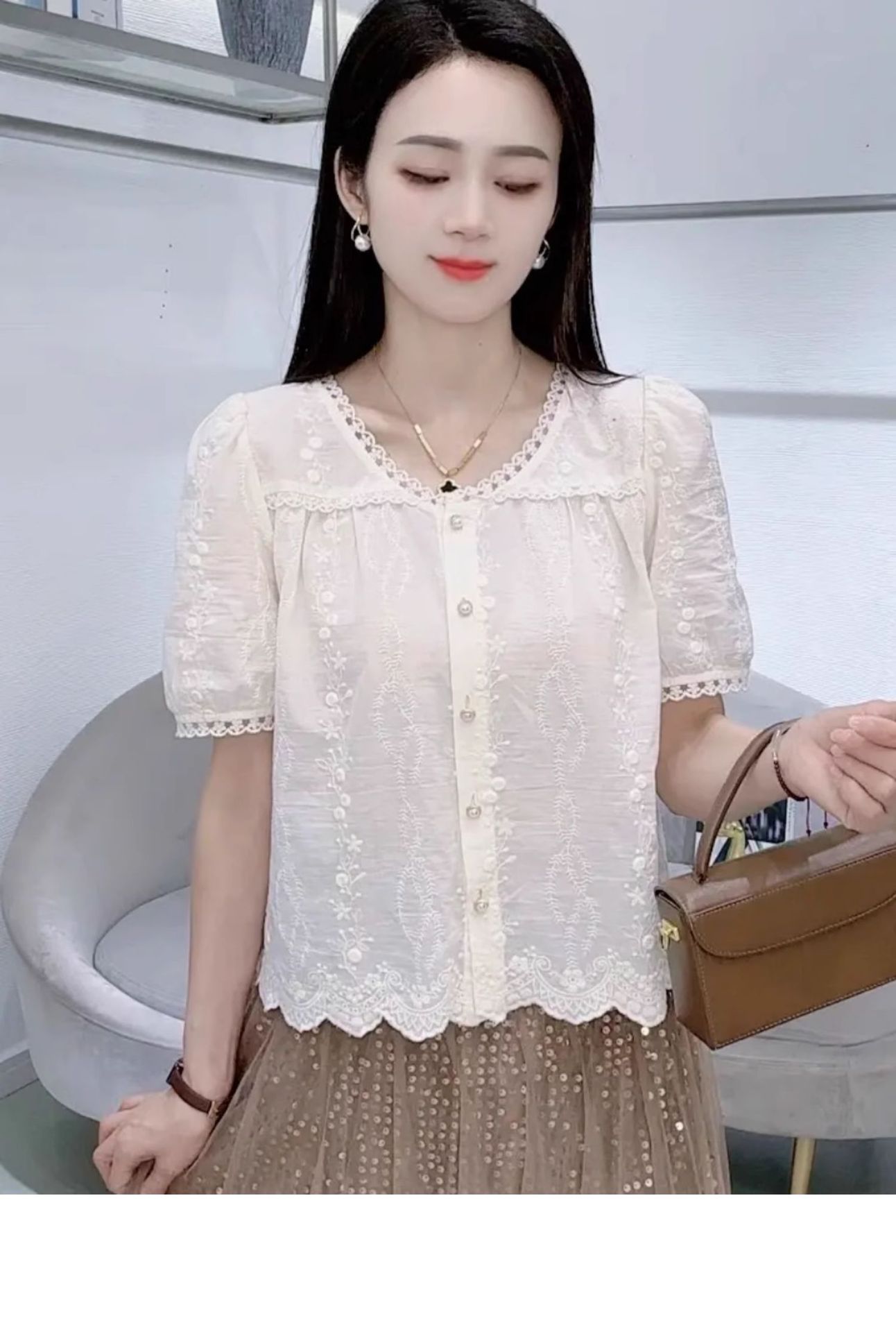 프랑스 스타일 서양식 디자인 센스 짧은 소매 셔츠 여성의 2025 여름 얇은 유행 연령 감소 달콤한 셔츠 작은 셔츠 탑