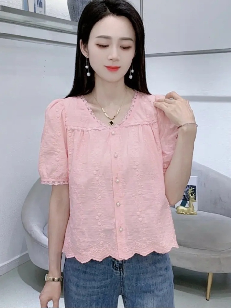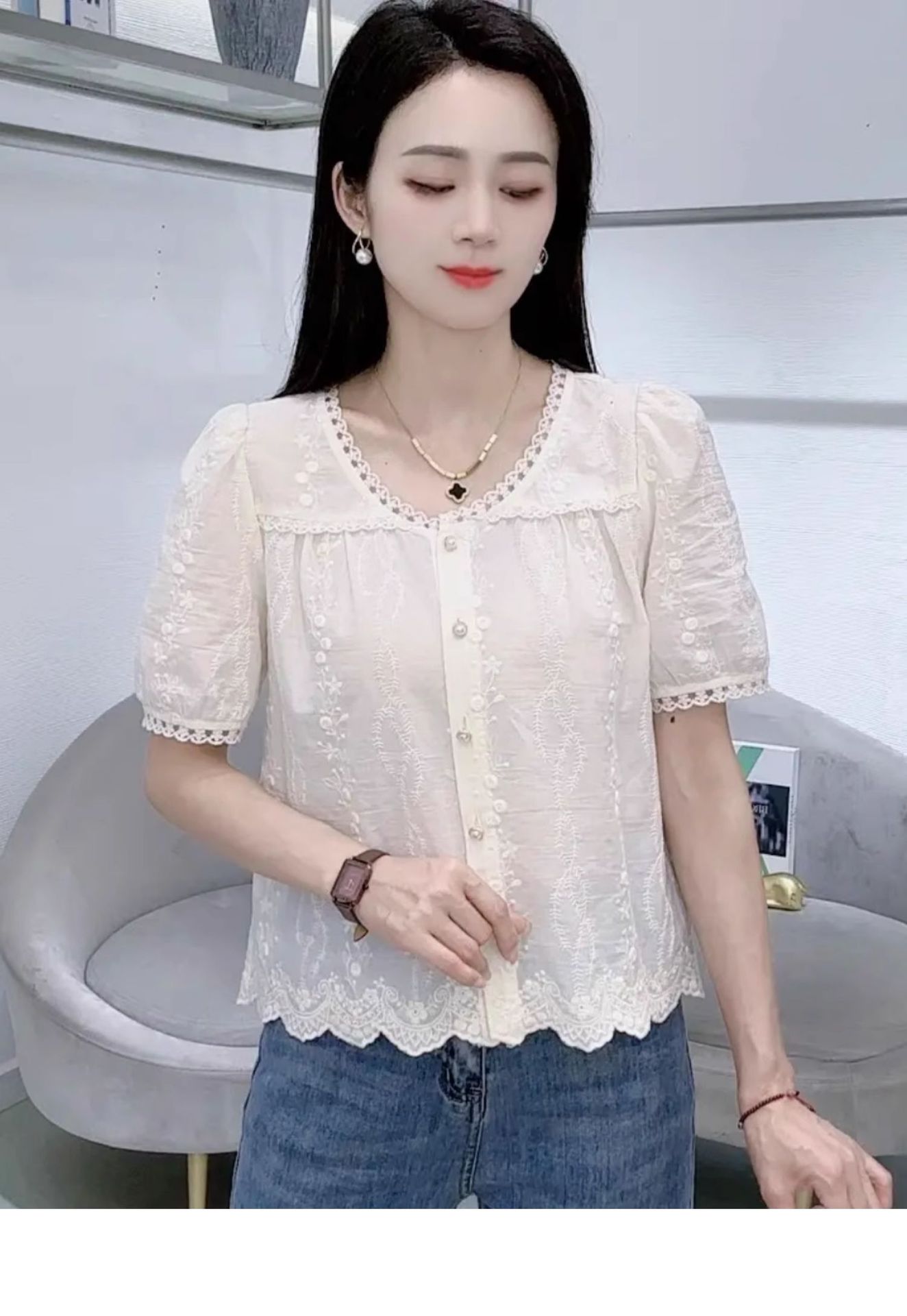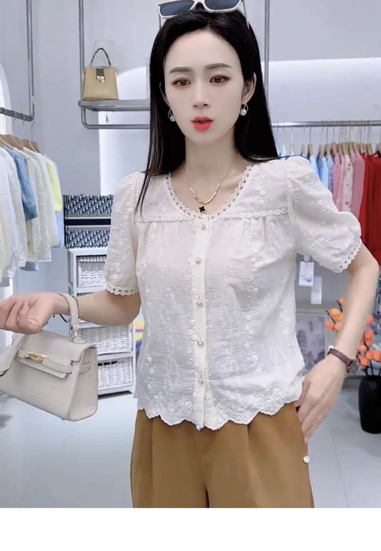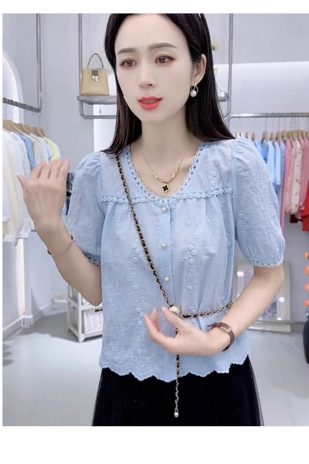 프랑스 스타일 서양식 디자인 센스 짧은 소매 셔츠 여성의 2025 여름 얇은 유행 연령 감소 달콤한 셔츠 작은 셔츠 탑