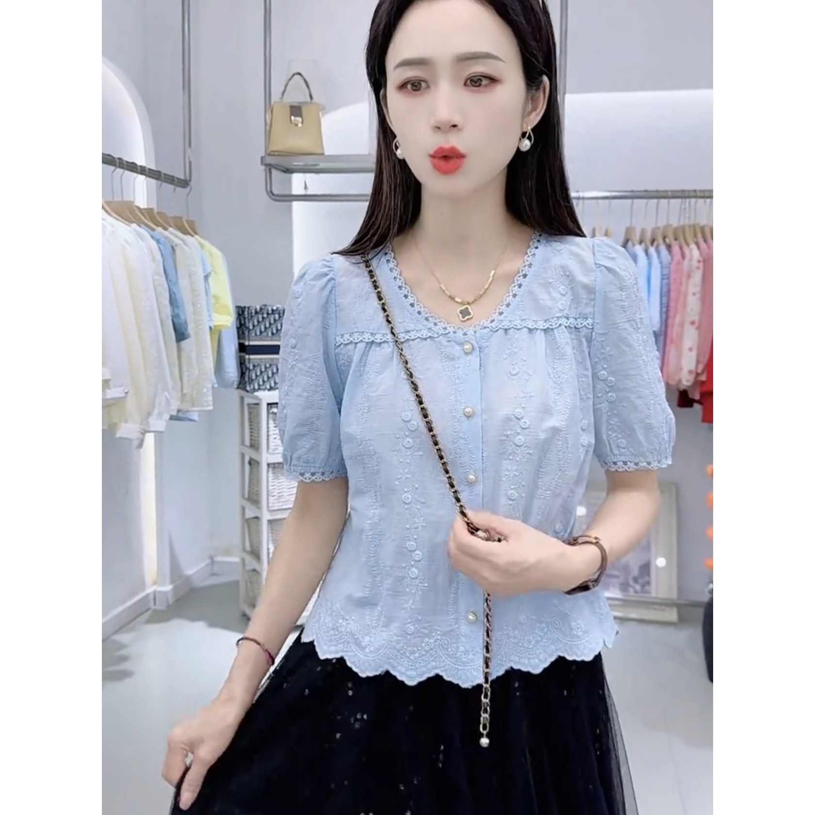 프랑스 스타일 서양식 디자인 센스 짧은 소매 셔츠 여성의 2025 여름 얇은 유행 연령 감소 달콤한 셔츠 작은 셔츠 탑스토어 가기