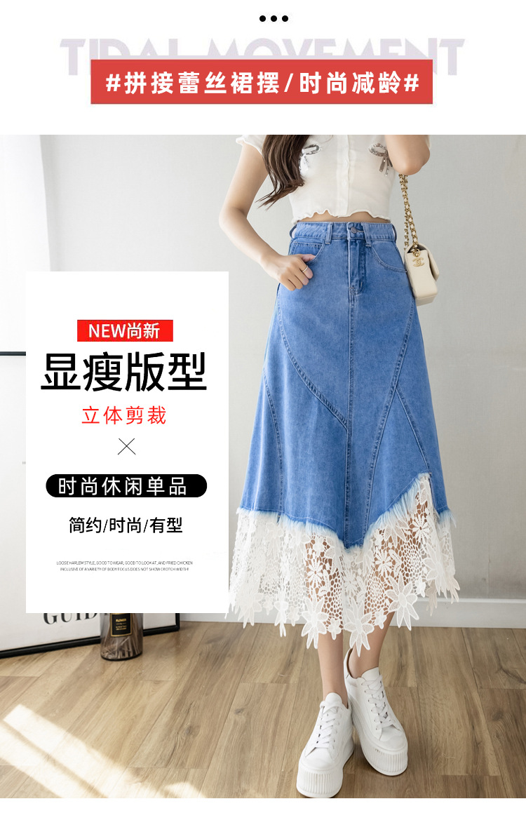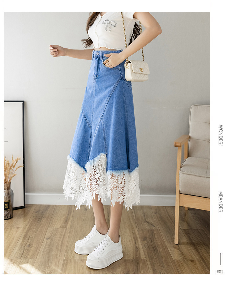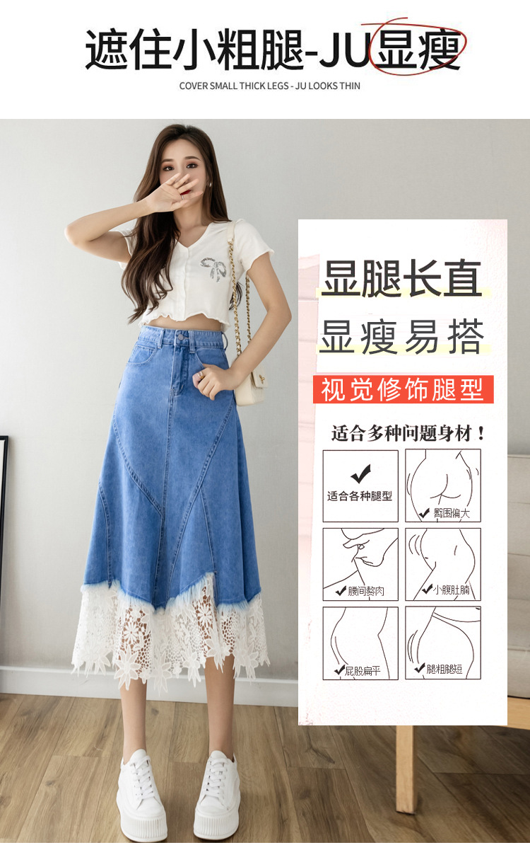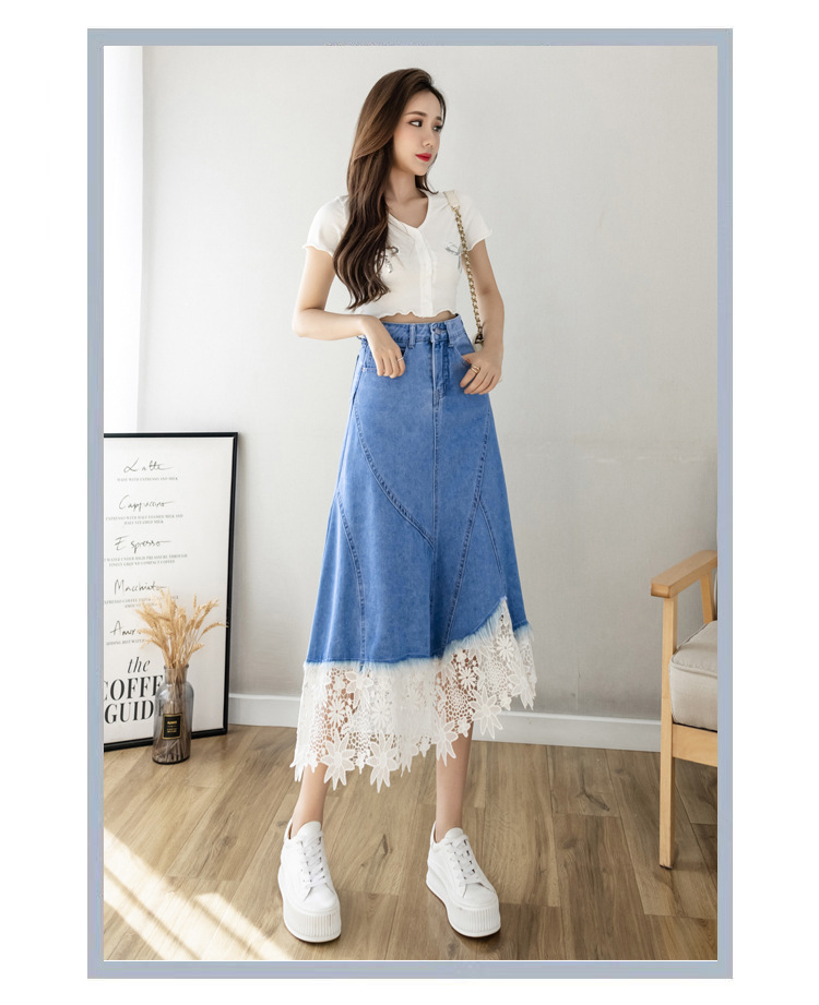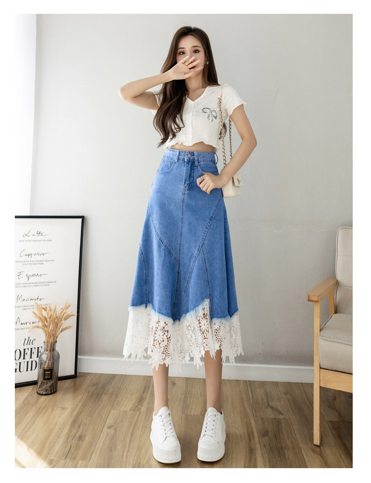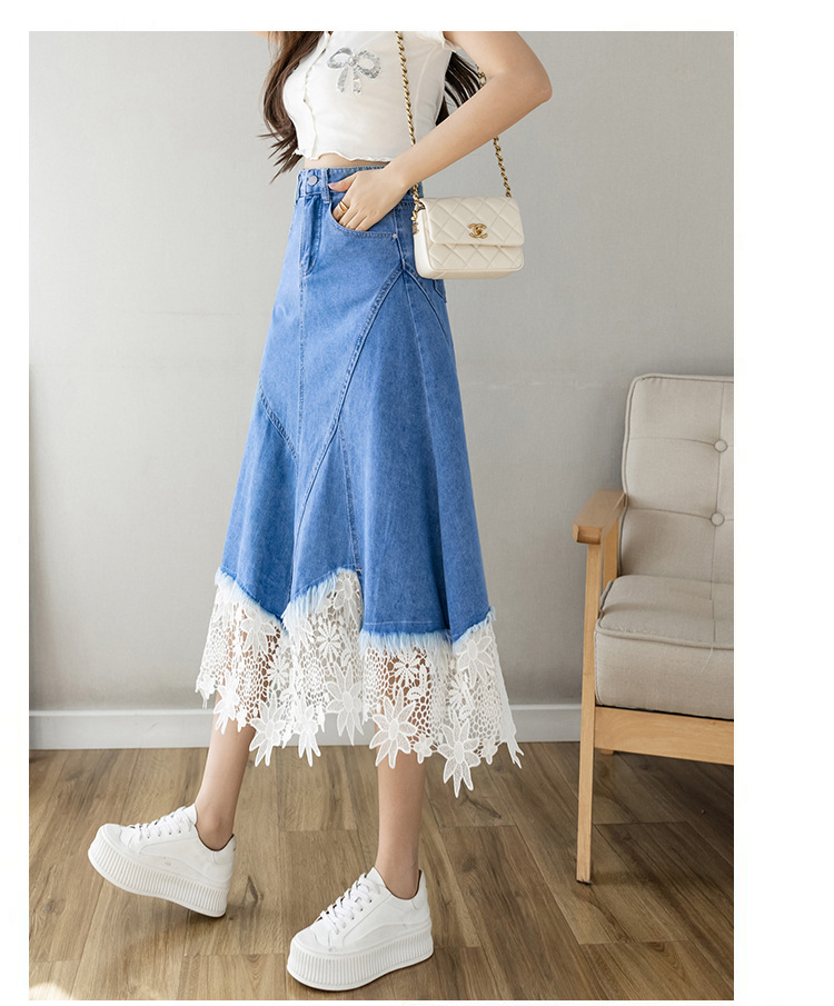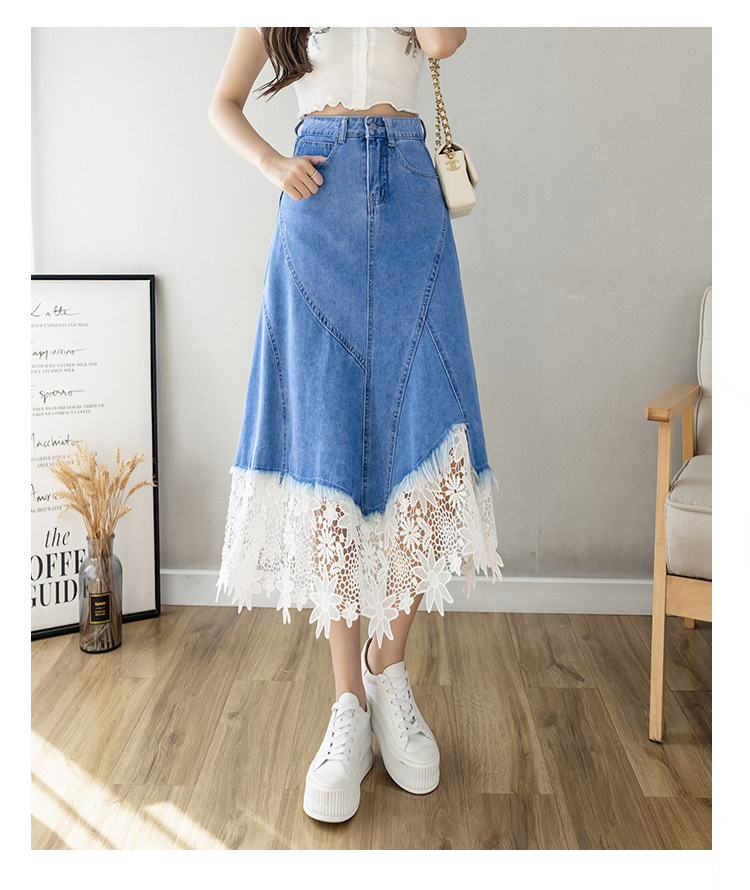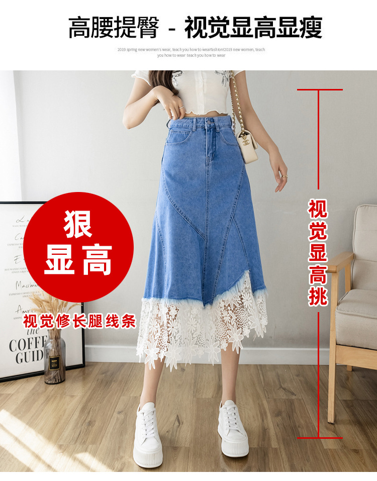 리얼 샷 데님 스커트 여자 A 라인 하이 웨이스트 봄 2025 새로운 레이스 서양식 중장 우산 스커트스토어 가기