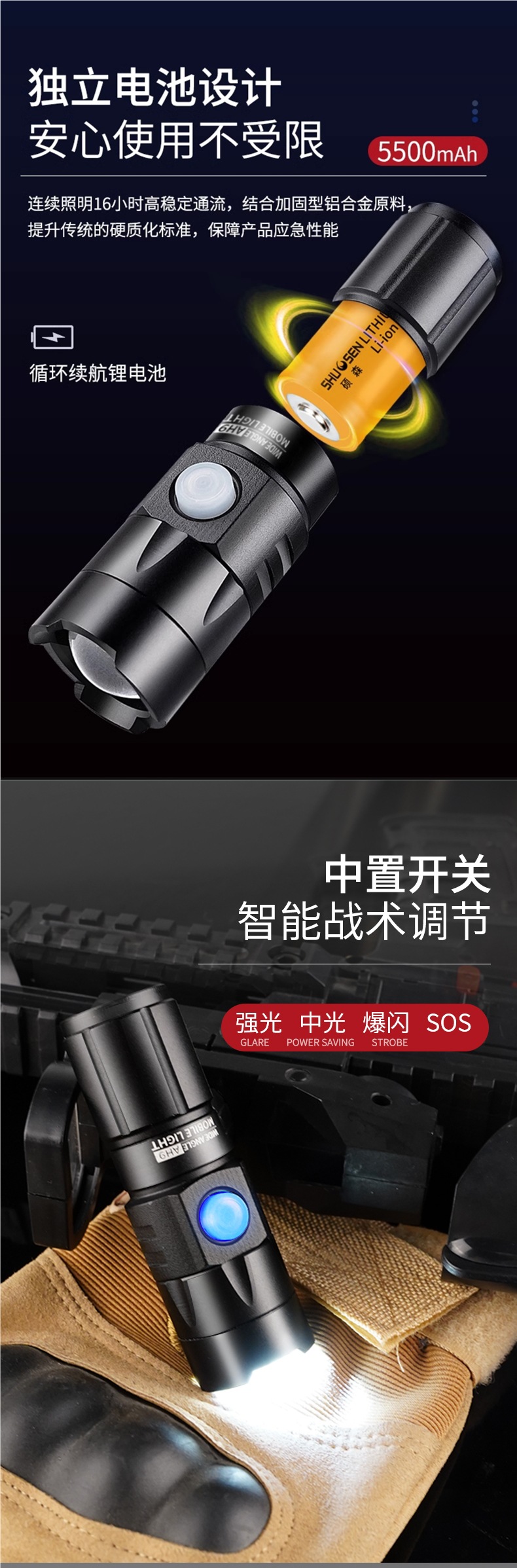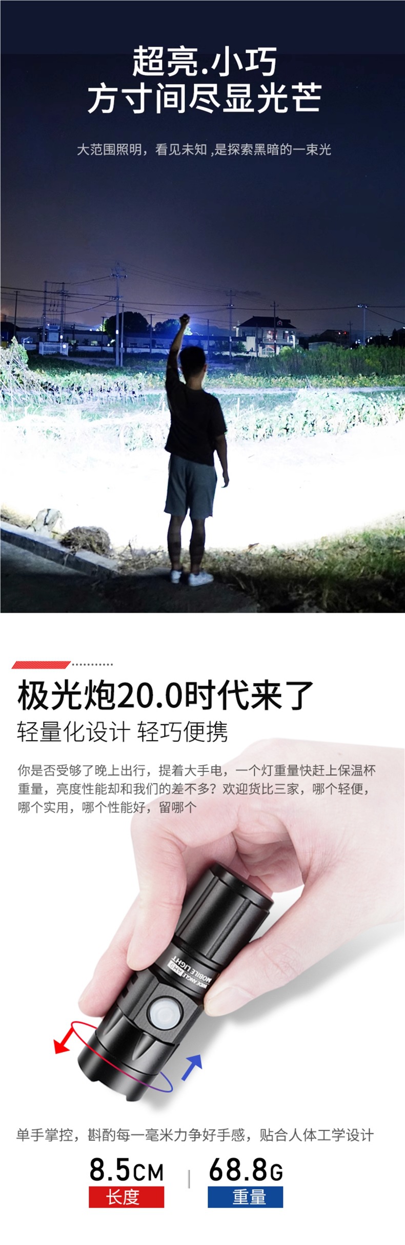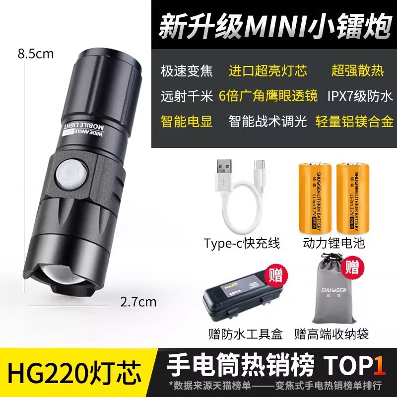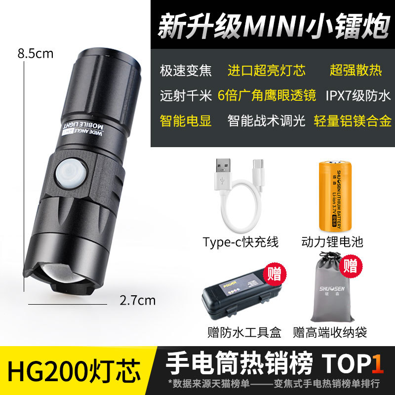 강한 가벼운 손전등 미니 슈퍼 밝은 야외 홈 줌 충전식 장거리 소형 휴대용 전술 배터리