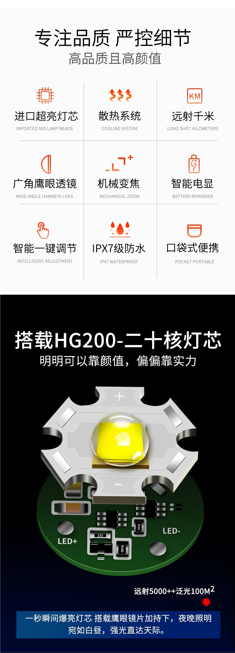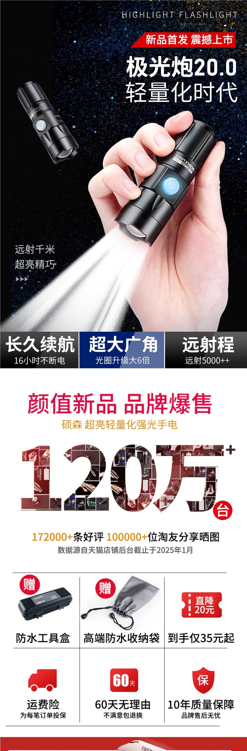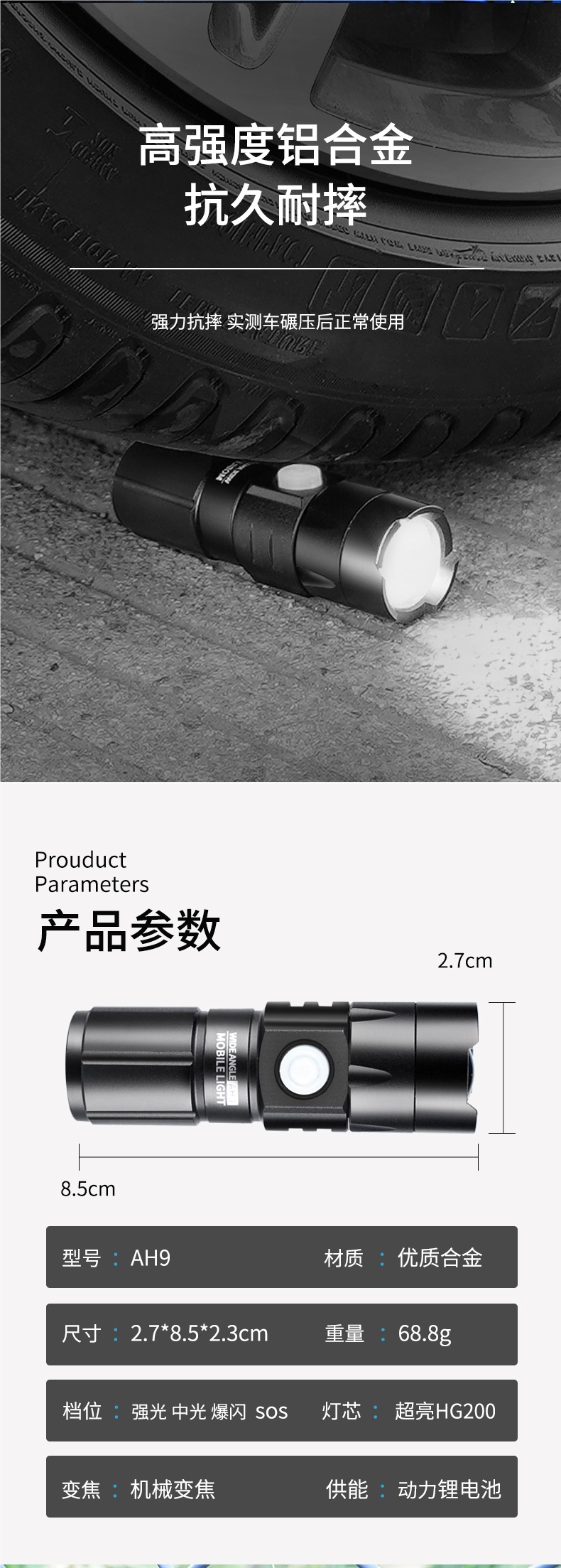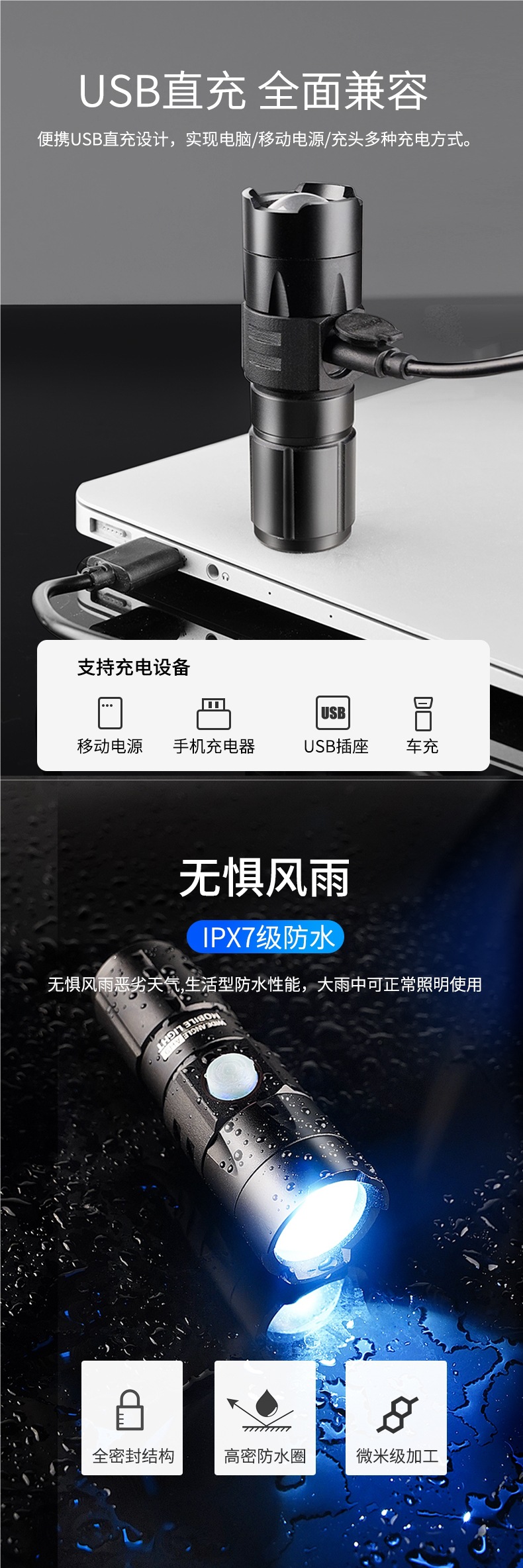 강한 가벼운 손전등 미니 슈퍼 밝은 야외 홈 줌 충전식 장거리 소형 휴대용 전술 배터리