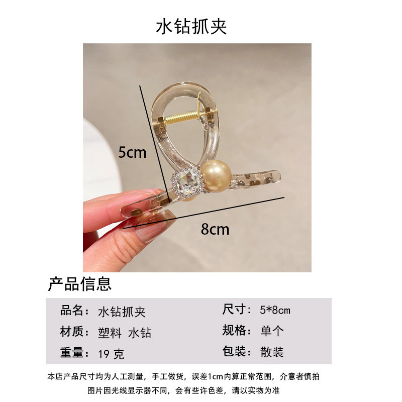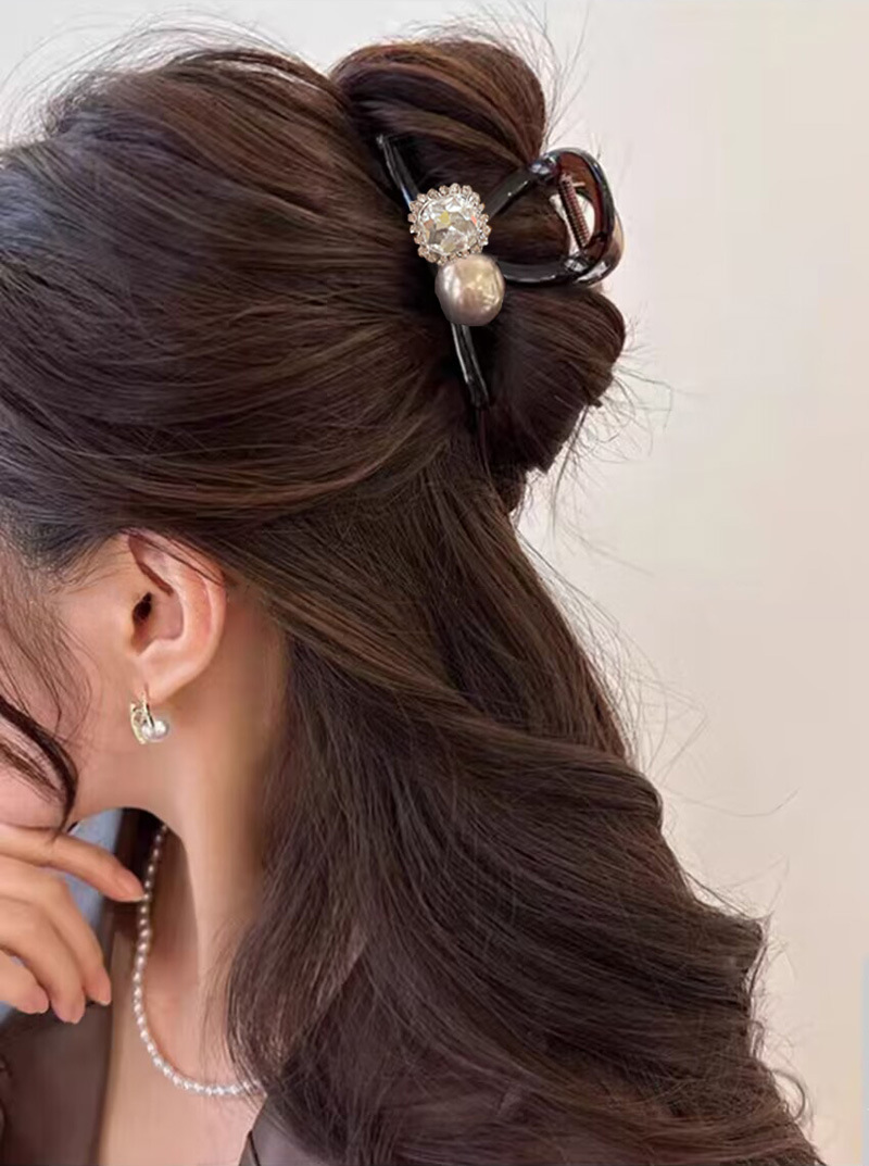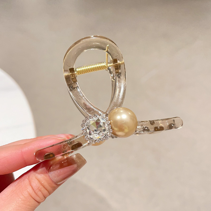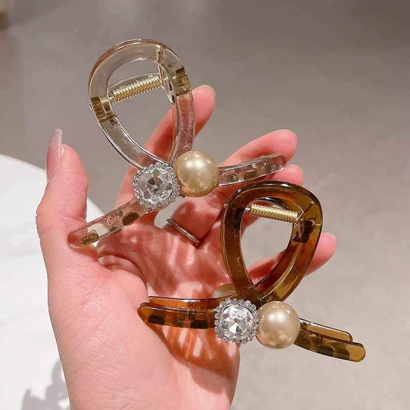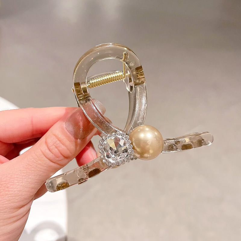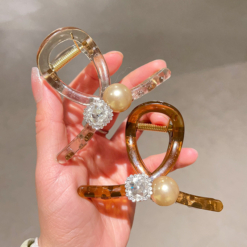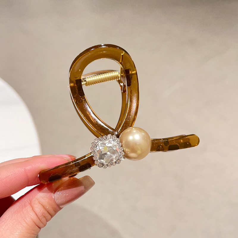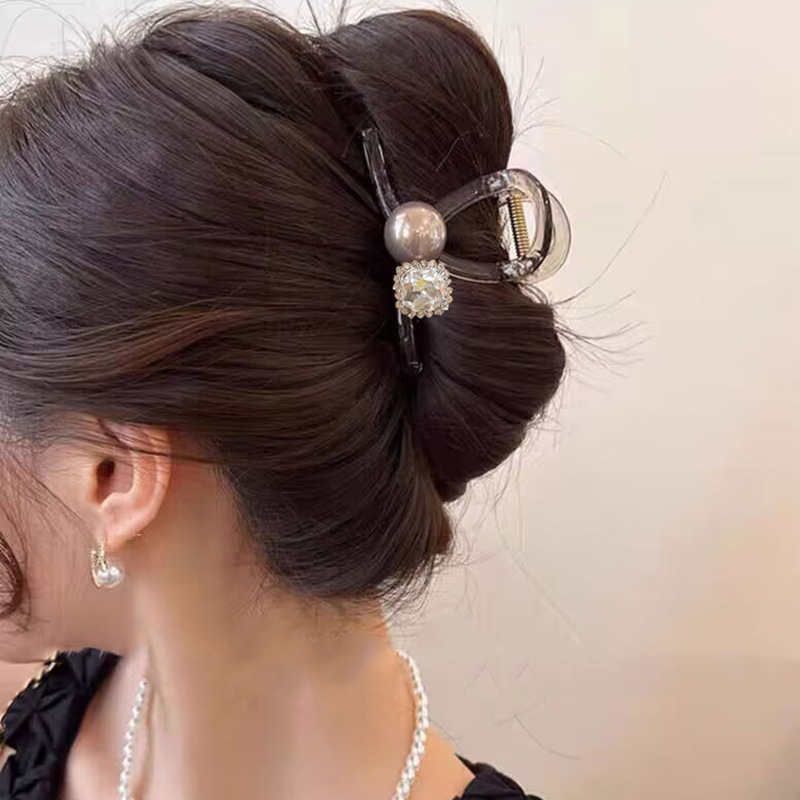 轻奢高级感咖色珍珠水钻抓夹女后脑勺盘发鲨鱼夹大号发夹头饰发卡