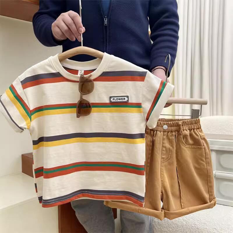 코튼 어린이 스트라이프 반팔 여름 소년 소녀 자수 티셔츠 한국 스타일 다목적 짧은 T 패션 탑 도매